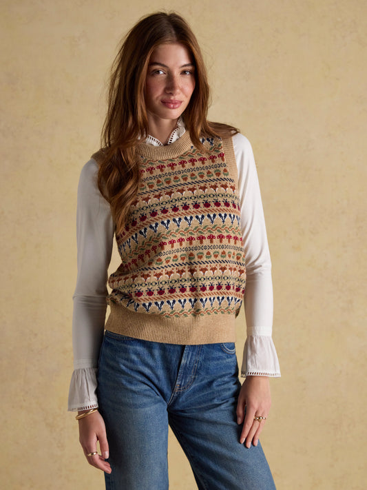 Joules Woodland Oatmeal Cotton-Rich Intarsia Crew Neck Knitted Vest