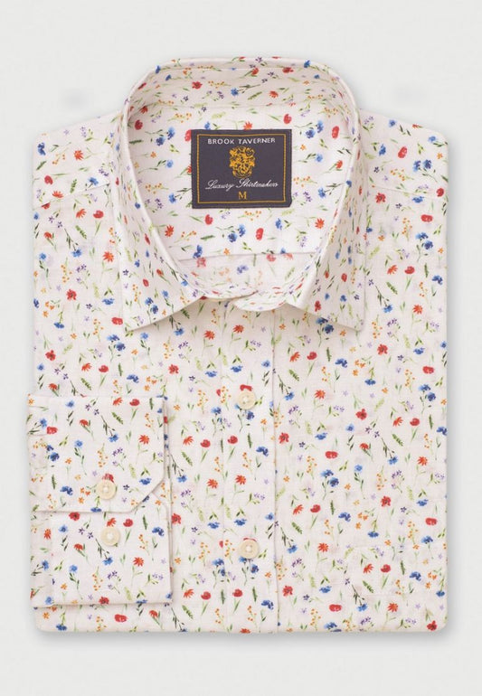 Brook Taverner Regular Fit White Herringbone Stretch Cotton Shirt