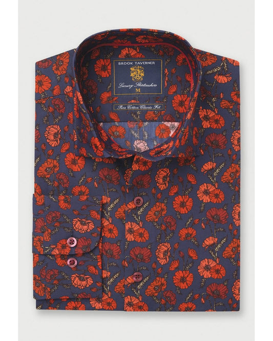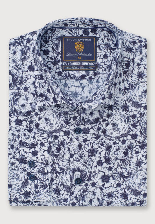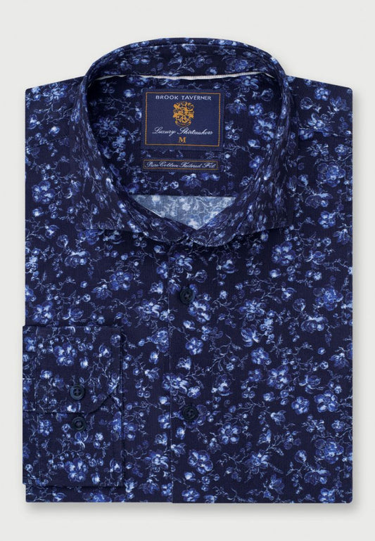 Brook Taverner Regular Fit Navy Floral Needlecord Cotton Shirt