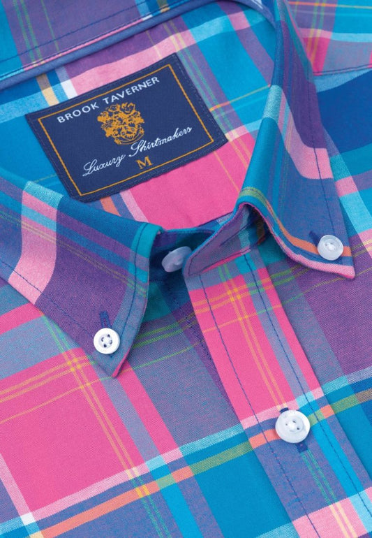 Brook Taverner Regular Fit Teal Melange Check Cotton Shirt