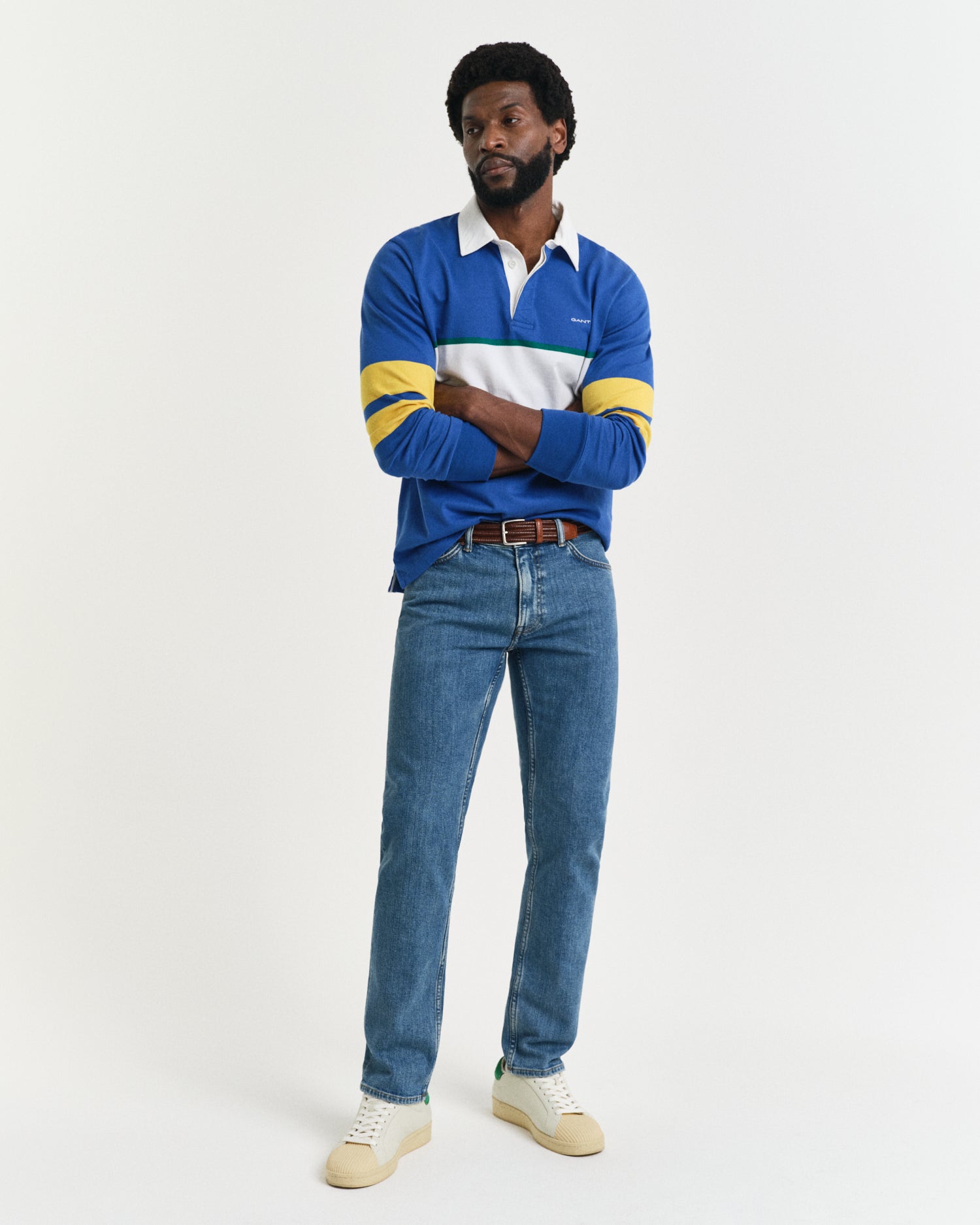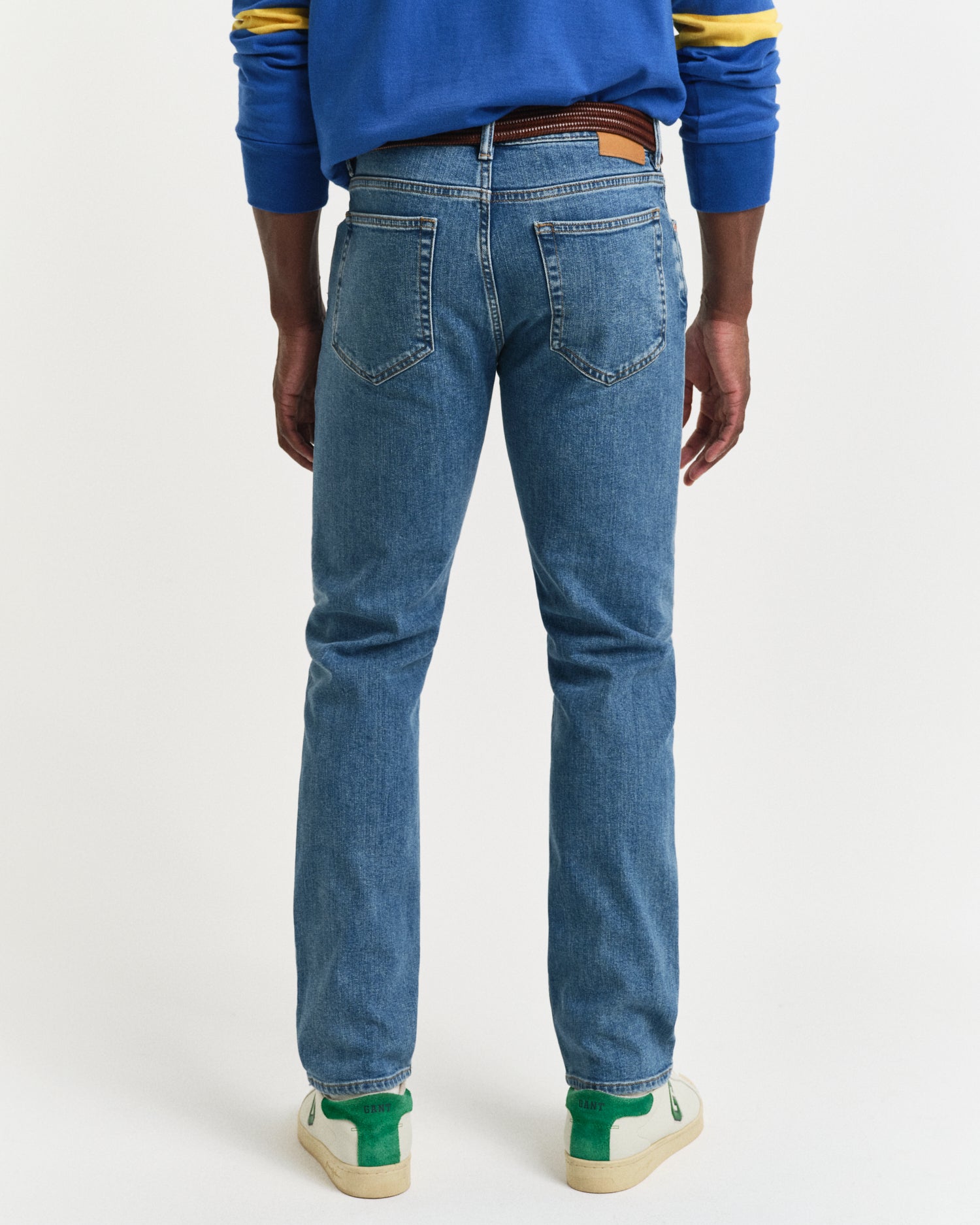 Featuring a clean indigo wash, these jeans are an ideal addition to any seasonal wardrobe. Designed for a regular fit, they have a mid-rise waist and a slight taper below the knee. With a classic 5-pocket style and zip fly front, these jeans are accented by branded shank buttons, rivets, and a leather logo patch on the back waistband. By choosing these cotton products, You’re supporting GANT's investment in Better Cotton’s mission. This product is sourced via a system of mass balance and therefore may not contain Better Cotton. Read more on bettercotton.org/massbalance.