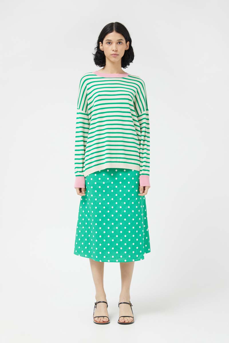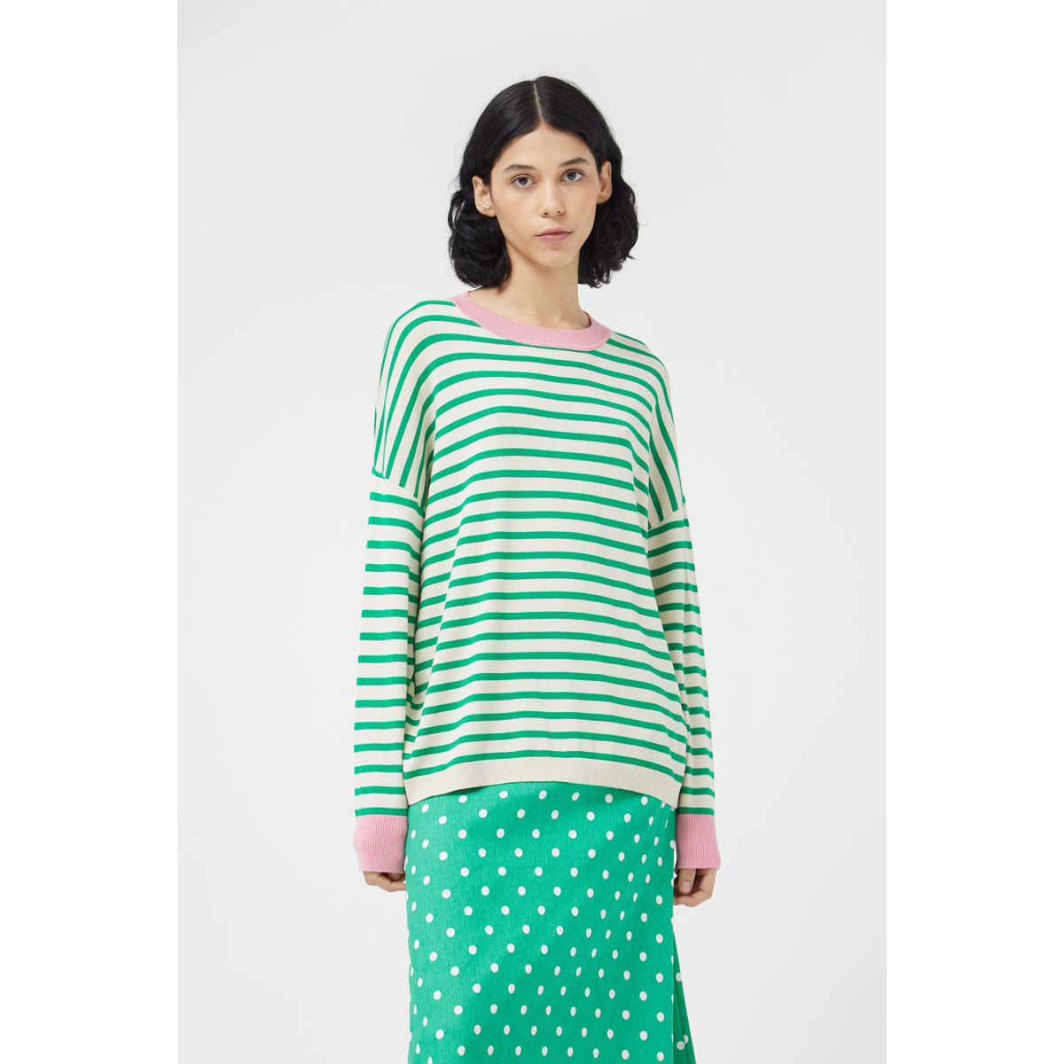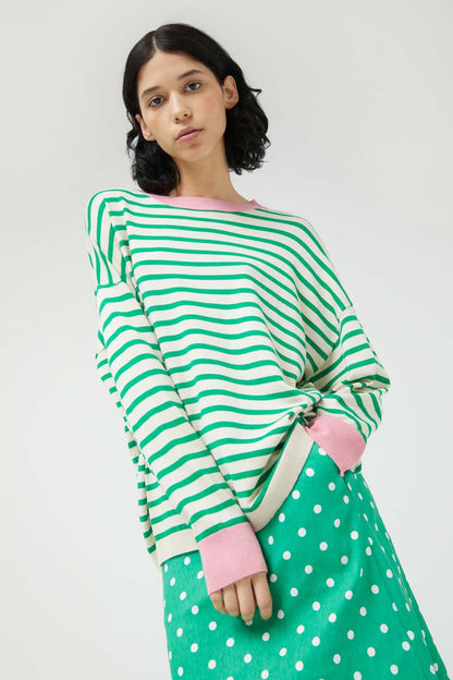 Oversized fine knit sweater with green striped print. With a round neckline and long sleeves with slightly dropped shoulders. Detail of pink ribbed finishes. The model is 175 cm tall and wears size S.
