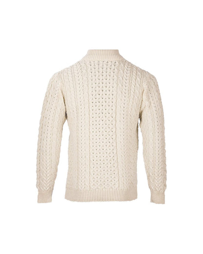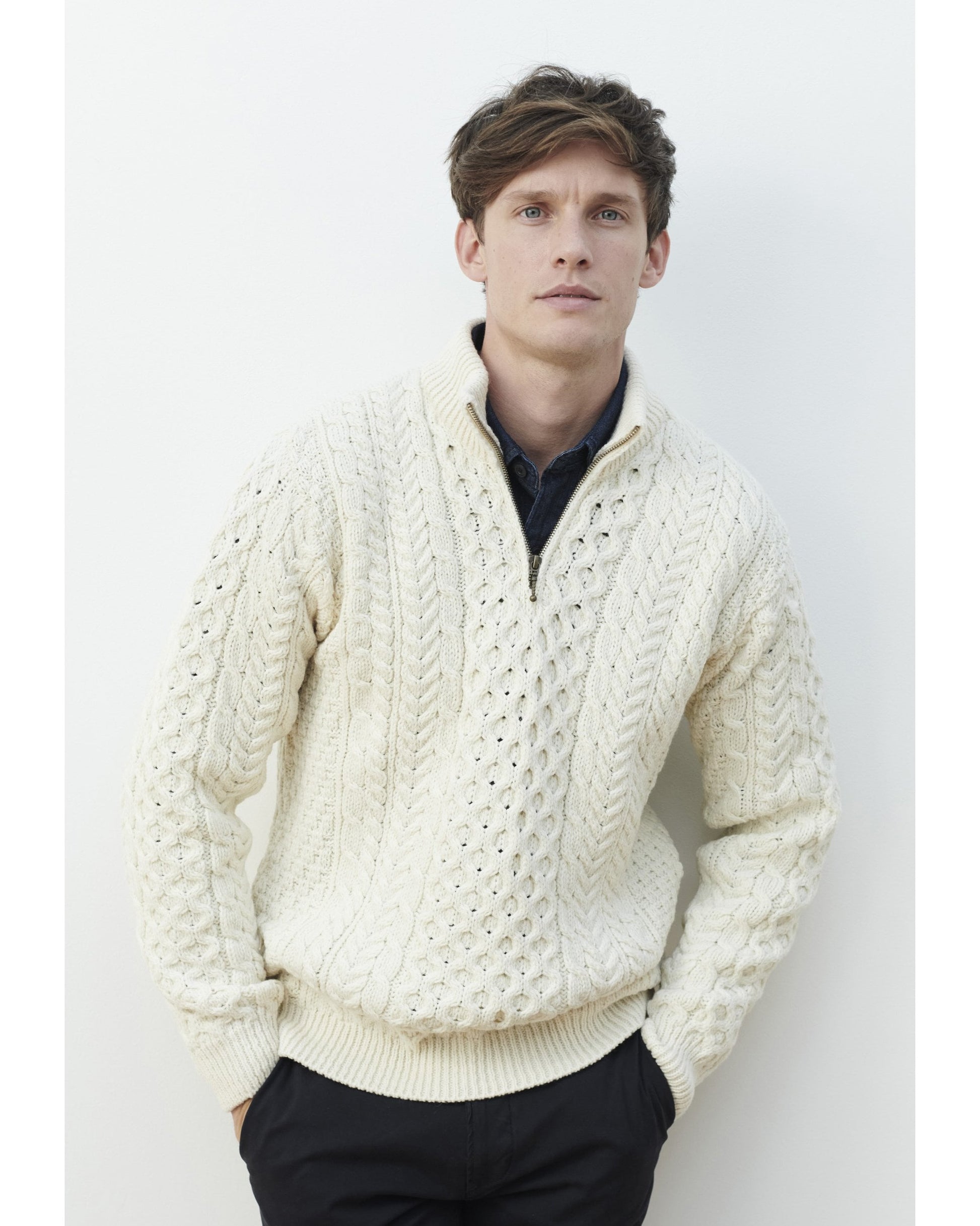 The Aran Woollen Mills Ballycroy Aran Half Zip Sweater showcases a modern half zip cut, with an antique brass finished zip that fastens up to the top of the double ribbed collar. This contemporary style is balanced with traditional Aran cable, honeycomb and moss stitching, allowing the magic of Aran to weave its way into the current moment. Crafted using natural yarns and traditional methods in the West of Ireland.