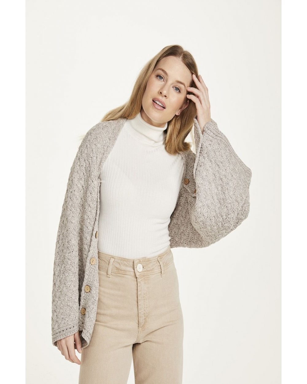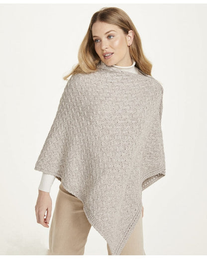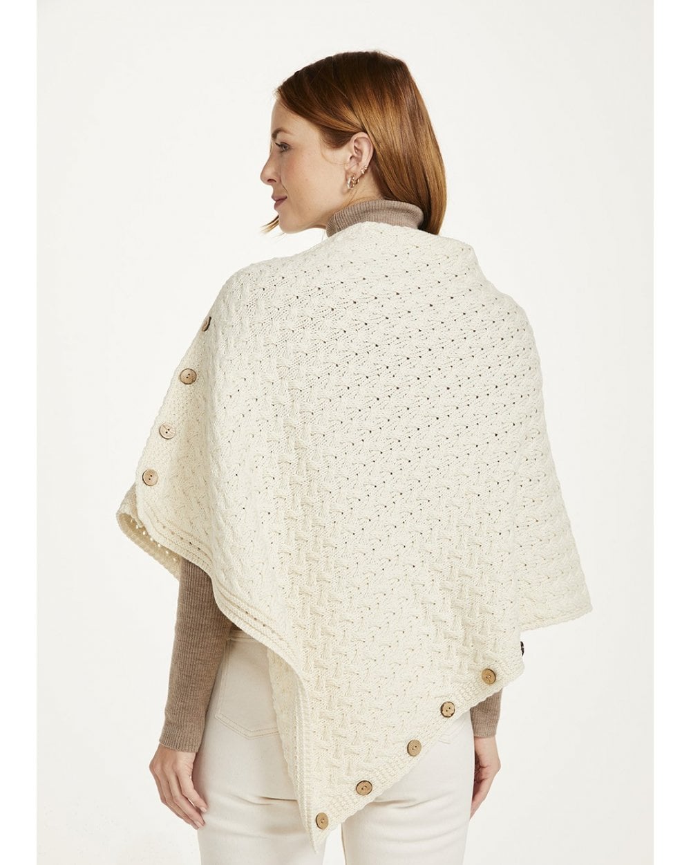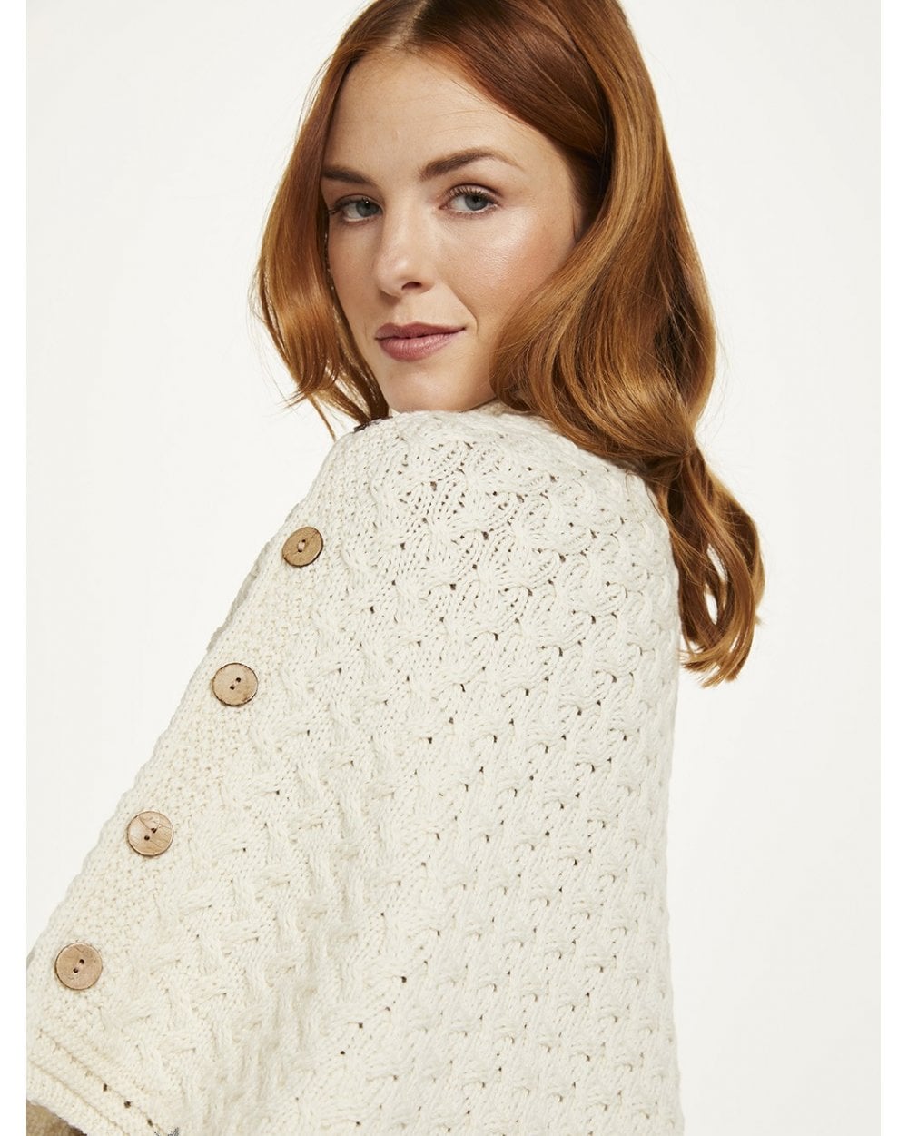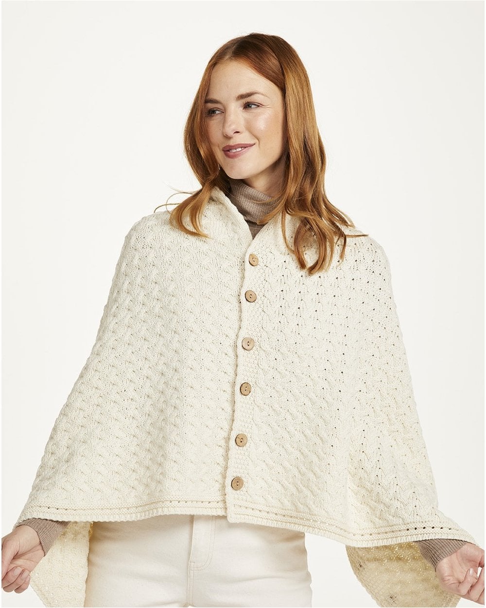 Sustainability is at the heart of Aran Woollen Mills, and the Glenbeigh Aran Cape takes cost-per-wear to the next level. This cleverly designed piece can be worn in three ways, depending on the buttoning. Wear it as a cape, a shrug, or a poncho, depending on the look you’re in search of. This piece showcases an all-over trellis pattern, paired with a moss button stand with lace details on the edges, and is crafted with Supersoft merino wool.