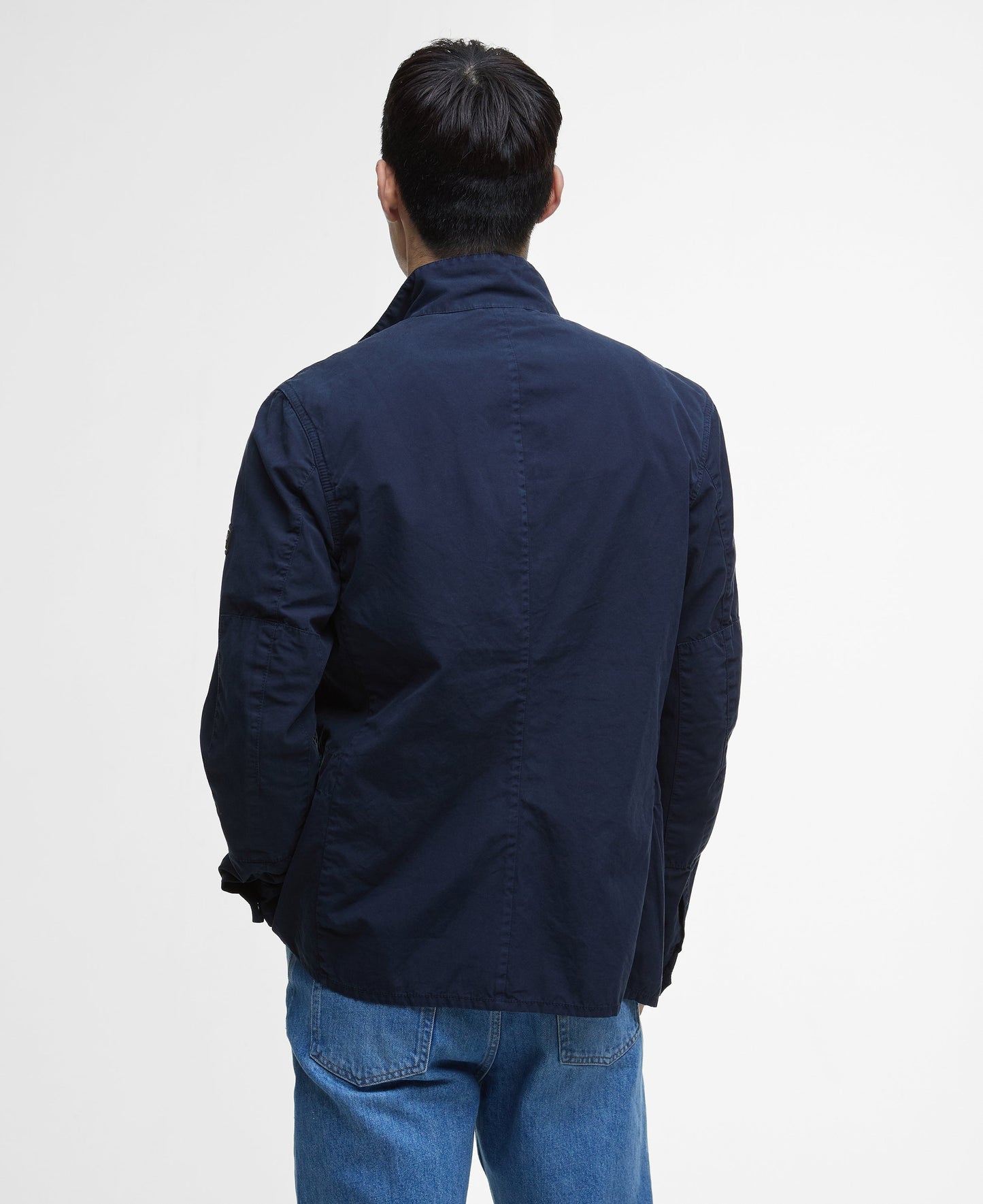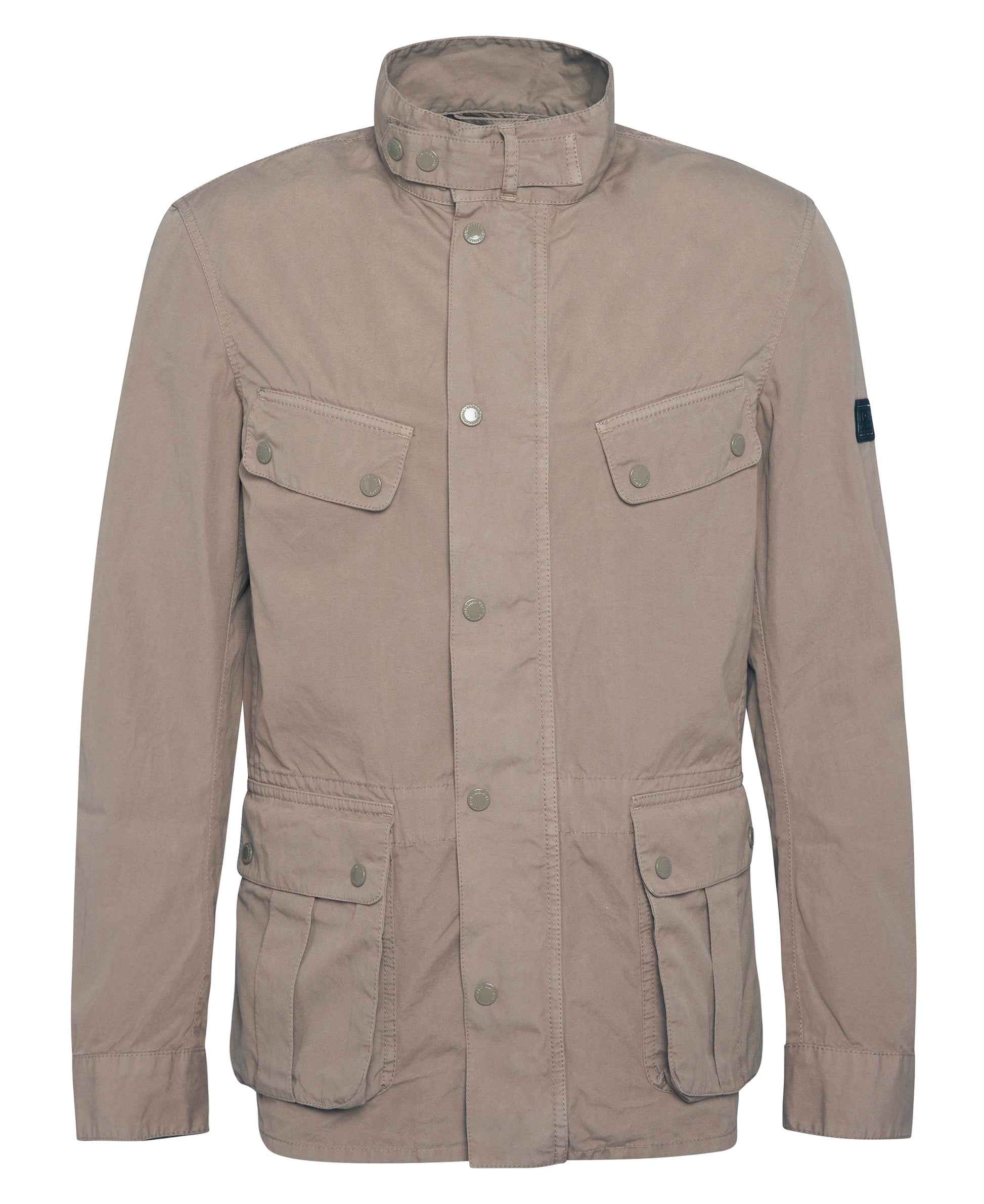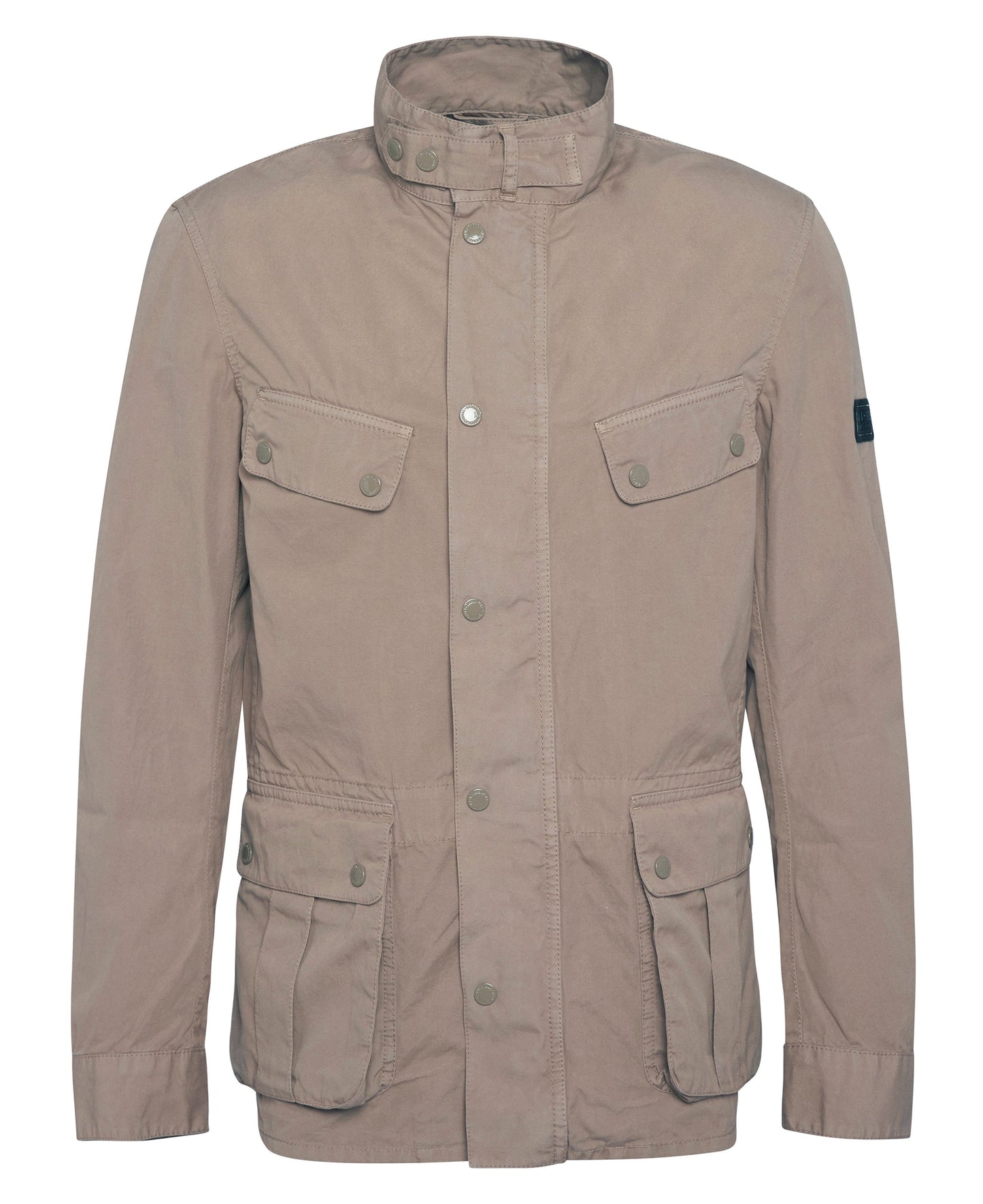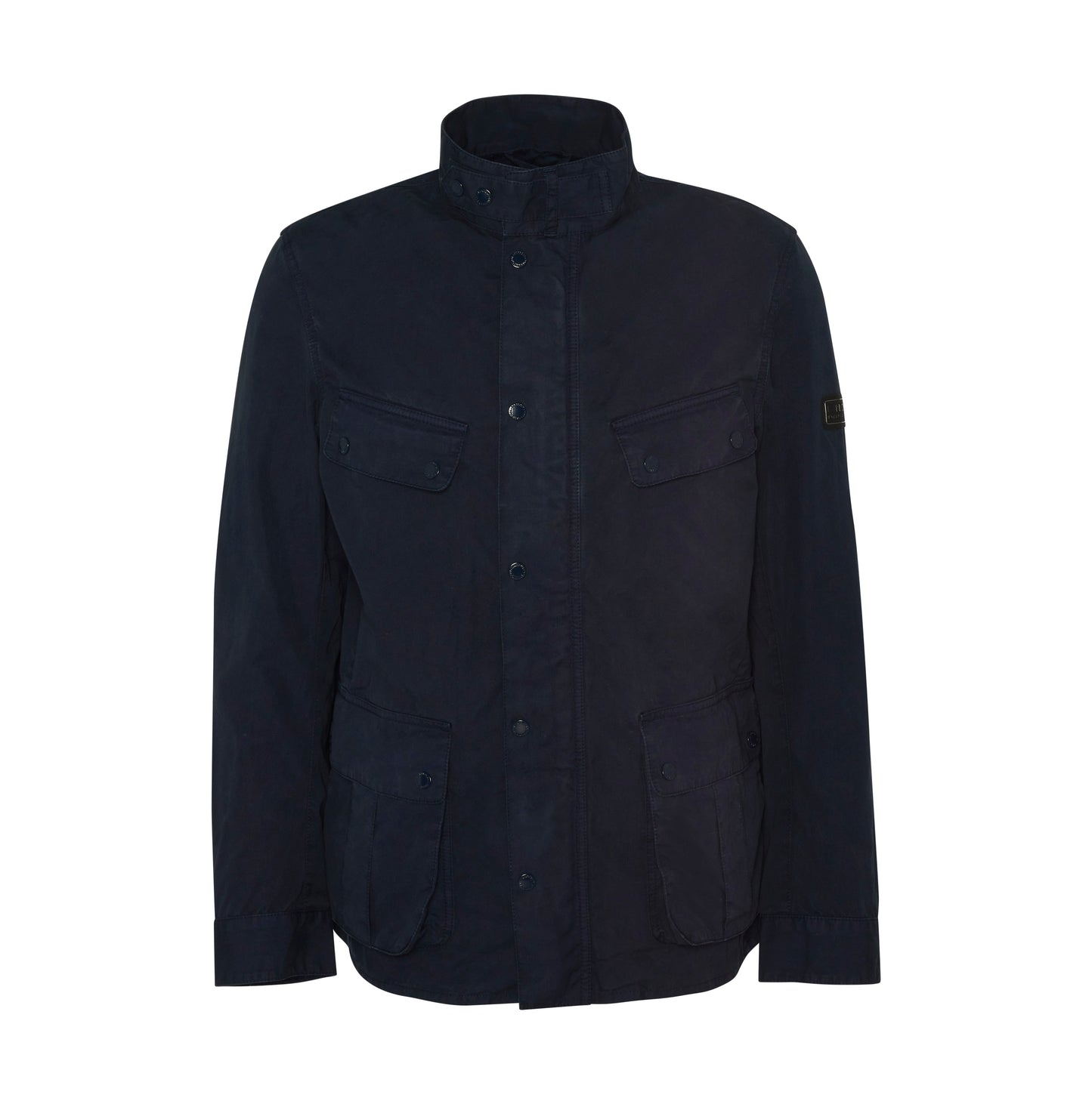Garment dyed cotton casual jacket with floating inner yoke based on the Barbour International Duke. Features include lower bellow pockets and chest welt pockets with studded pocket flaps.