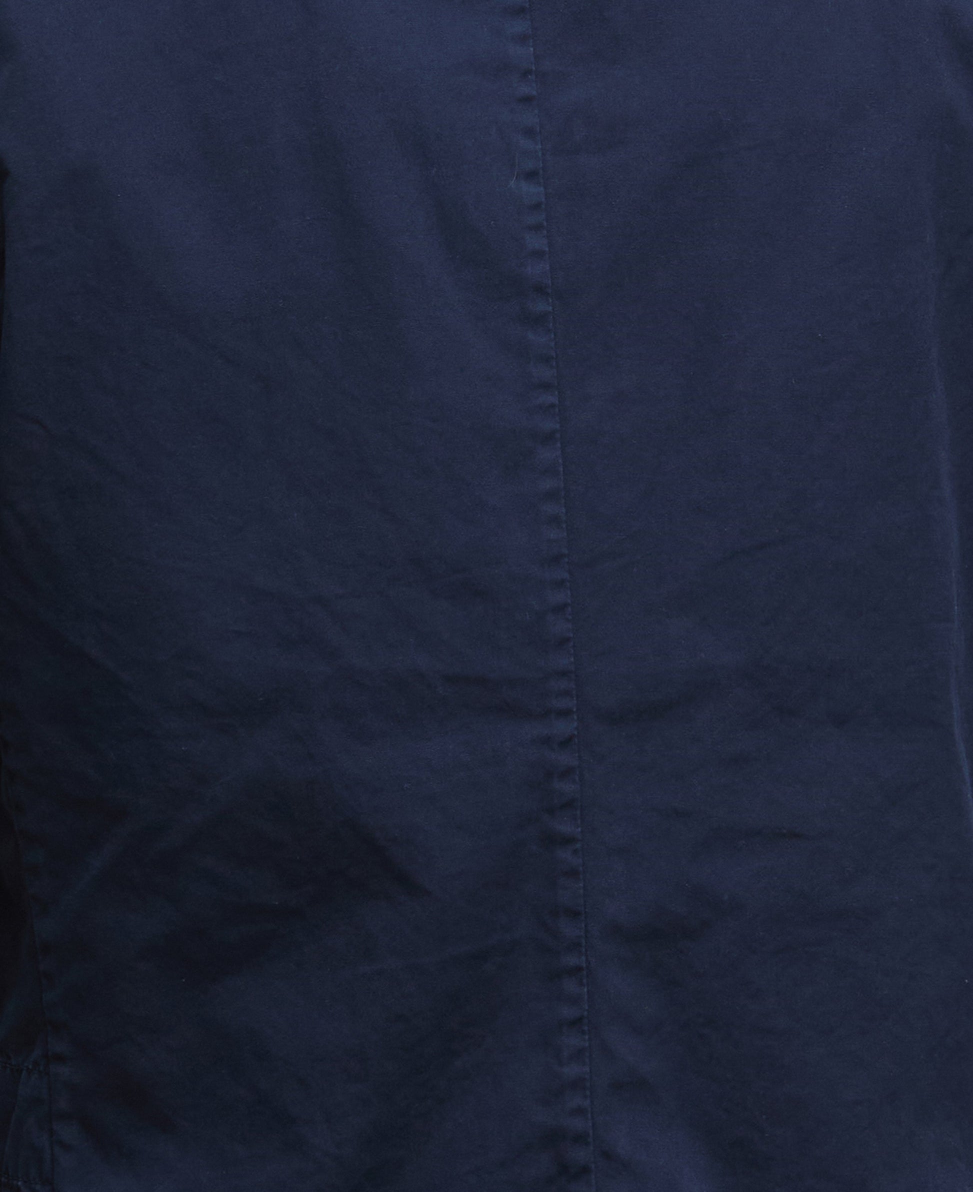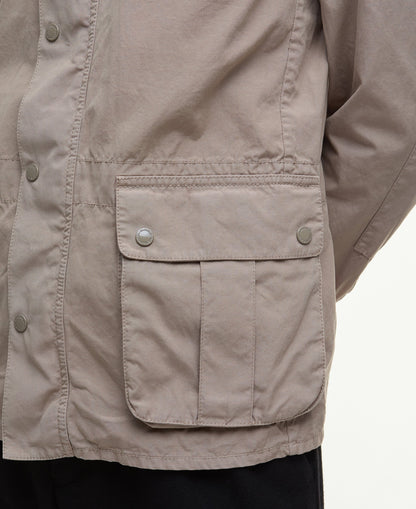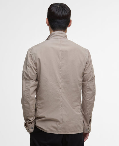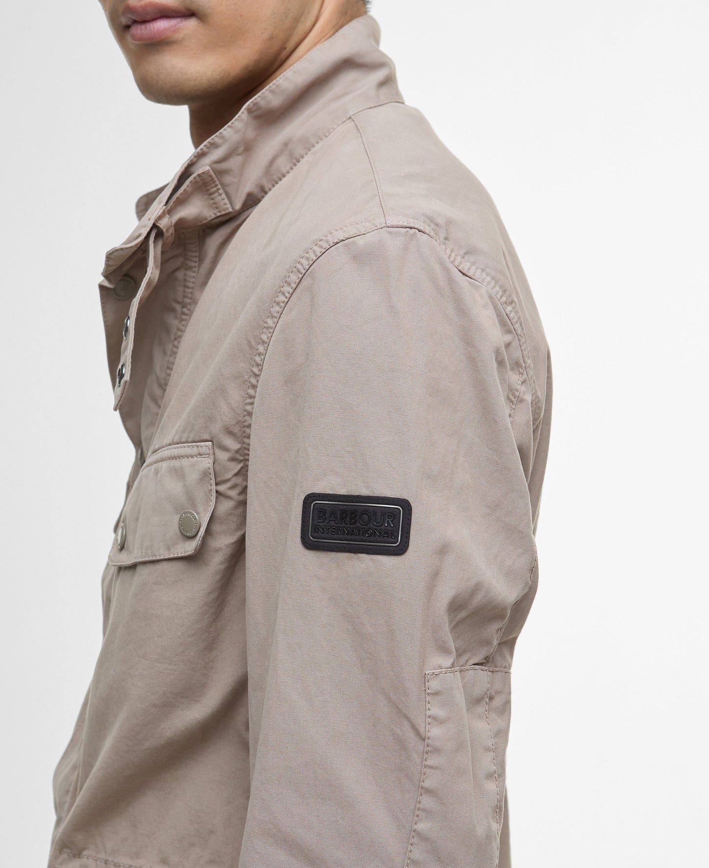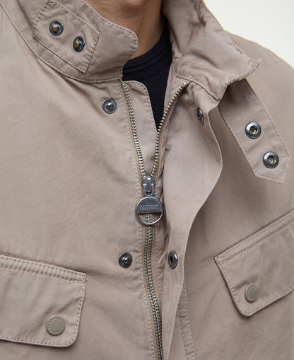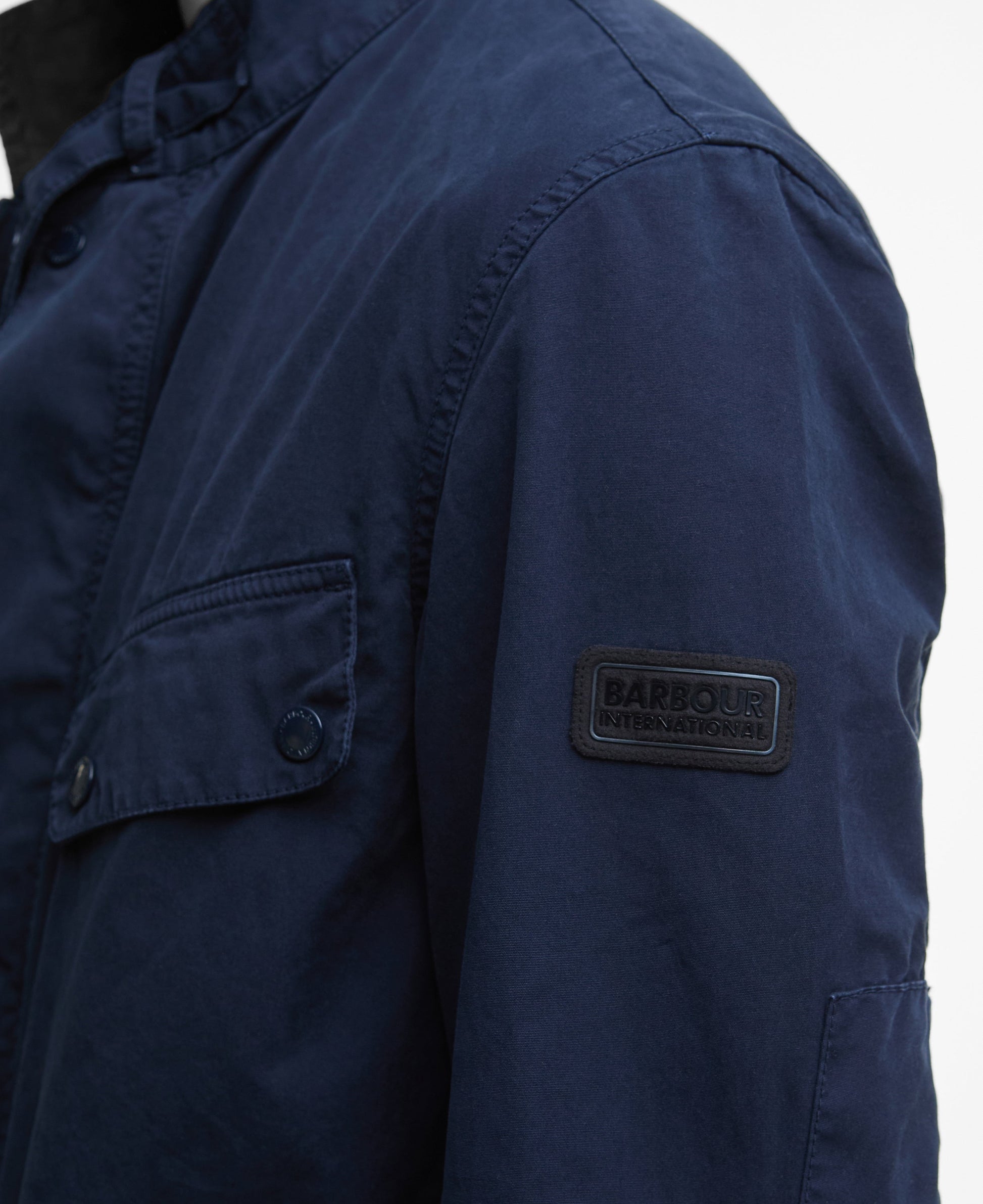 Garment dyed cotton casual jacket with floating inner yoke based on the Barbour International Duke. Features include lower bellow pockets and chest welt pockets with studded pocket flaps.