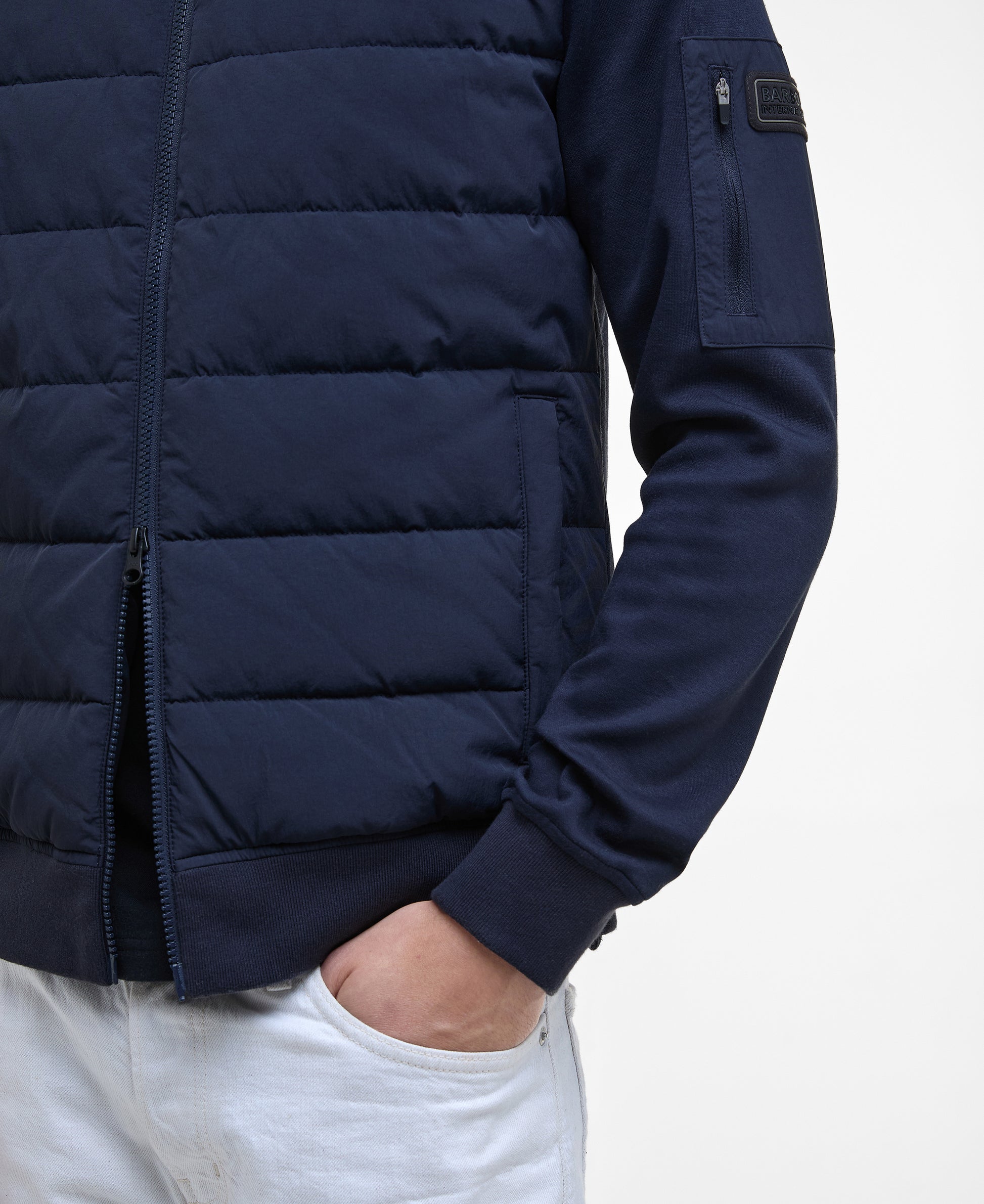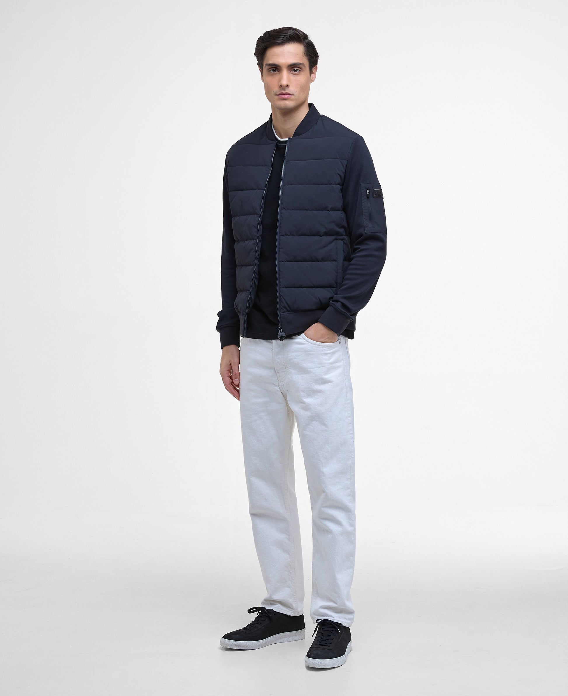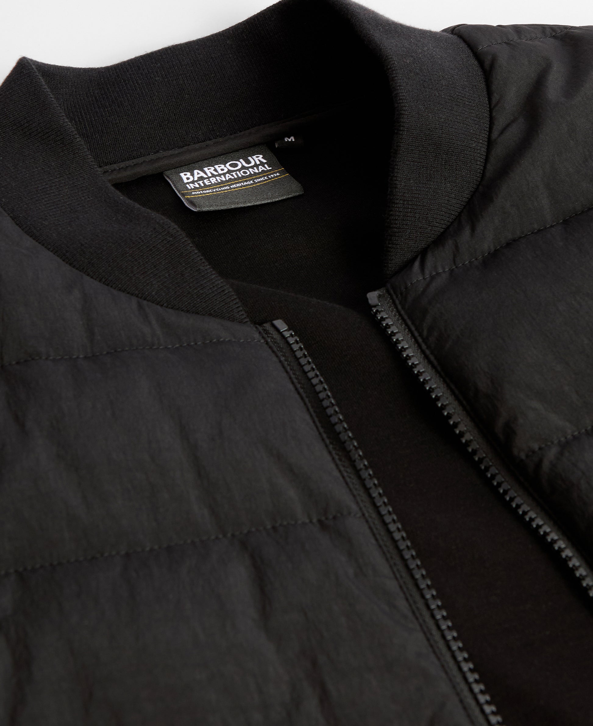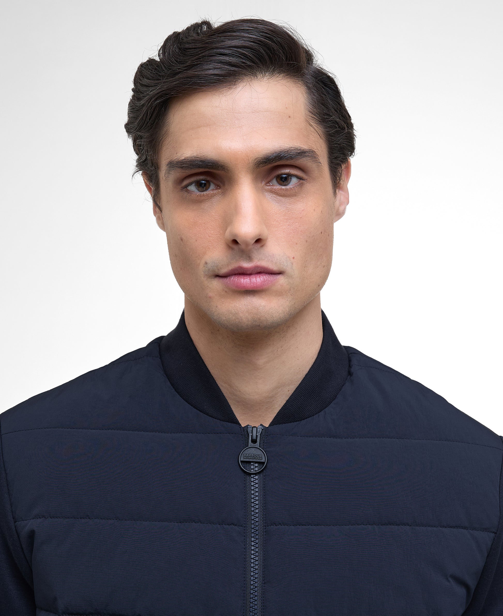 The Barbour International Holmes Bomber features a long sleeve design in a double knit sweatshirt fabric, boasting a full baffle quilt bodice. A double zip front fastening and rib detail to the cuffs and hem emulates a traditional bomber jacket style.