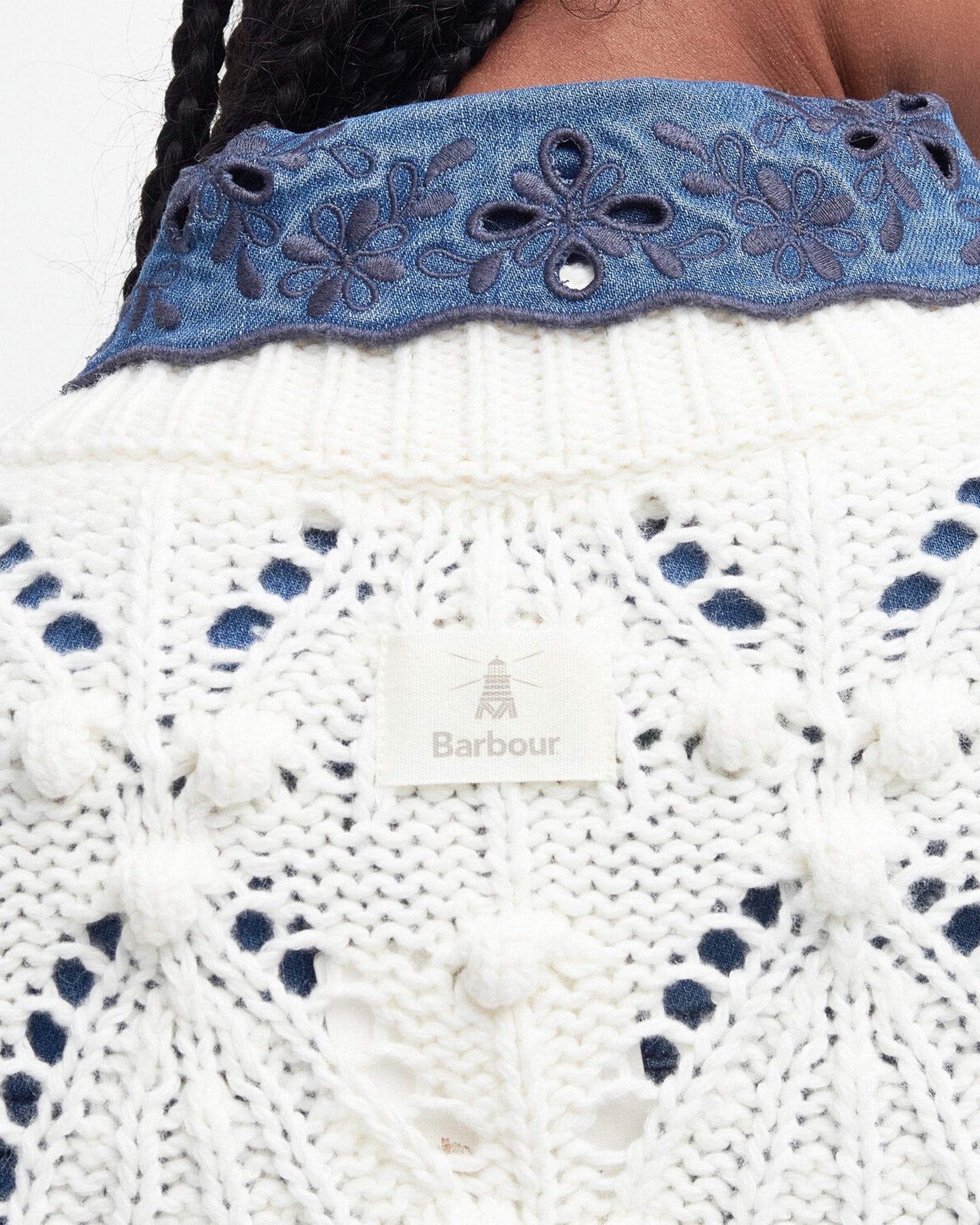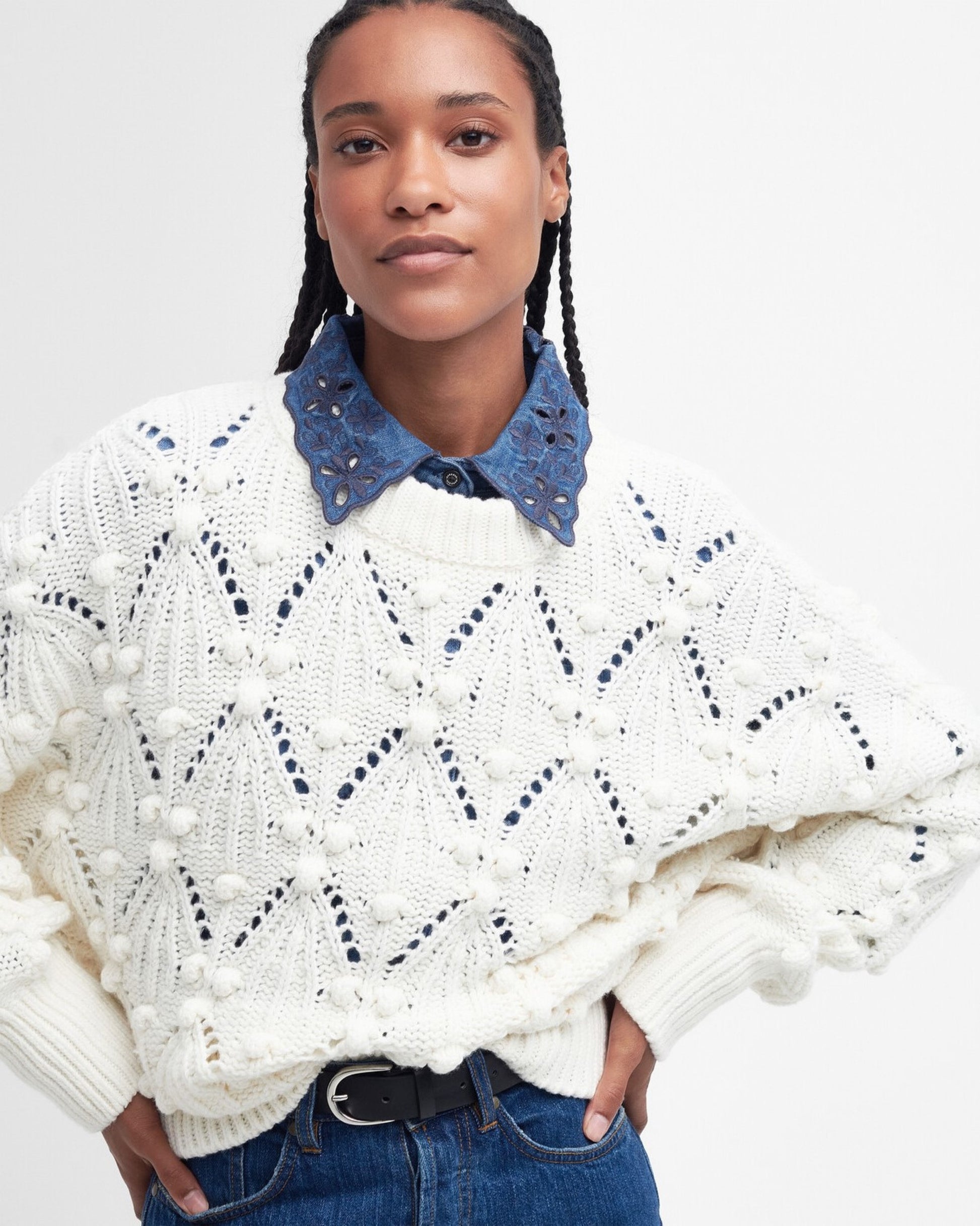 If you're looking to elevate your knitwear collection, the Barbour Glamis Crew Neck Knitted Jumper is the perfect new season style. This chunky knit features an all-over bobble stitch design with dropped shoulders and a cocoon silhouette for optimal cosiness and warmth.