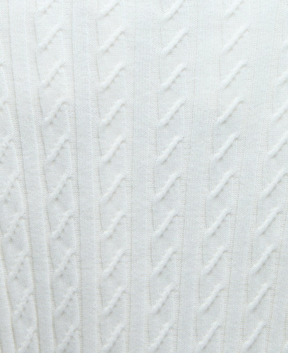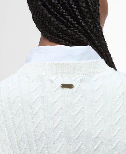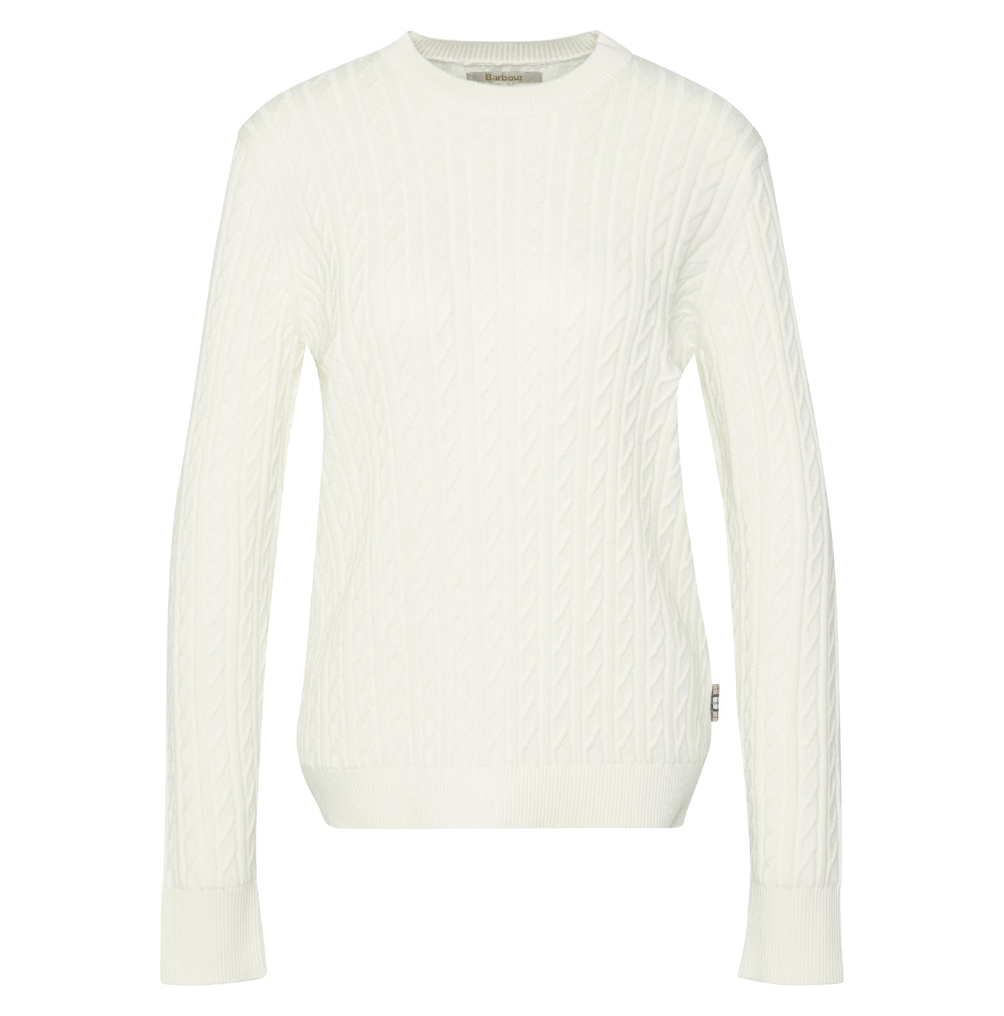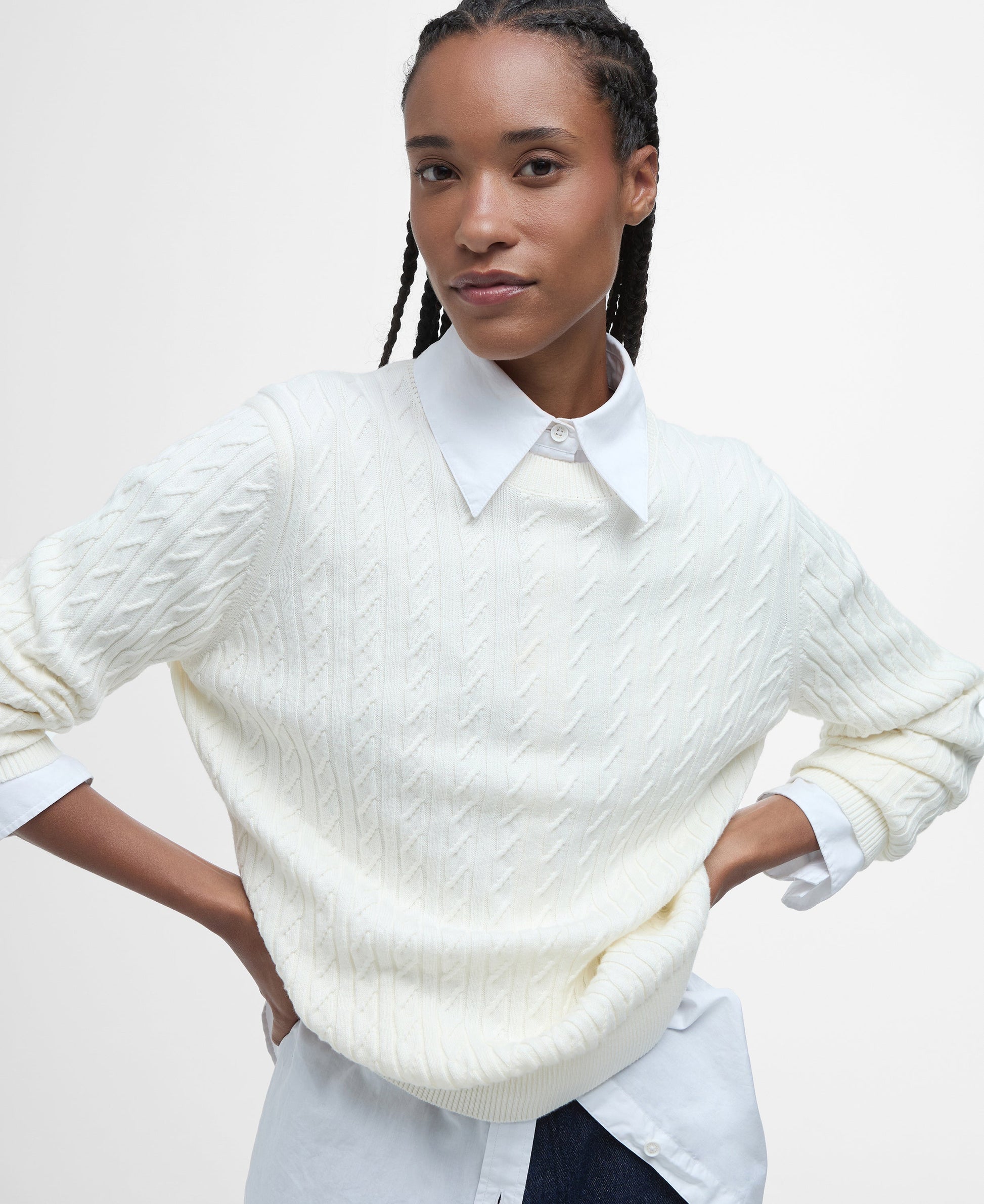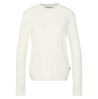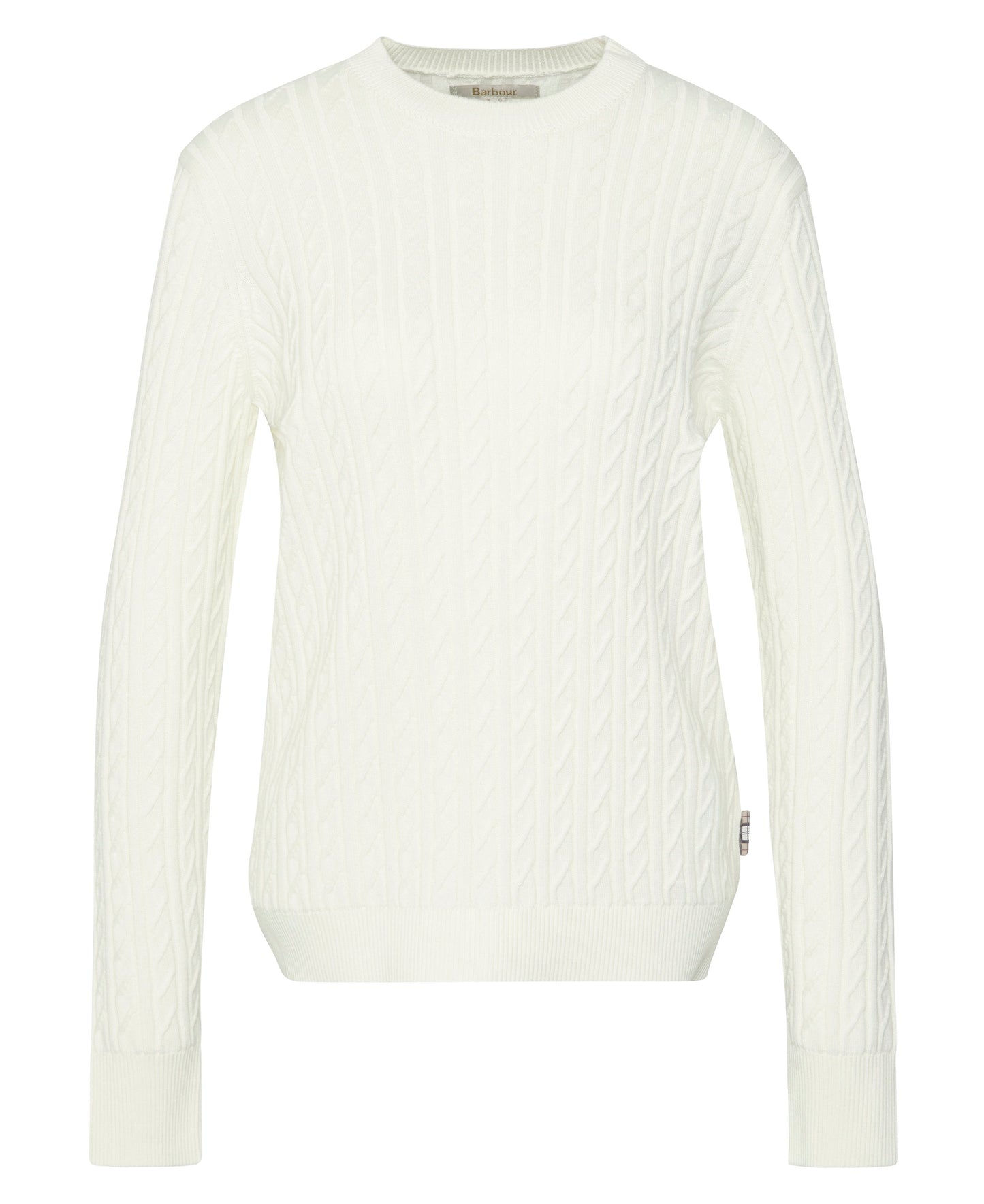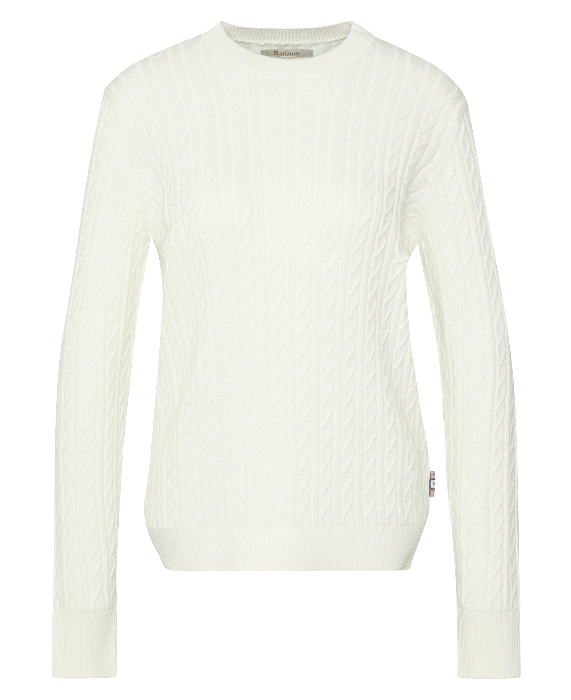 Crew neck cable knit with set in sleeves and ribbed trims a neck, hem and cuffs. Features slope back shoulder with fashioning. Slim metal ID bar to back neck and tartan side flag.