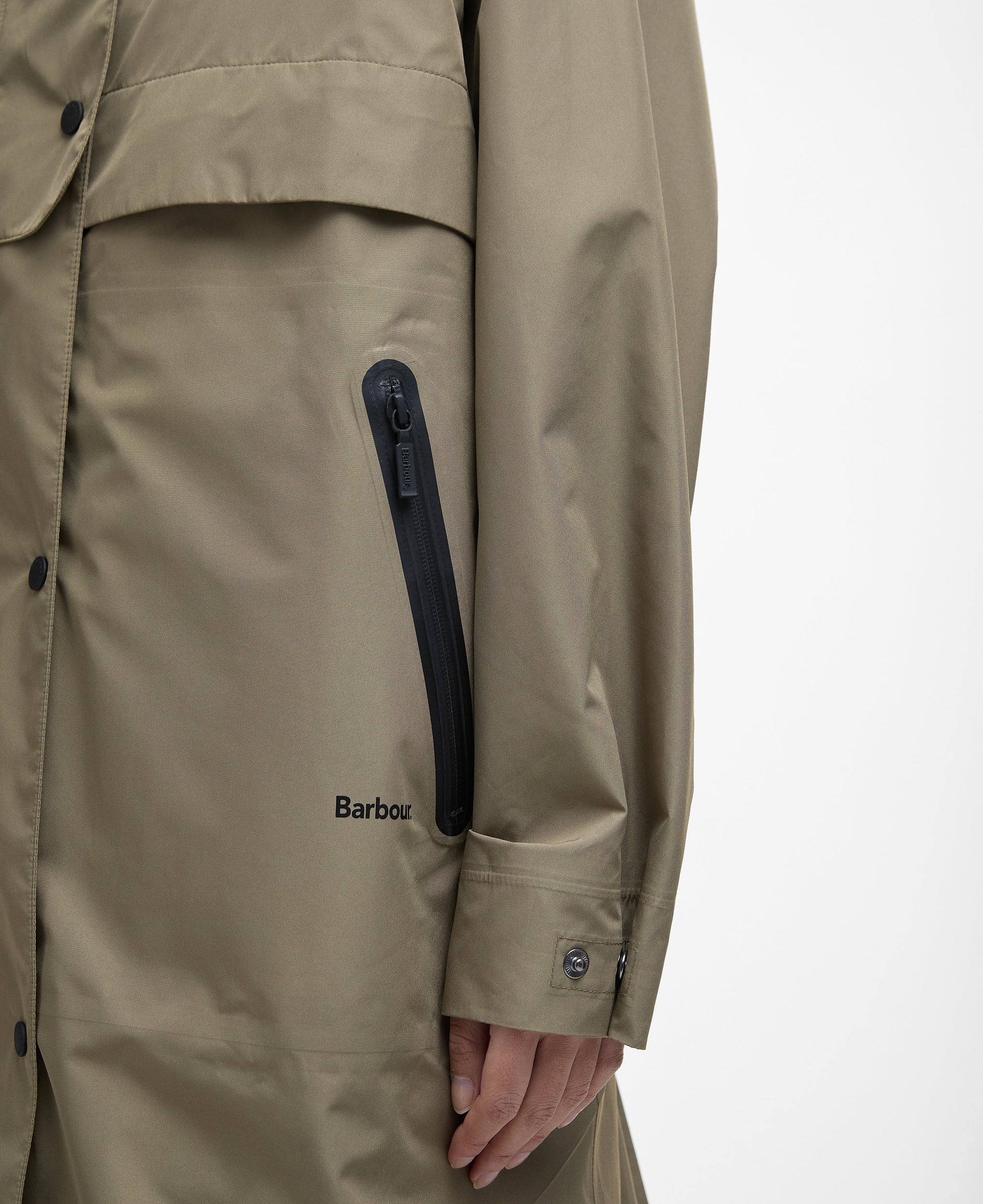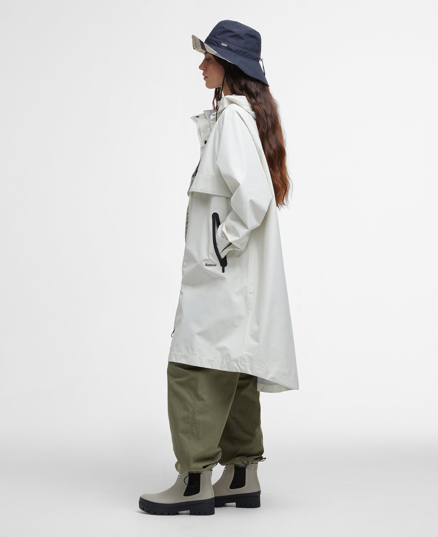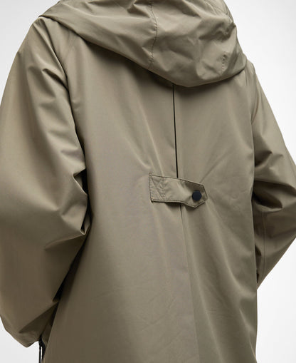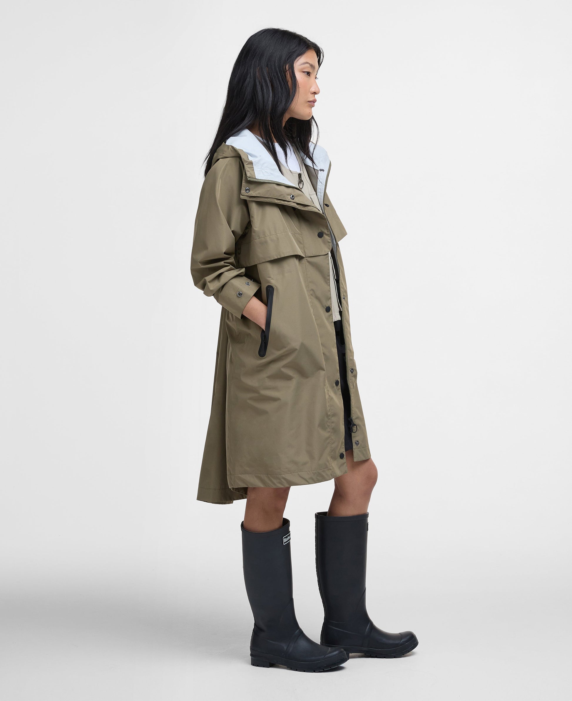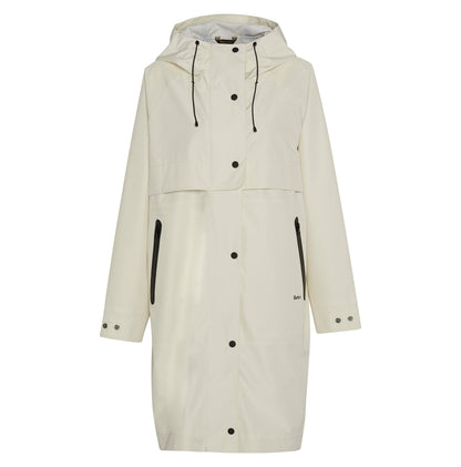 Long length waterproof jacket with lovely back pleat detail. Contrast black trims and yoke detail.