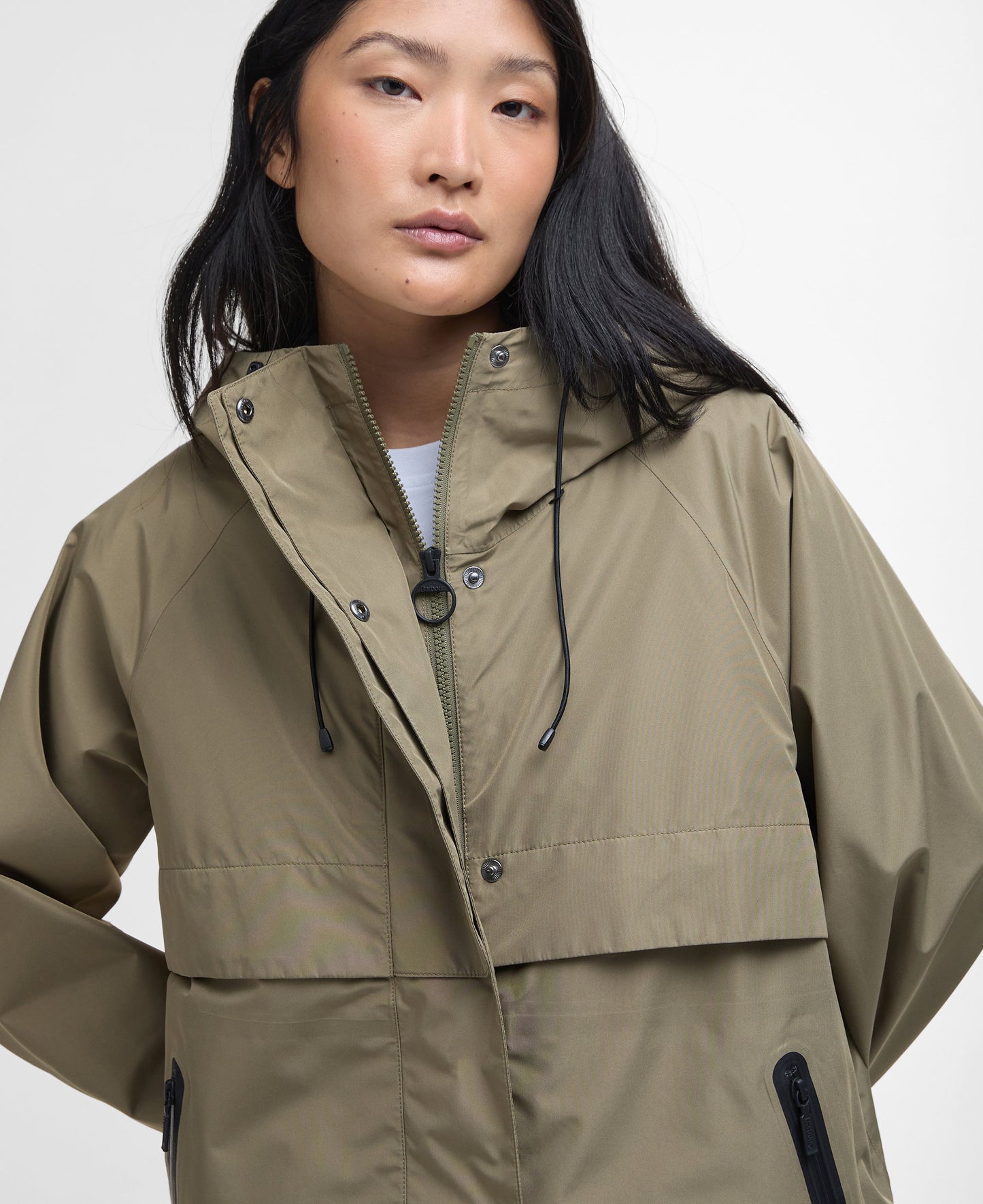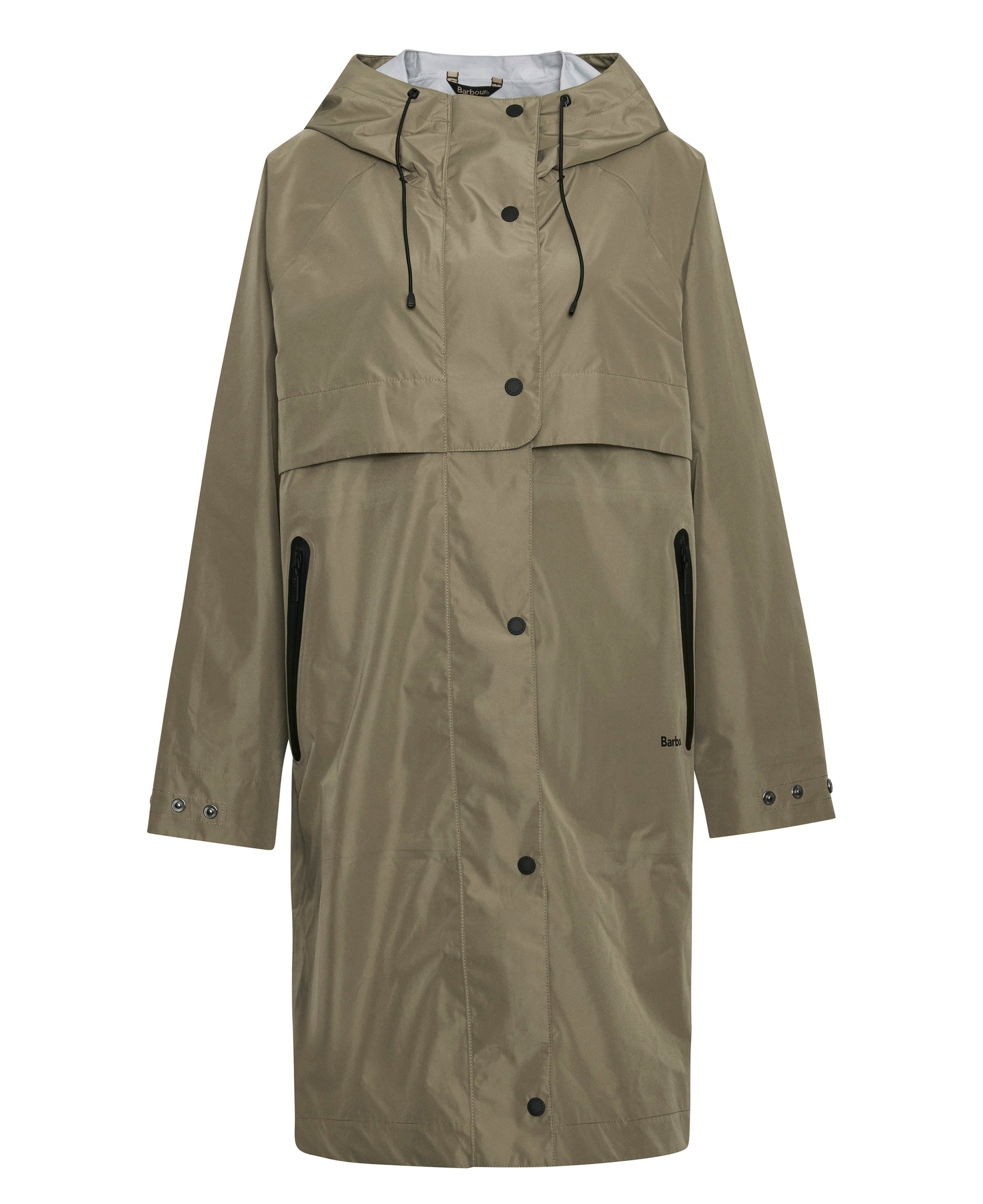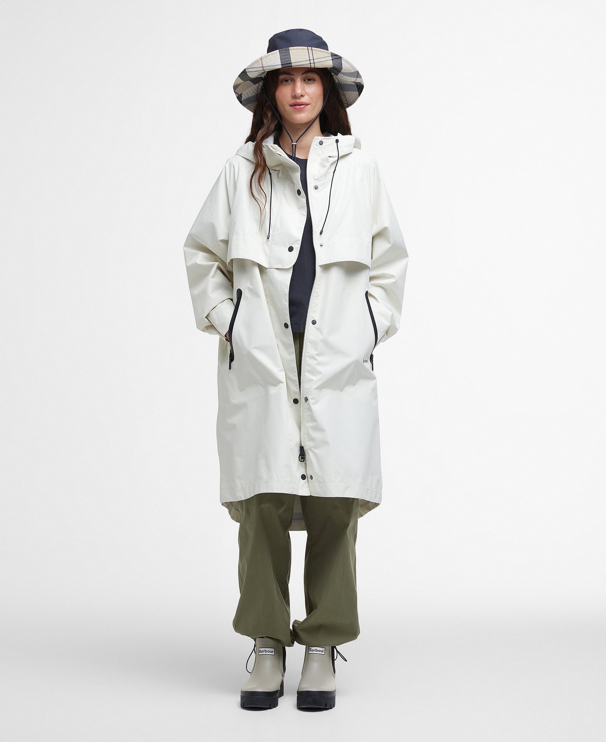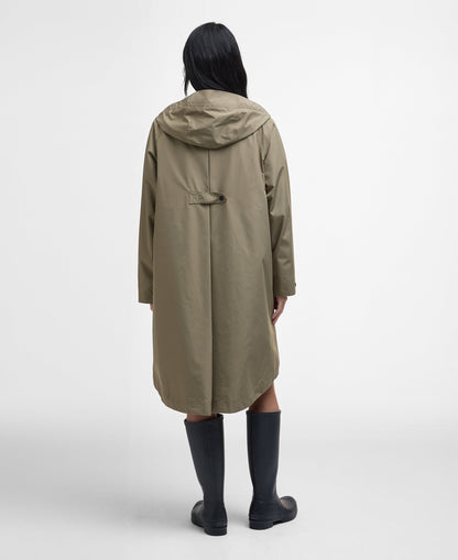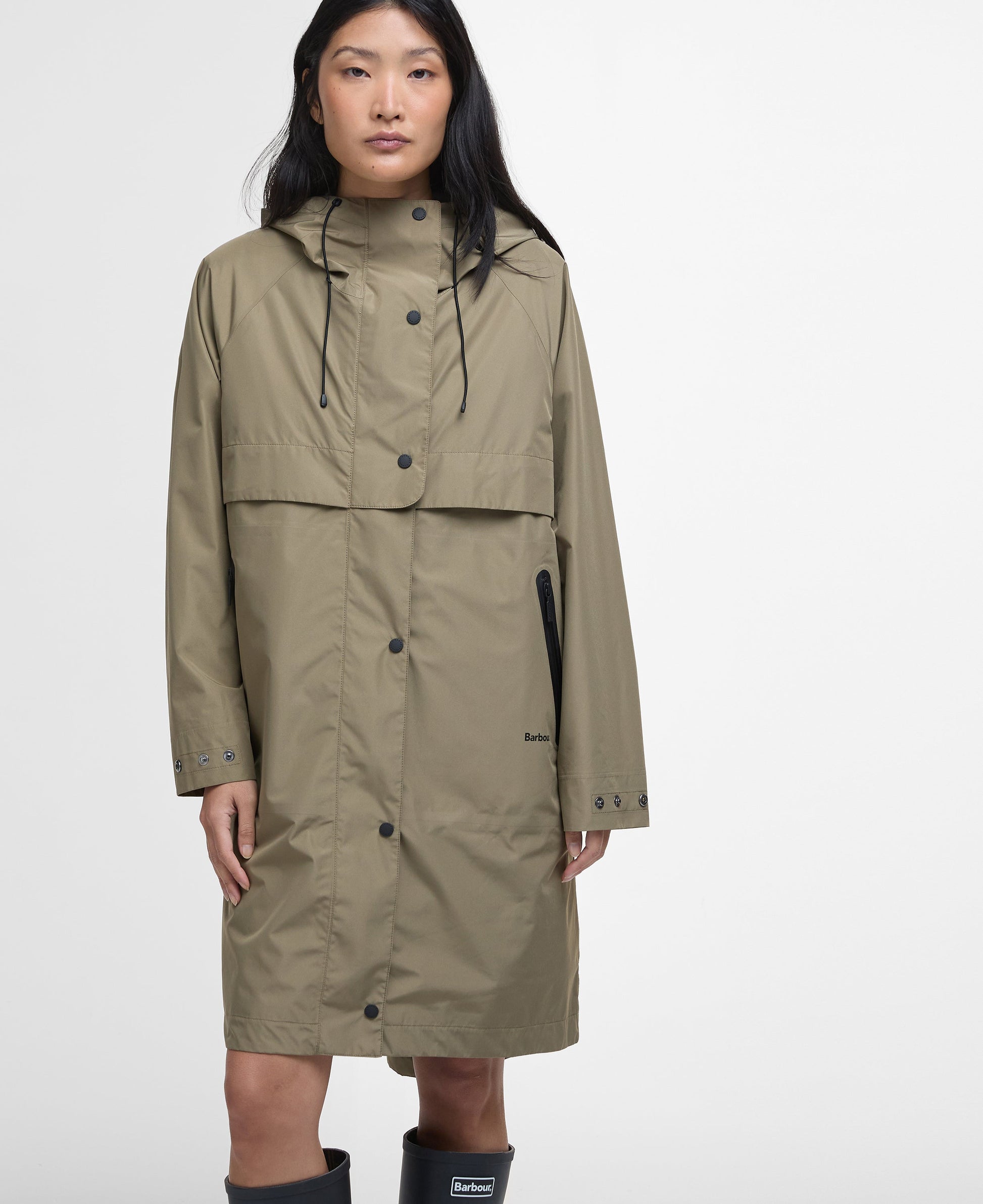 Long length waterproof jacket with lovely back pleat detail. Contrast black trims and yoke detail.
