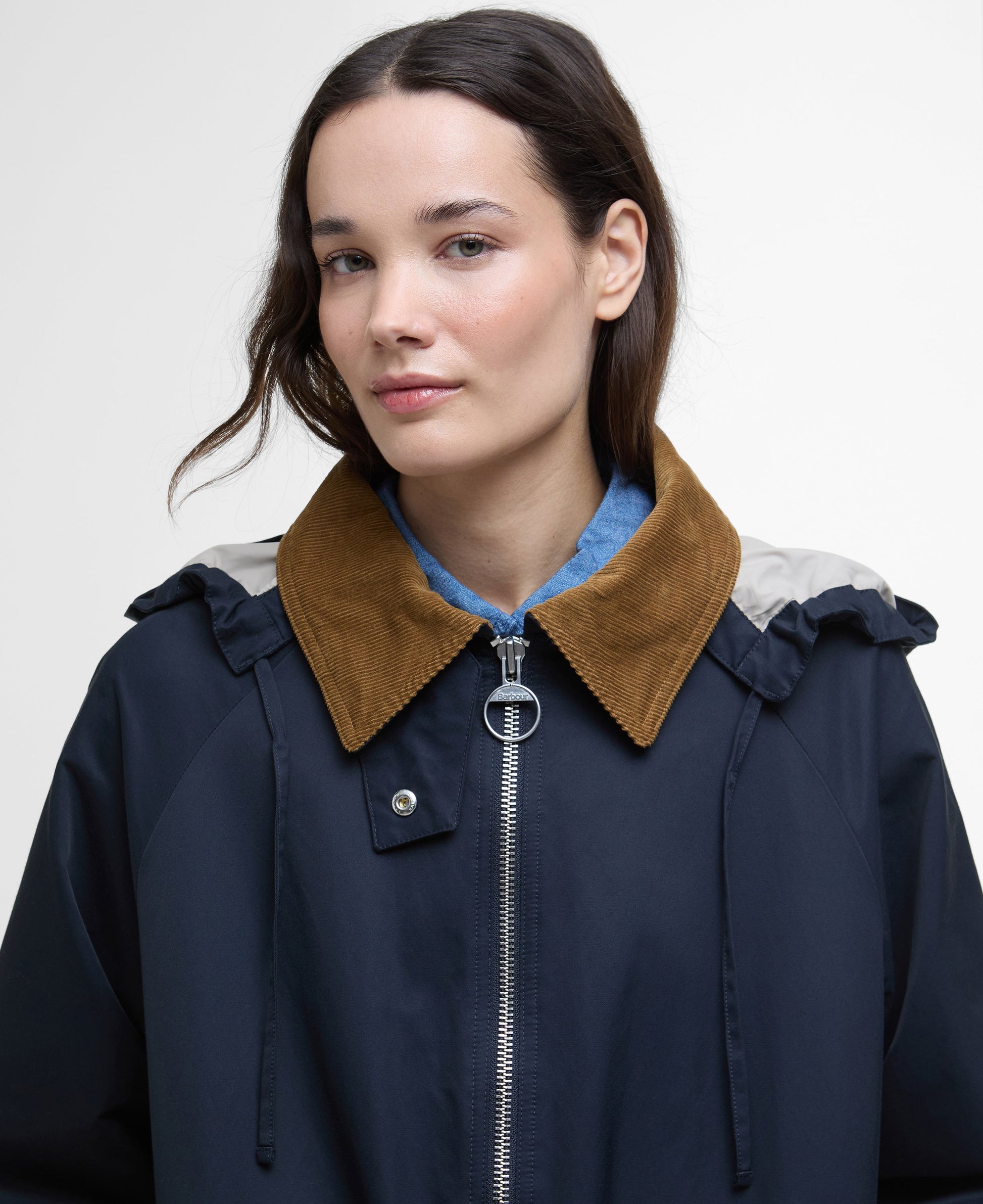 Long length zip front jacket, simple styling with true Barbour detail in the patch pocket and cord collar. Hood is detachable.