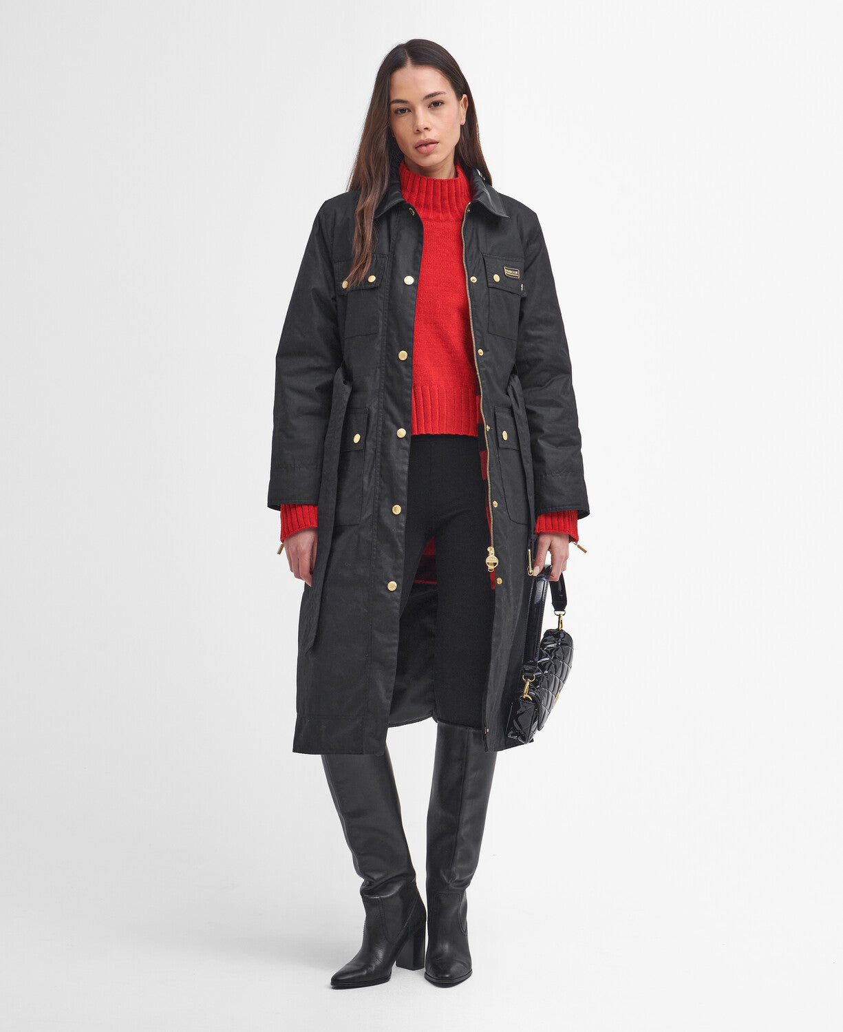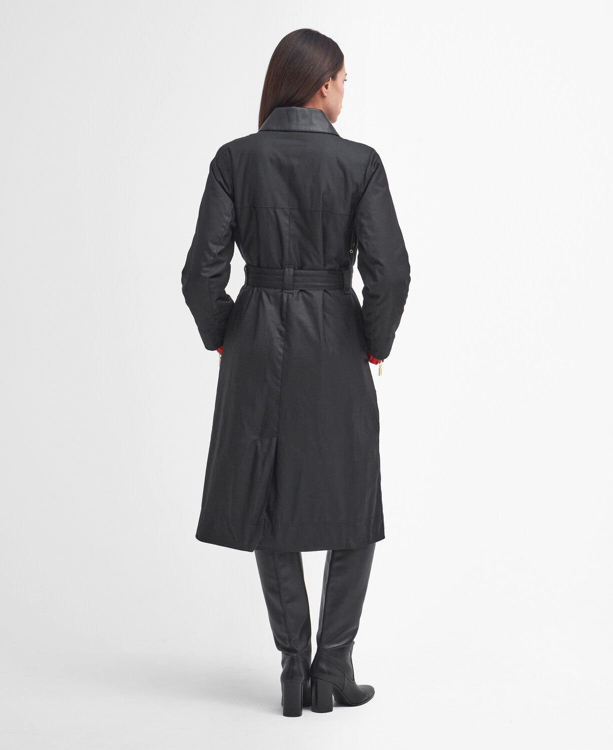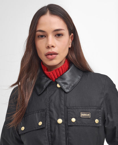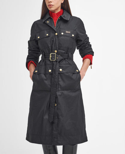 Upgrade your waxed jacket collection with a contemporary take on our classic waxed cotton styles, courtesy of the B.Intl Milla Waxed Trench Coat. This classic trench coat style is fuelled with Barbour International DNA thanks to its bright brass hardware, four-pocket utility design and contrasting faux leather collar. Finished with a cotton check lining and belted waist, it's perfect way to welcome a bold new silhouette to your wardrobe.