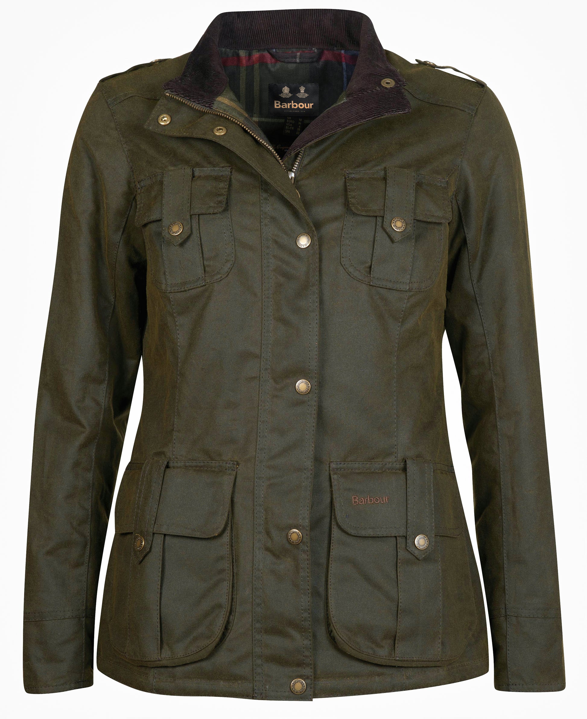 An update on the classic Defence waxed jacket, this version is delivered in a heavier-weight waxed cotton with a warm lining to help protect against the colder days. Styled with shoulder epaulettes and four stud-close frontal utility pockets, it's finished with a lining in signature Barbour tartan.