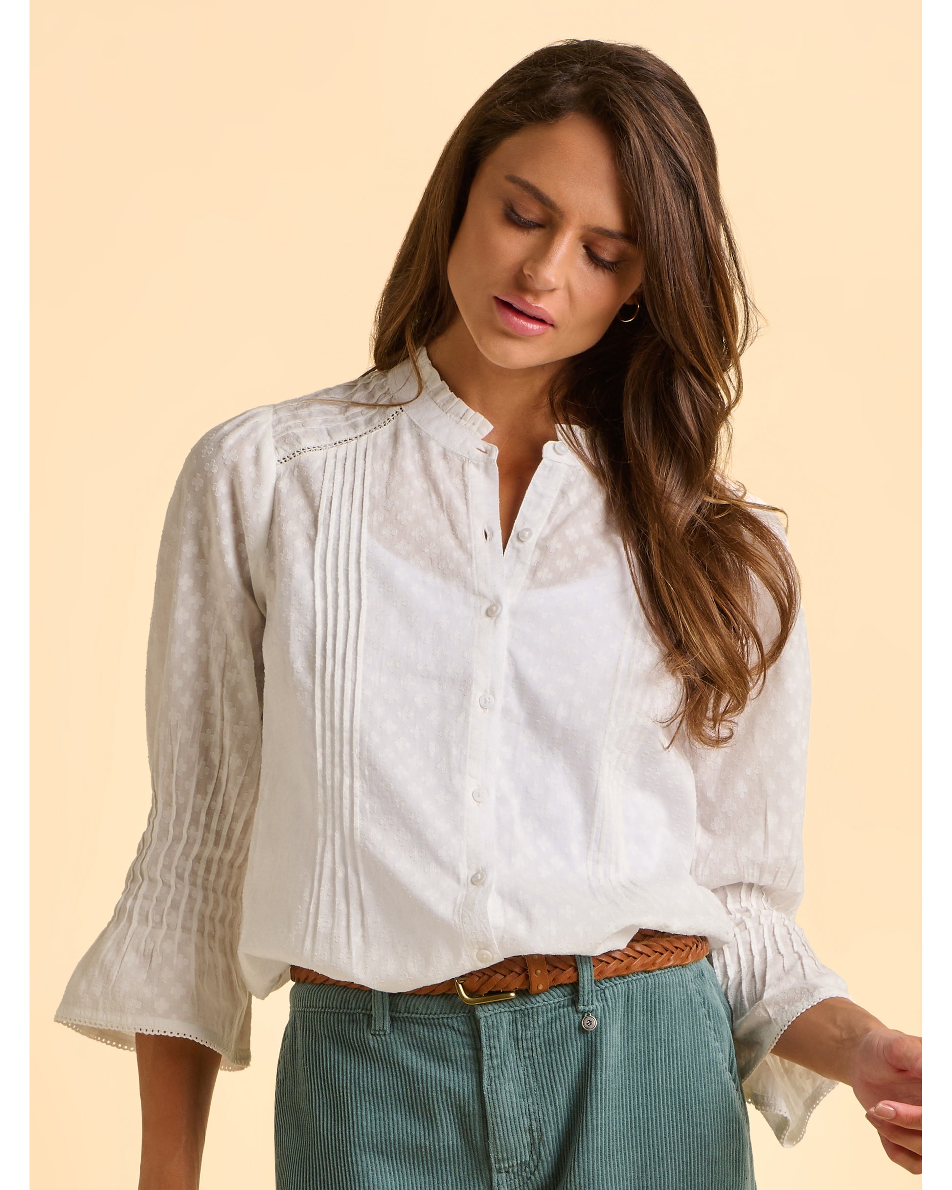 Brakeburn's Elva Blouse is a neat, feminine staple with delicate detailing throughout. Featuring fluted pleated sleeves, broderie trims, and a subtle four-leaf clover print, it’s finished with a frill neckline, exposed white buttons, and soft gathers at the shoulders. A clean, fitted style that’s effortlessly polished.