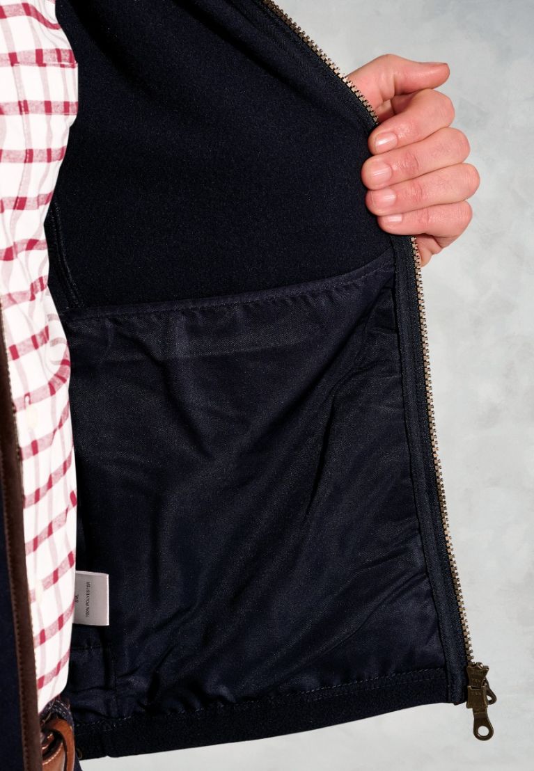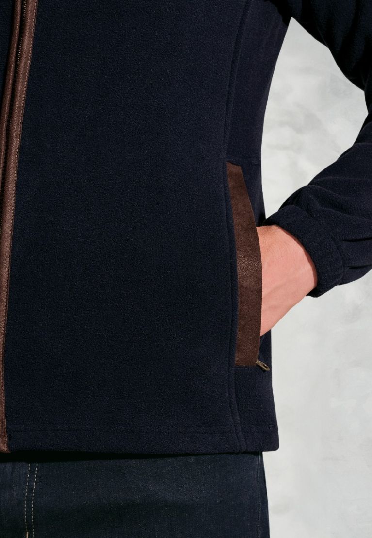 - Faux suede binding collar, front and pockets