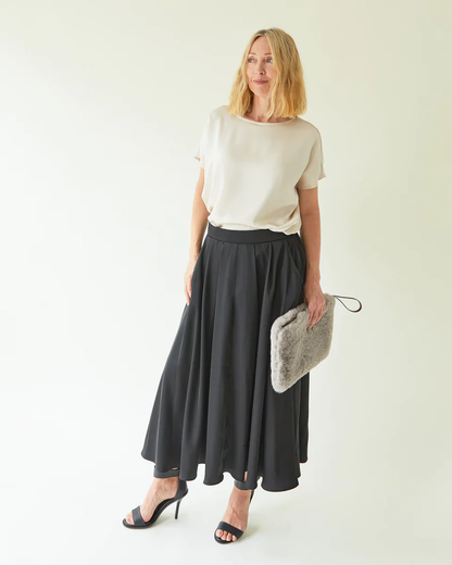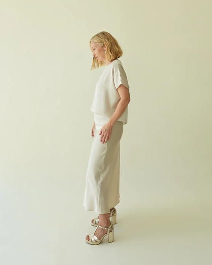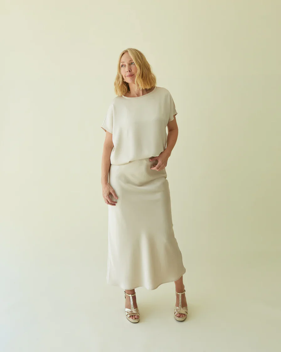 Bessy is a cap sleeve style top, in lovely satin fabric, a great fit for a smaller a frame, simple and stylish, simply team with our Maeve skirt or Thea pant.