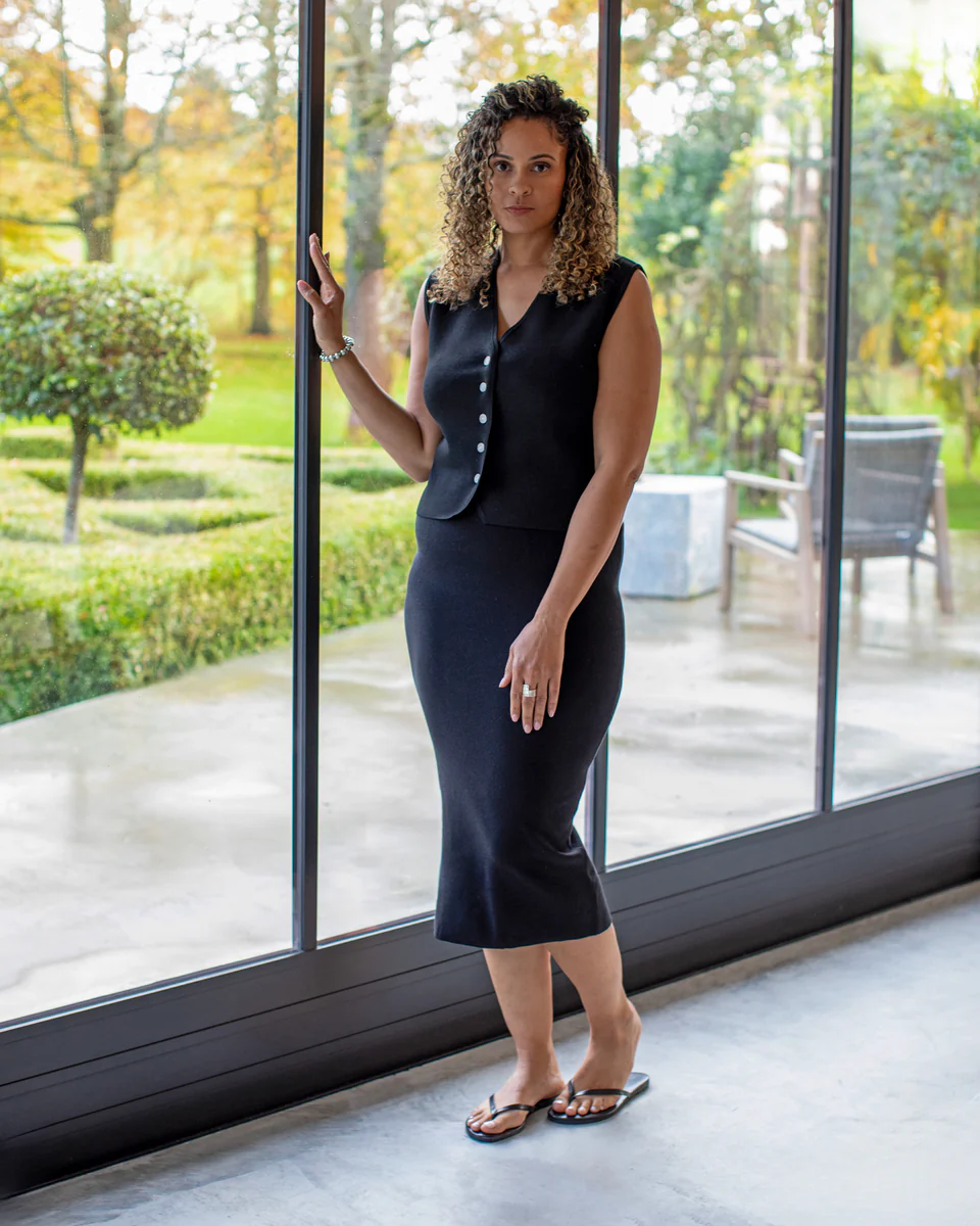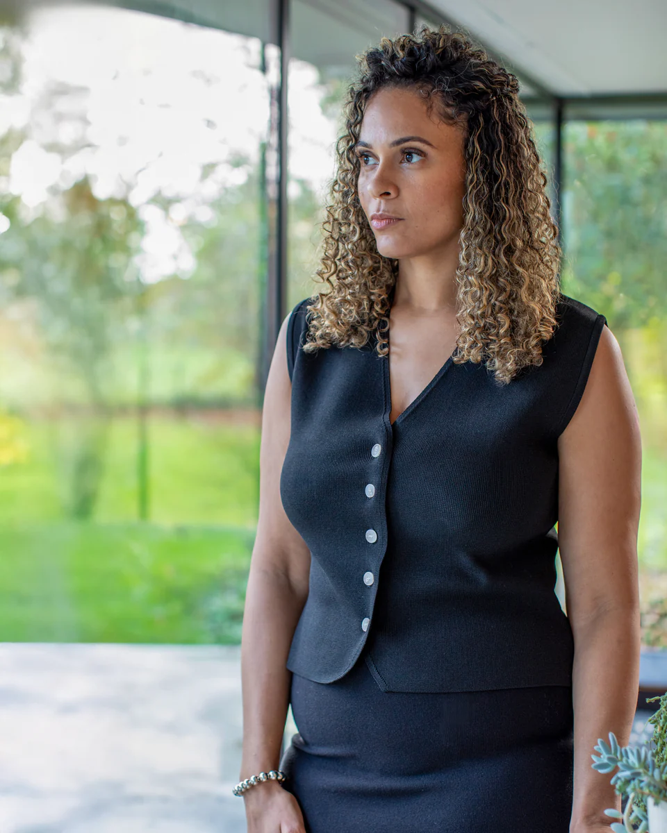 Peta is a V-neck, button up waistcoat, with a detailed front hem and rib arm hole. A structured fine knit that is super flattering and a strong contender for any spring / summer wardrobe.