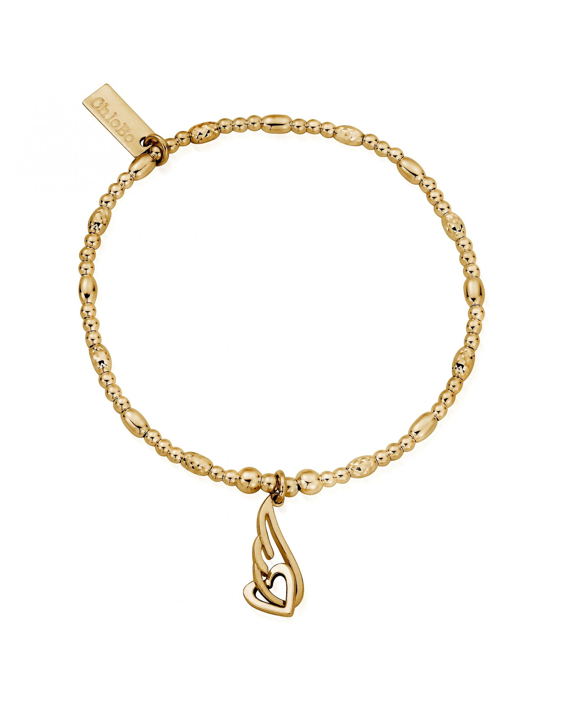 Introducing ChloBo's Interlocking Heart and Angel Wing Bracelet featuring an angel wing charm, interlocked with an open-heart charm.