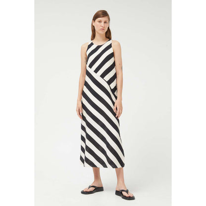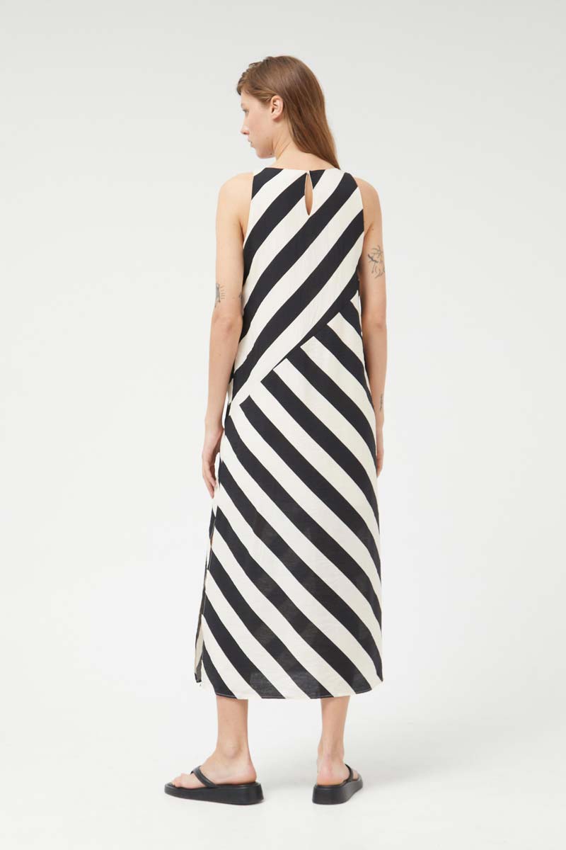 Long dress in crepe fabric with Cruela diagonal stripe print. With round neck and sleeveless. Back closure with slit and button. Inner lining. The model is 177 cm tall and wears size S.