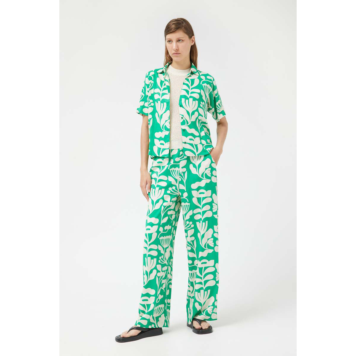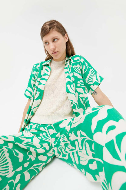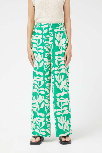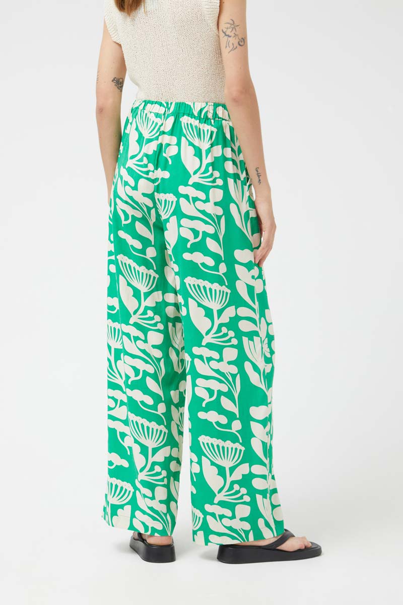 Long straight pants with Hortencia green floral print. With a mid-rise elastic waist and straight leg. Side pockets. The model is 177 cm tall and wears size S.