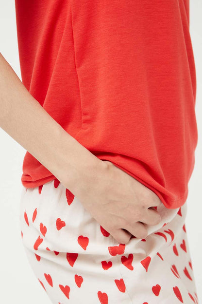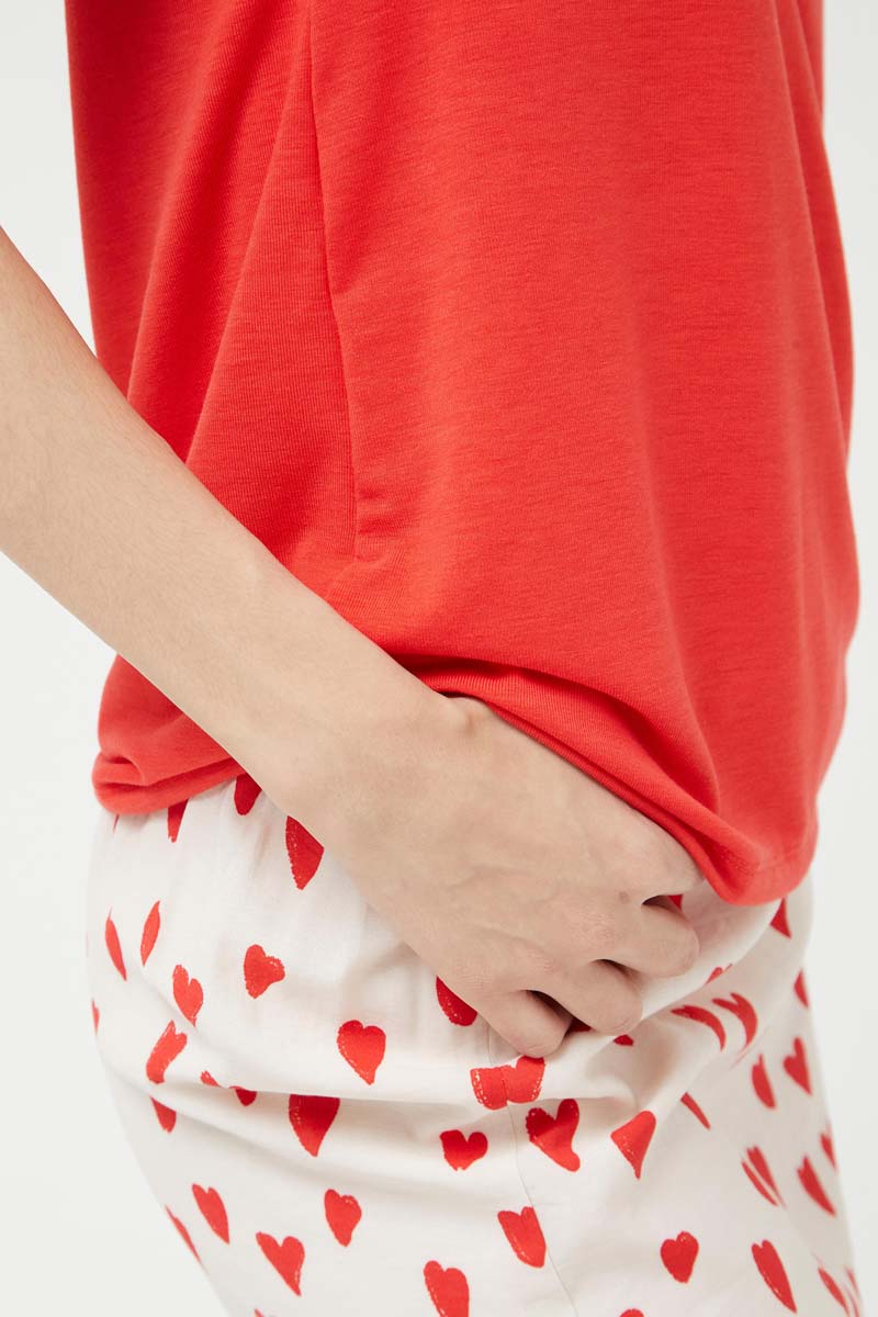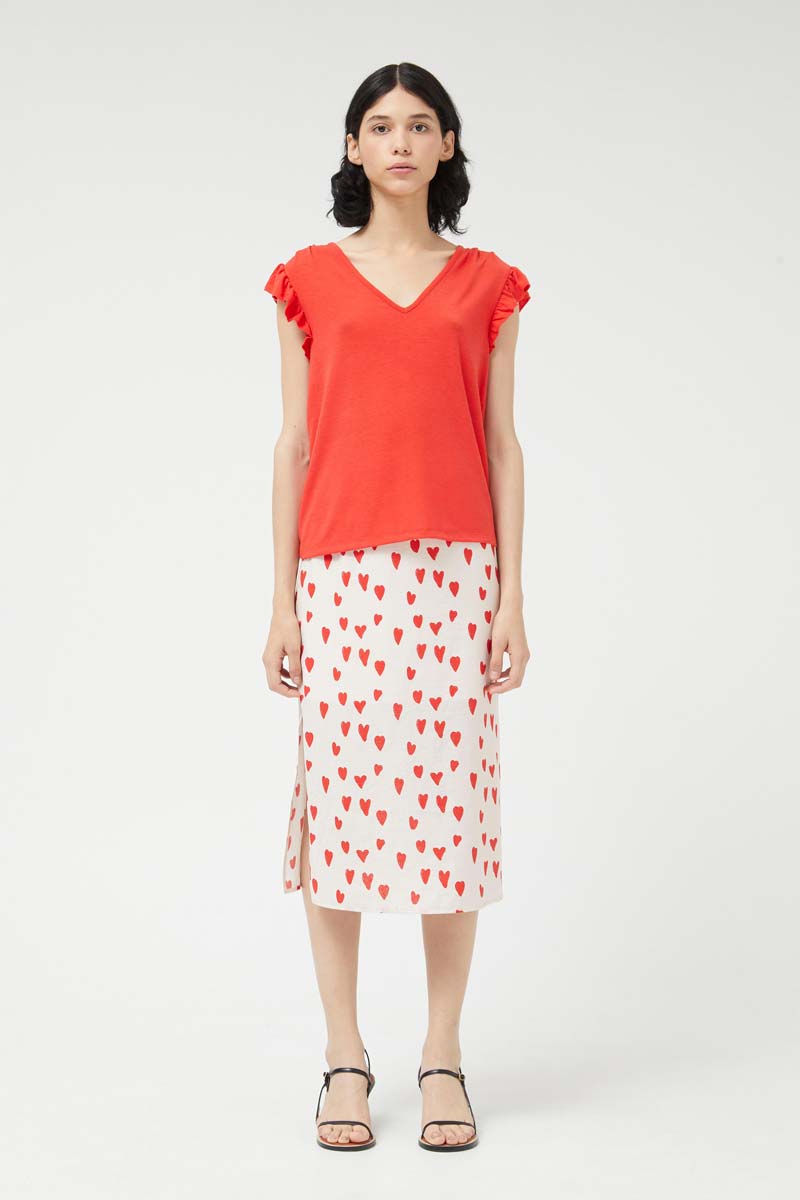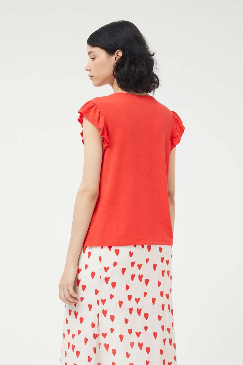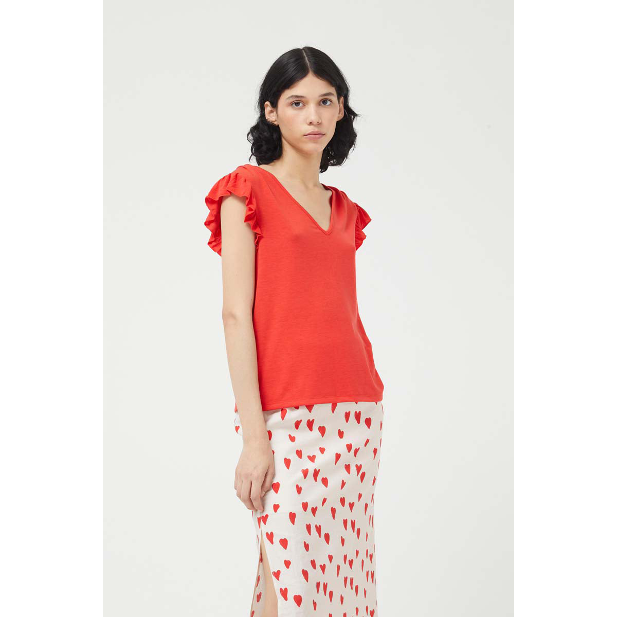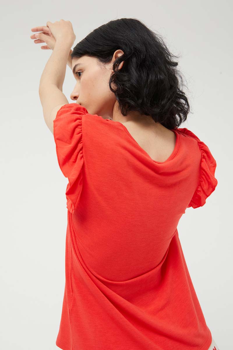 Top in red jersey fabric. With a V-neckline and short sleeves with ruffle detail. The model is 175 cm tall and wears size S.