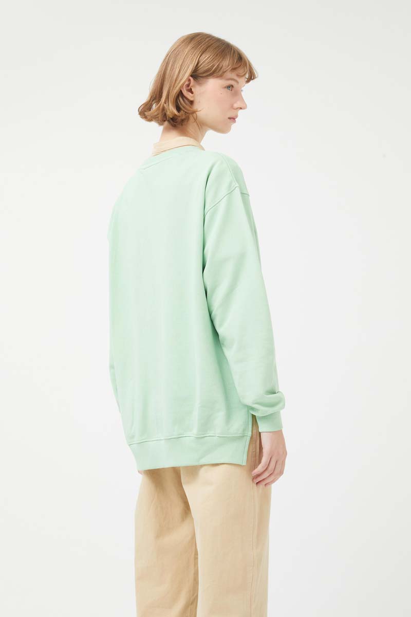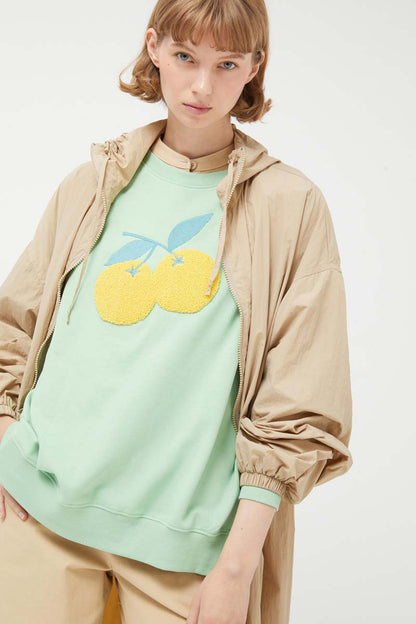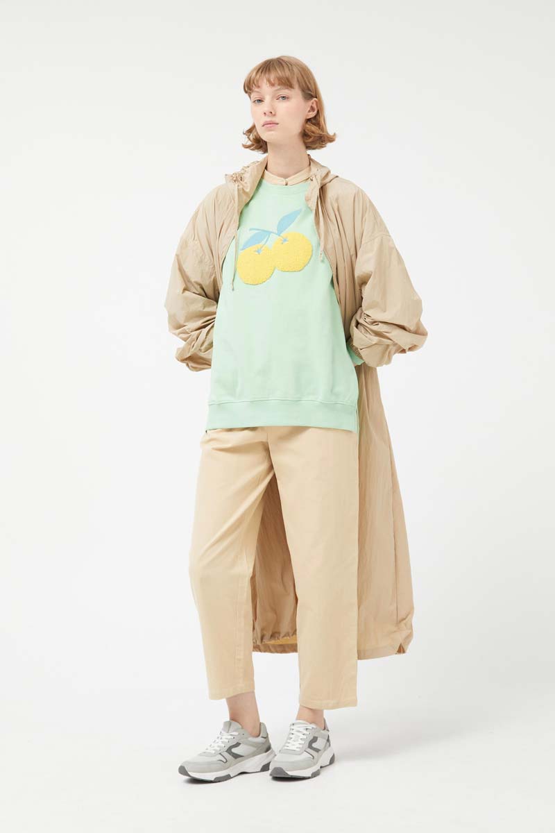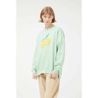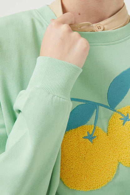 Cotton fleece sweatshirt with yuzu print. With a round neck and long sleeves, and finished with a ribbed cuff and hem. The model is 177 cm tall and wears size S.