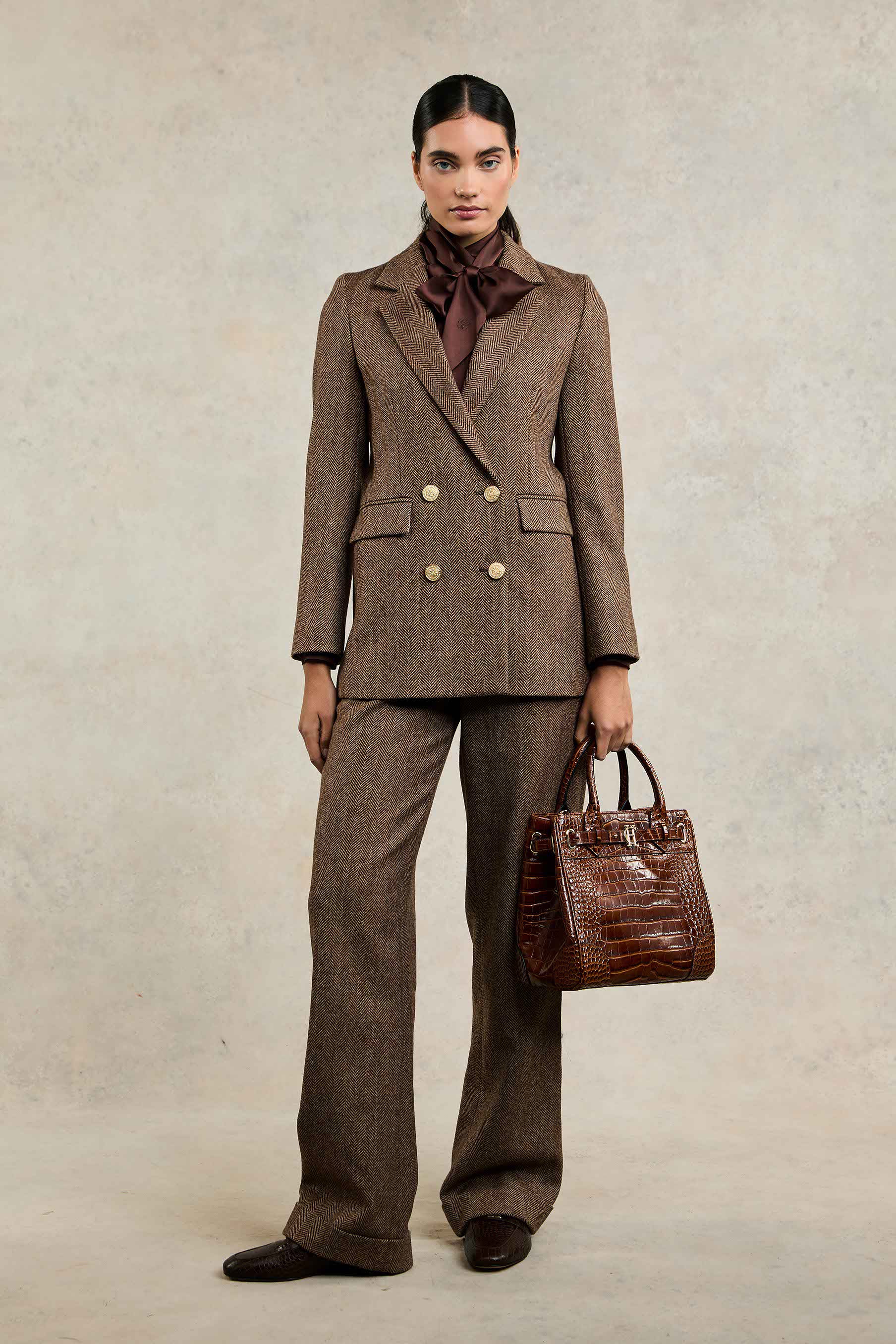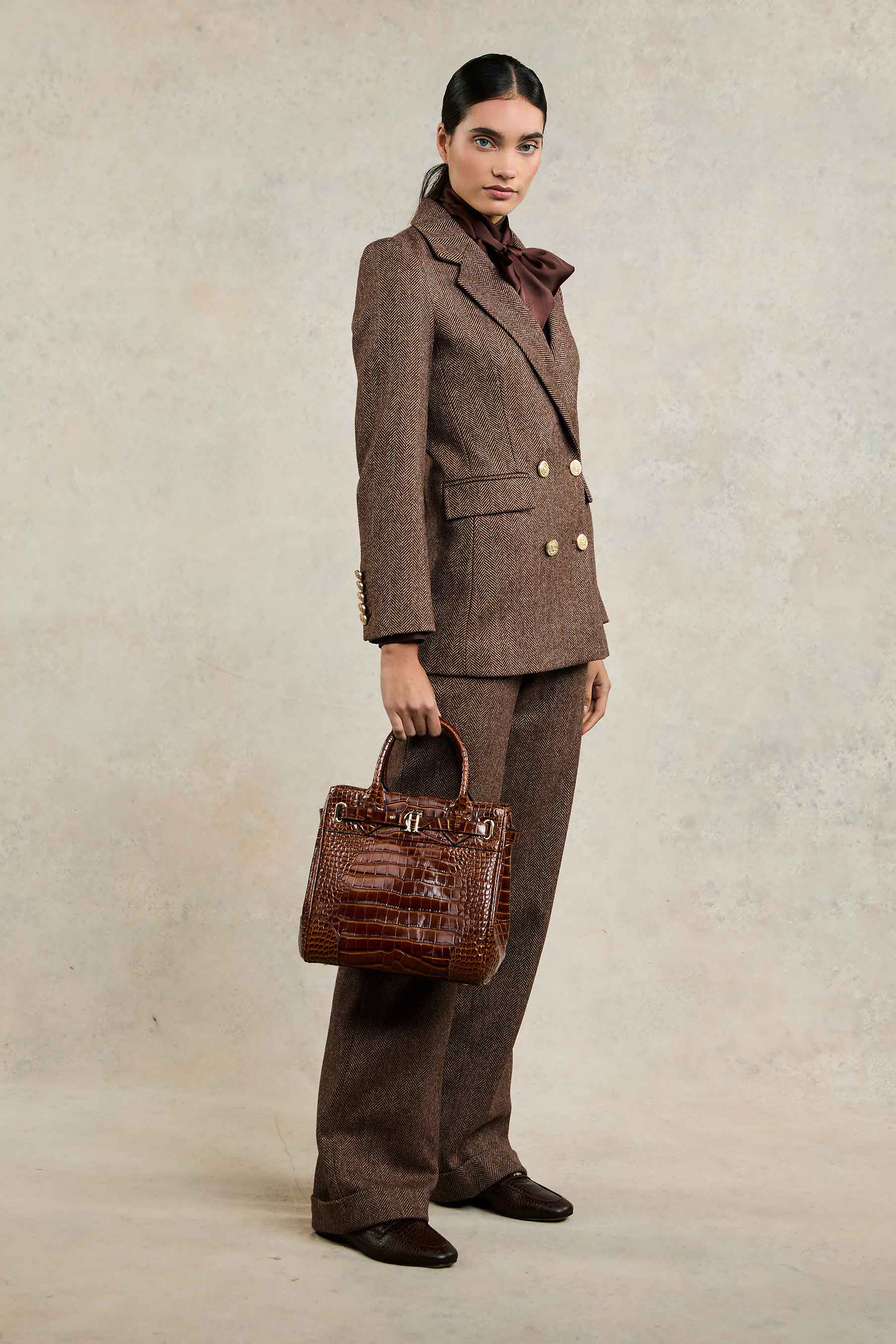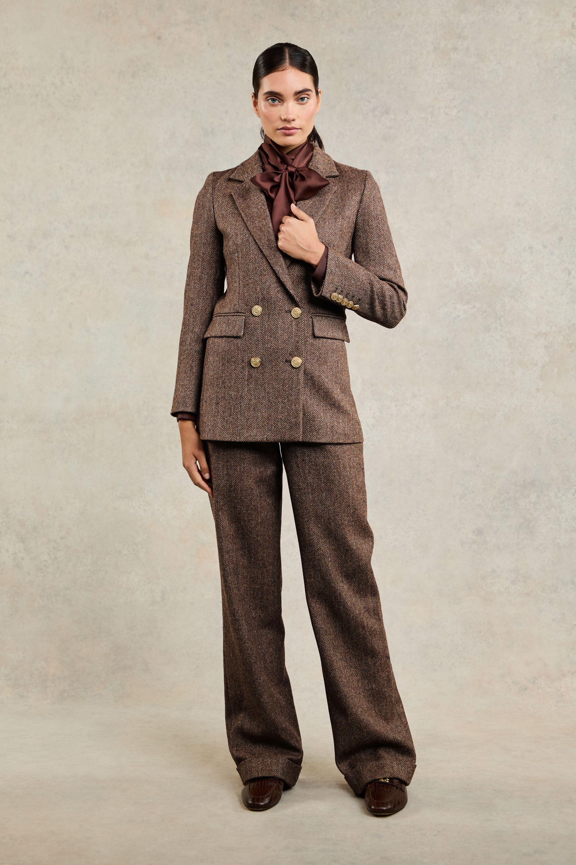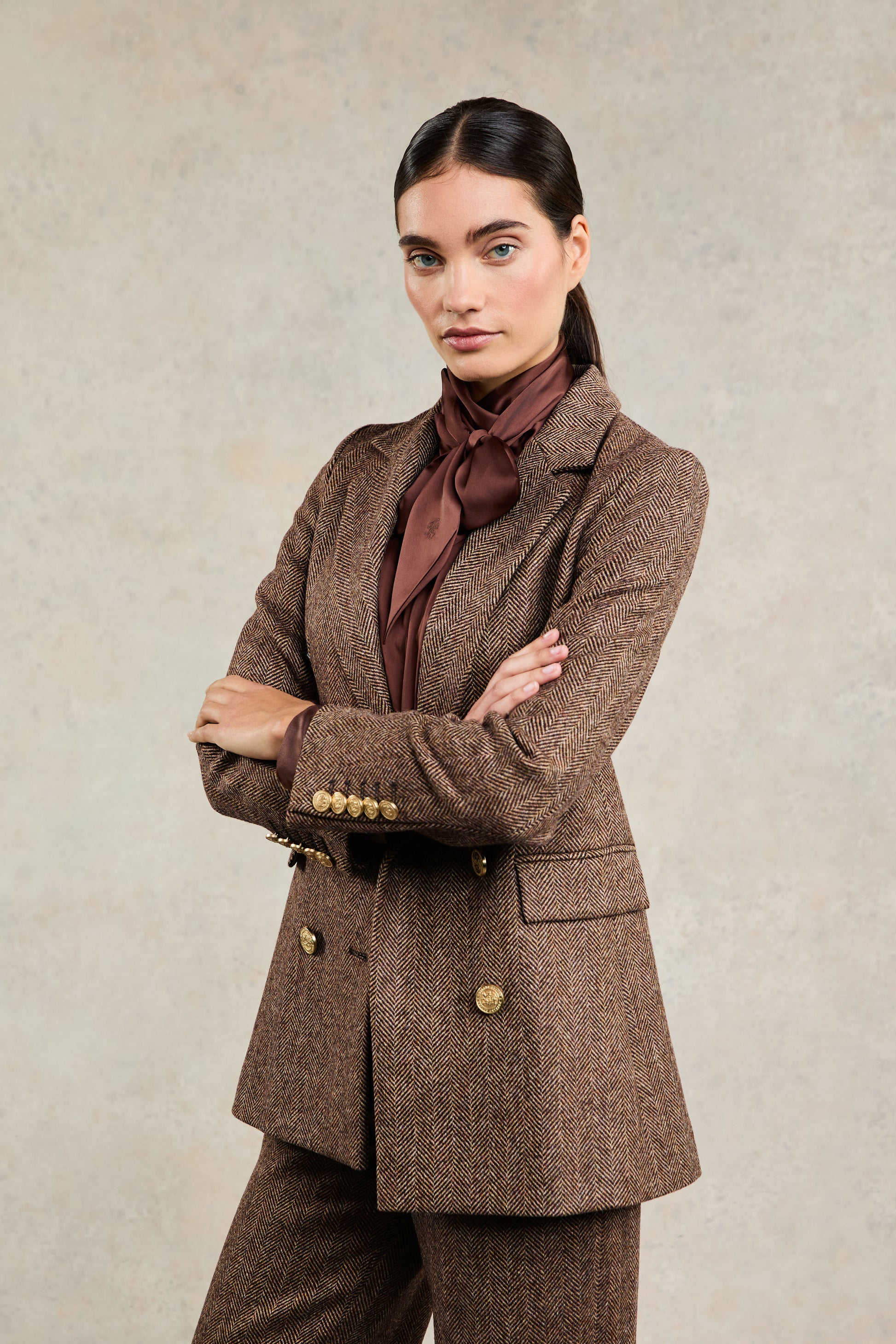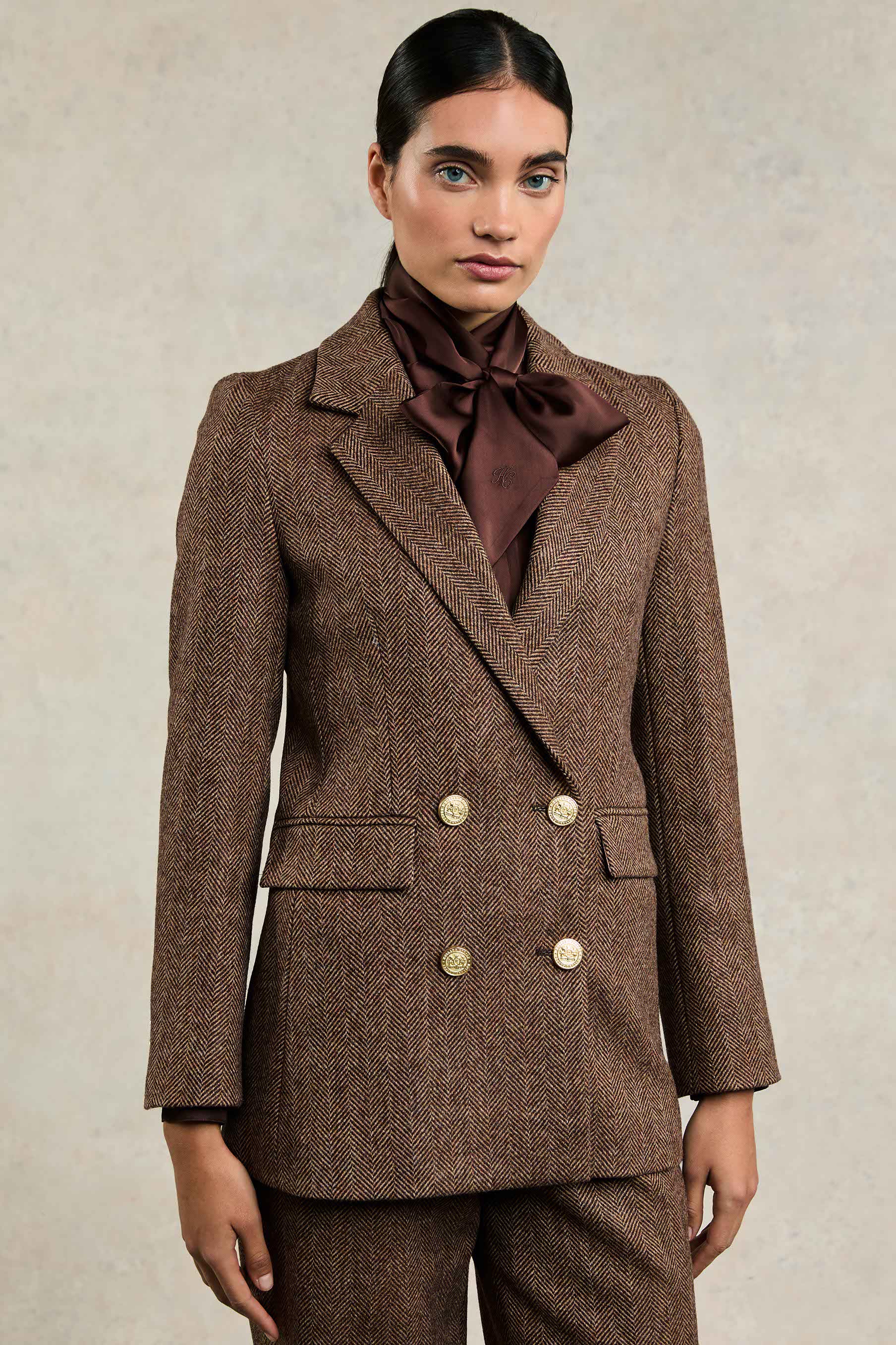 Designed to create a sharp tailored silhouette worn open or closed, the beautiful double-breasted wool blazer has been handmade in the UK. Crafted from a classic and contemporary tweed fabric, and fully lined with a luxury stretch lining for extra comfort, this piece is a must-have staple for your wardrobe. With bold lapels & subtle hip pockets, each blazer has been elevated with HC signature gold hardware to the front and cuffs.