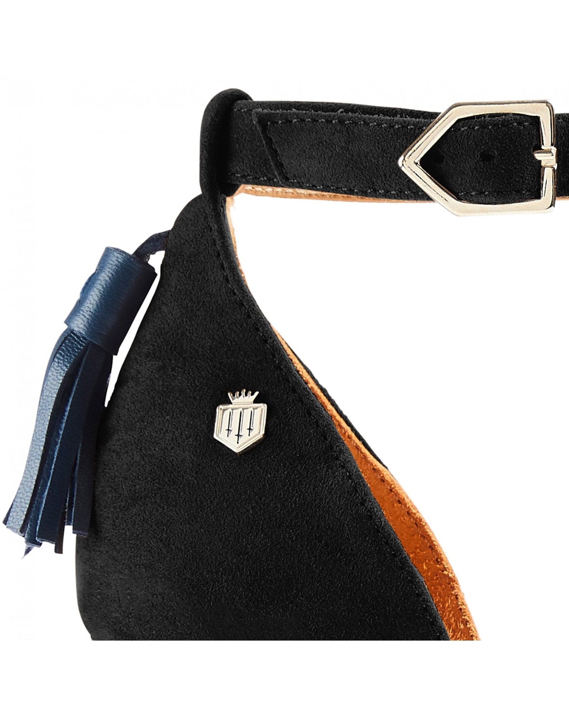 The Valencia wedges from Fairfax & Favor are made for floaty dresses and summer occasions. Created from luxuriously soft suede, they feature elegant cross-over straps, a peep-toe front and a charming woven jute sole. A mid-height heel and padded insole provide lasting comfort whilst Gold chevron buckles, shield detail and a contrasting navy tassel to the heel provide the finishing touches to these beautiful wedges.