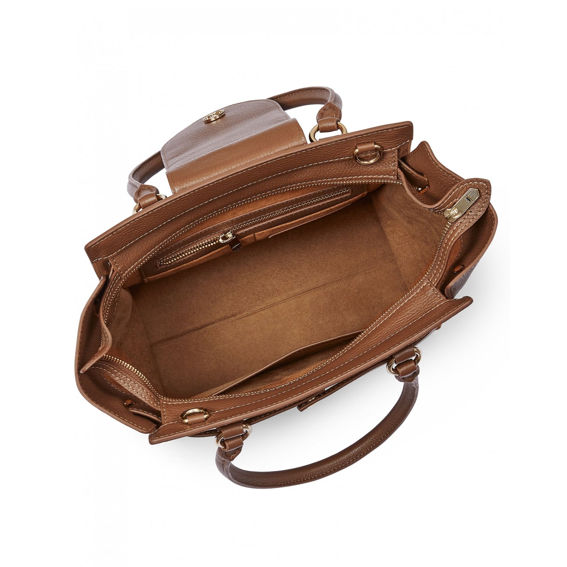 This exquisite Windsor Tote Handbag from Fairfax & Favor is created from full-grain pebbled leather and luxurious suede; an elegant tote bag featuring a large central pocket and two practical internal pockets. Detailed with Fairfax's iconic interchangeable handbag tassel, and branded gold foil embossing to the front. A brass studded bottom for protection provides the finishing touches to this timeless handbag.