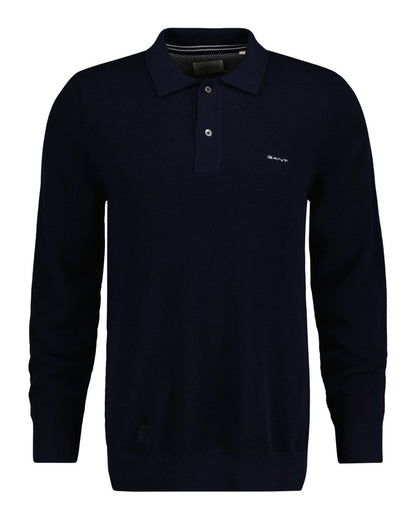 Experience timeless luxury with the Gant Cotton Pique Polo Sweater. Crafted with long sleeves, a straight cut, and a collar complete with a short placket, this Evening Blue sweater is equally as stylish as it is comfortable. Waist and sleeves finished with elastic cords and embroidered branding give this classic piece a modern twist. Upgrade your wardrobe today!