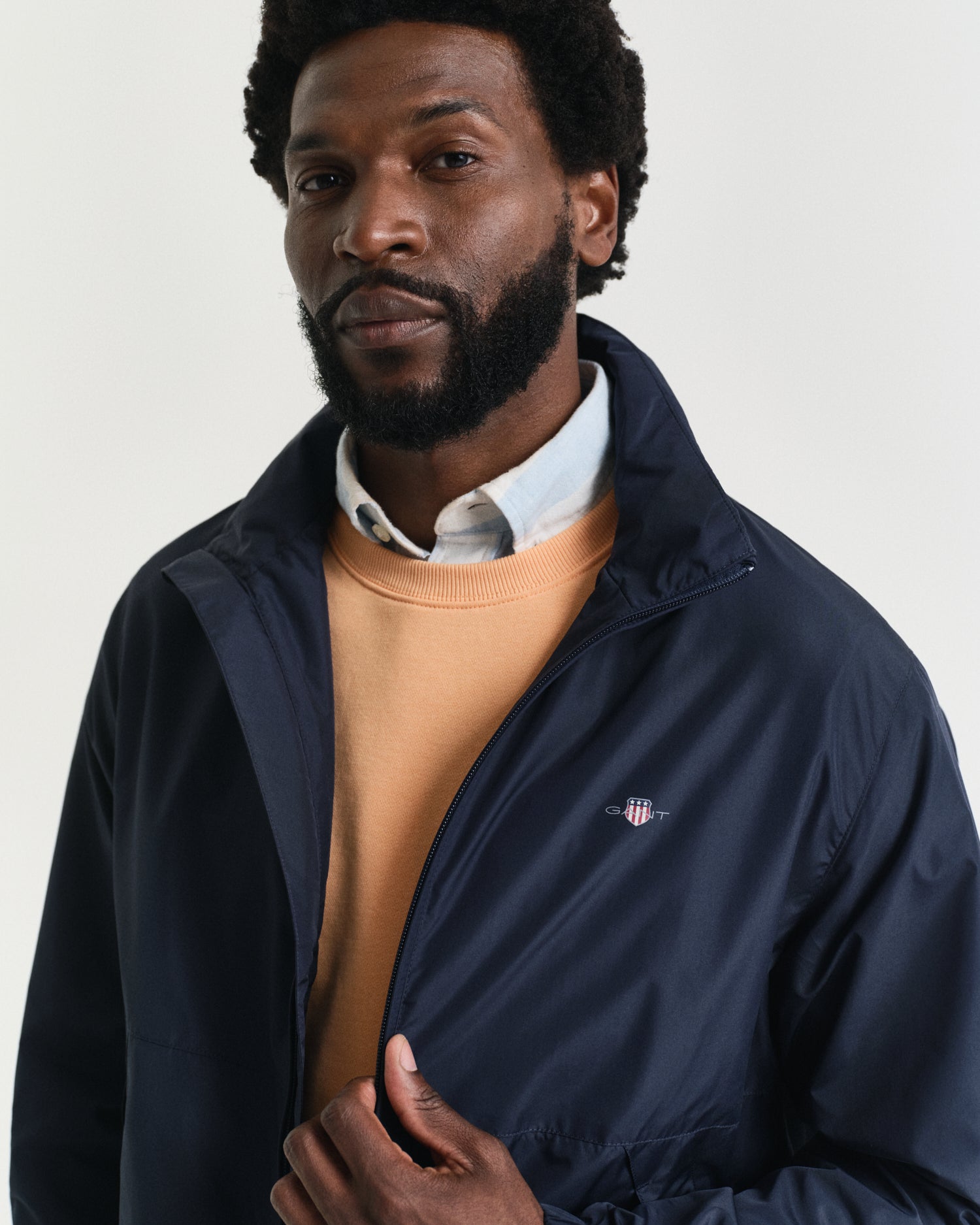 Crafted from 100% recycled polyester and treated with a water-repellent finish, this lightweight windbreaker jacket is perfect for transitional weather. Designed for a regular fit that sits just above the hips, the jacket is fully lined for added comfort. It features a front zip closure, side zip pockets, and a convenient emergency hood tucked into the collar. The design is finished with a reflective GANT logo print at the chest, adding both style and visibility. This product is made with recycled polyester, aligned with GANT's sustainability strategy to support circularity. This jacket features a Durable Water Repellent (DWR) treatment which will help to shed water in light weather conditions. If you're unexpectedly caught in a downpour, please follow the care instructions closely to restore the performance and prolong the life of this garment