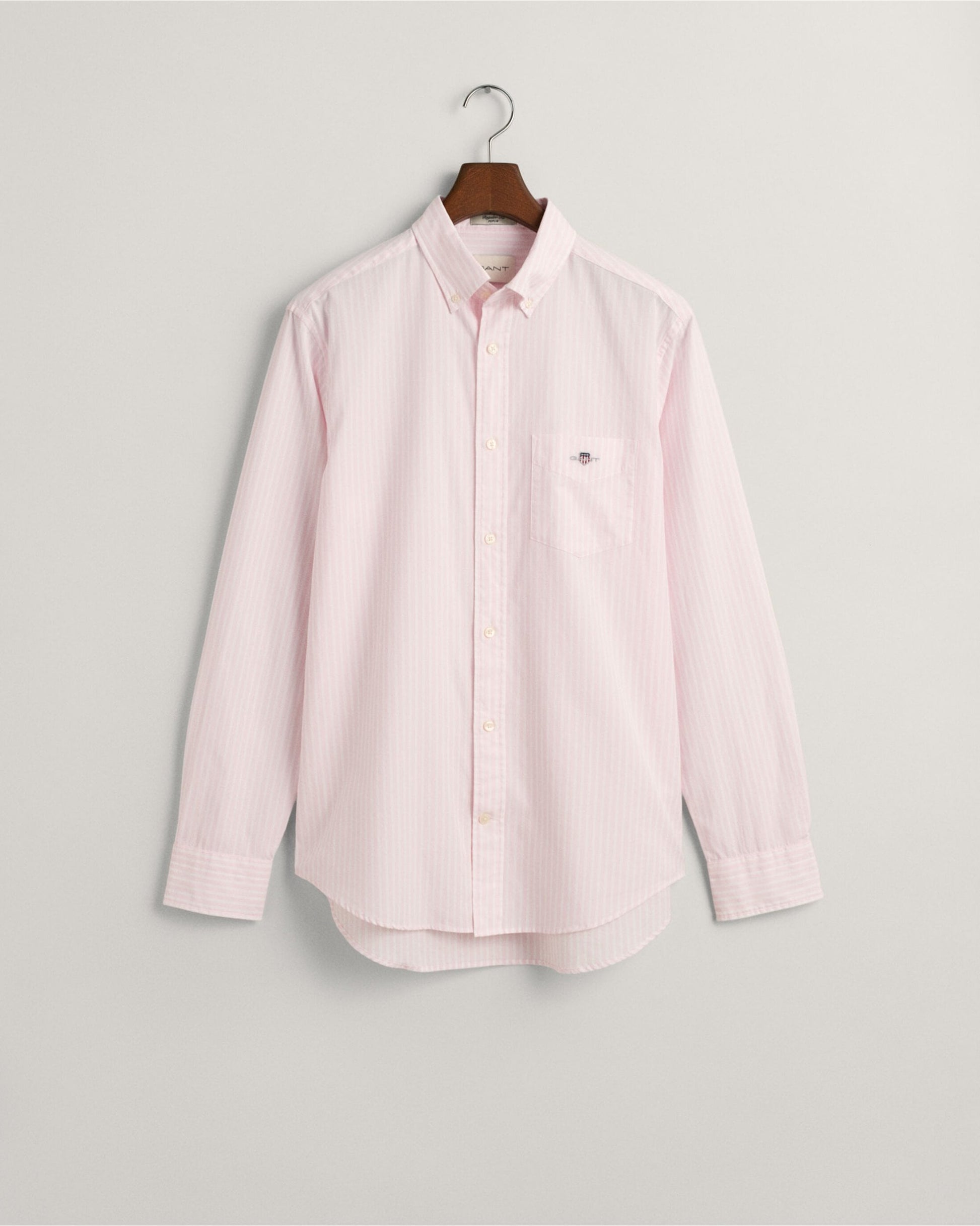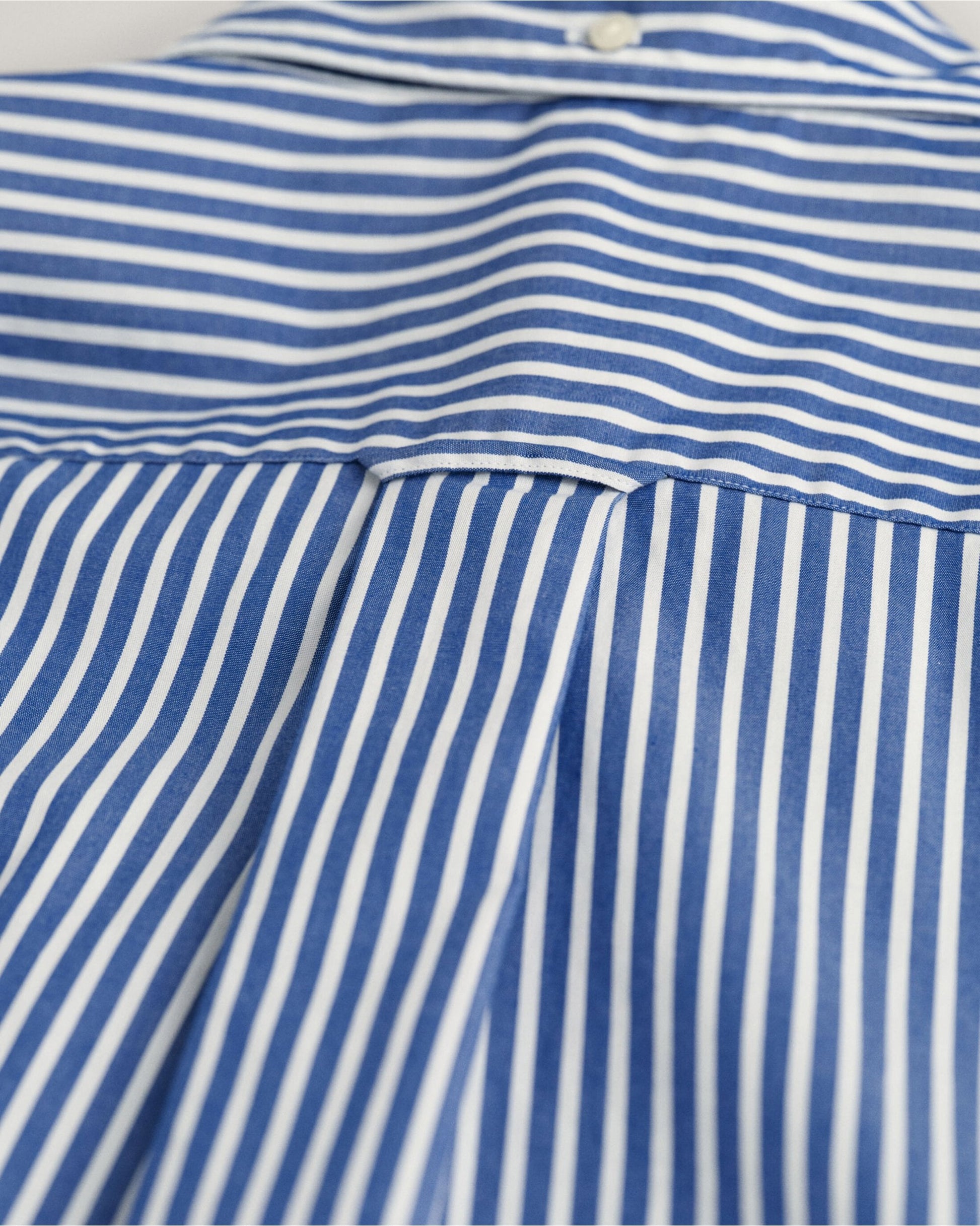 Featuring an 80s archive-inspired shield graphic with retro appeal, this GANT Regular Fit Striped Poplin shirt features a classic, all-over vertical stripe throughout the garment. A preppy essential for any business-casual wardrobe, wear it with tailored pants and an elevated shoe for an upscale look.