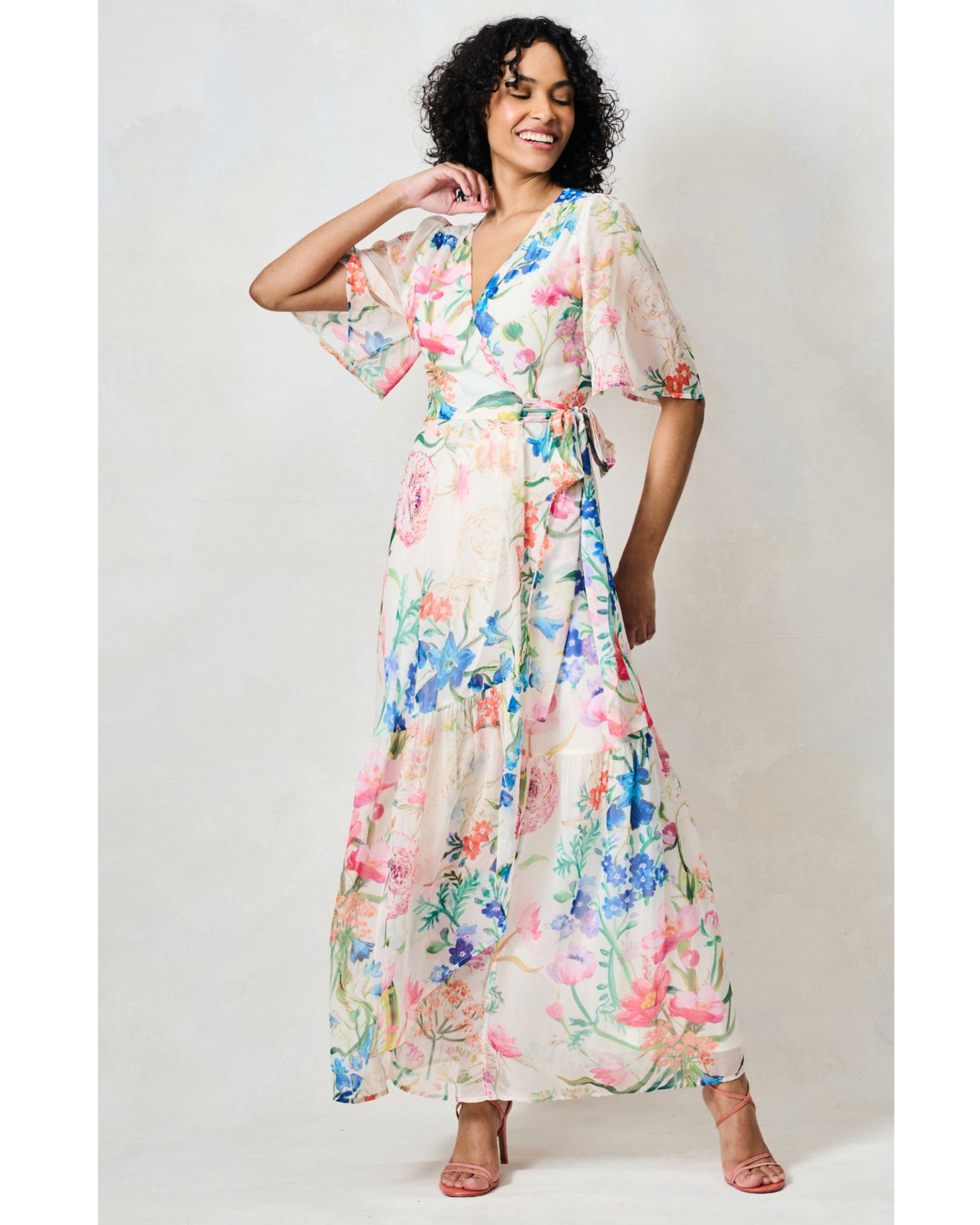 The Michelle is a soft, romantic wrap that brings effortless charm to early spring. Flutter sleeves and a flowing maxi skirt create a feminine, easy shape, while the waist tie ensures a flattering fit every time. In a cream multi print, this dress feels light, uplifting and ready for the first outdoor lunches and weekend gatherings of the season.