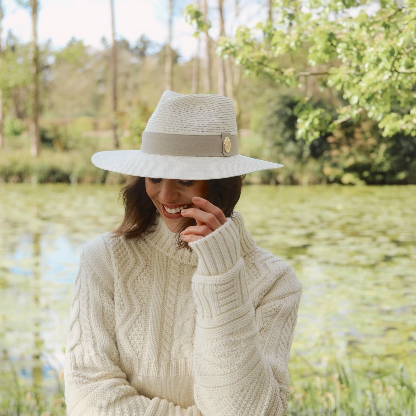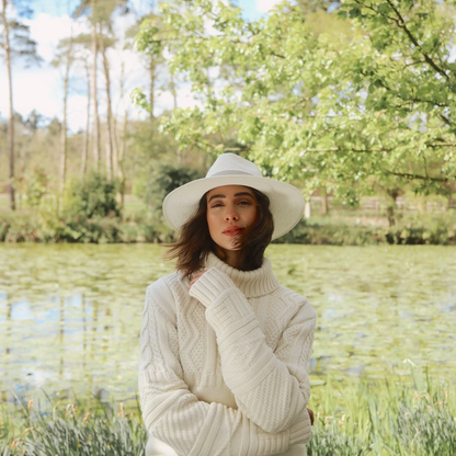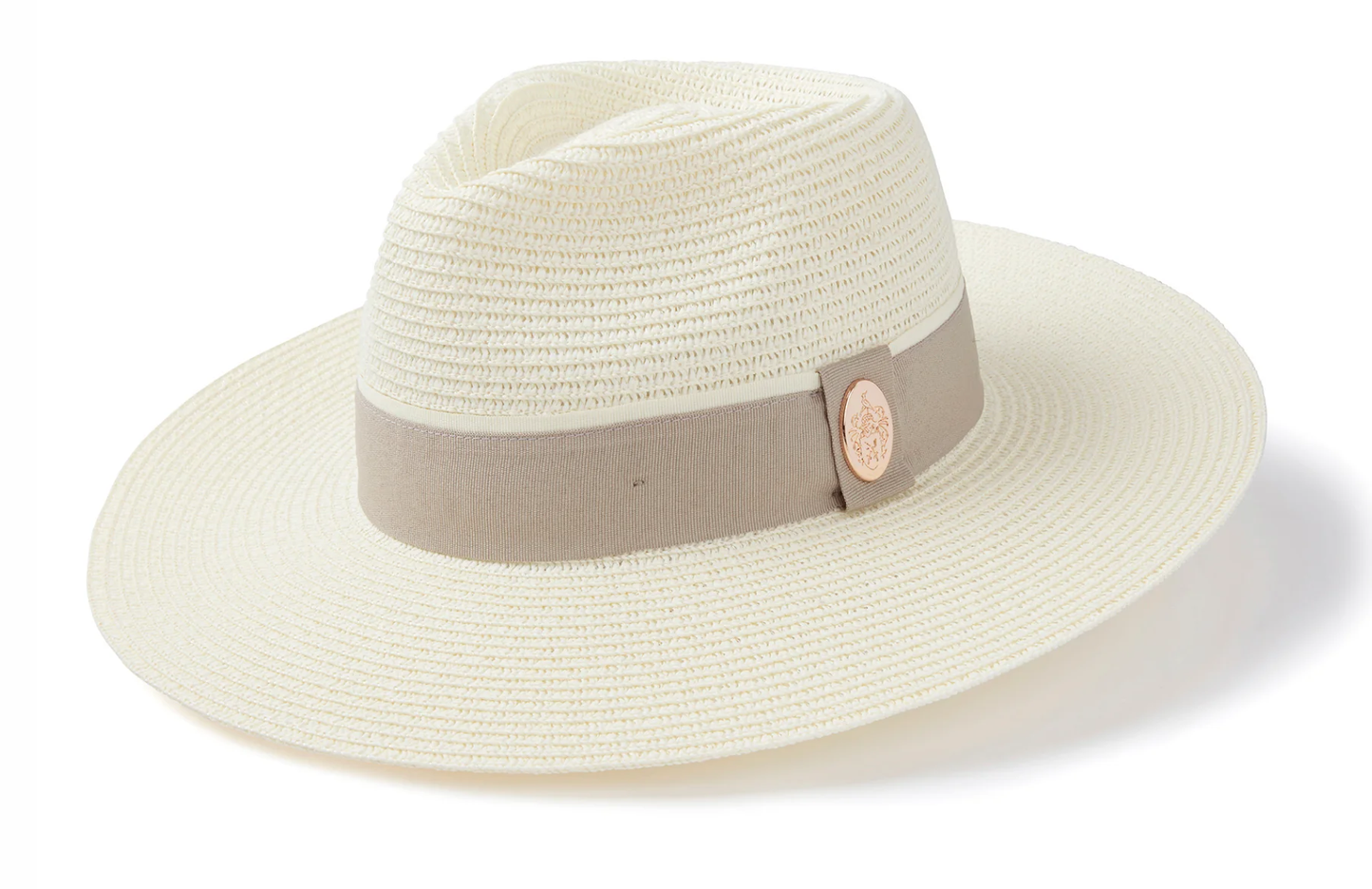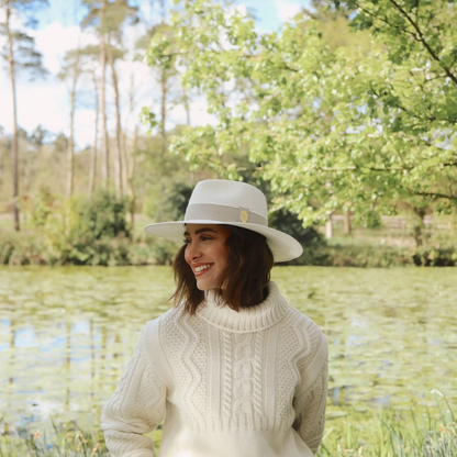 The Hemley Fedora boasts a wide brim, making it a lighter and more breathable summer hat choice for hot weather, gardening, beach trips, or just keeping the sun out of your eyes in style. The hat is completed with a pebble-coloured ribbon band, detailed with a gold crest logo, and trimmed with a contrasting cream edge.