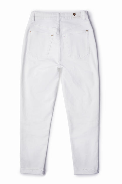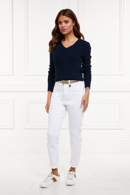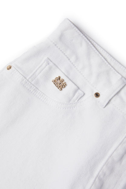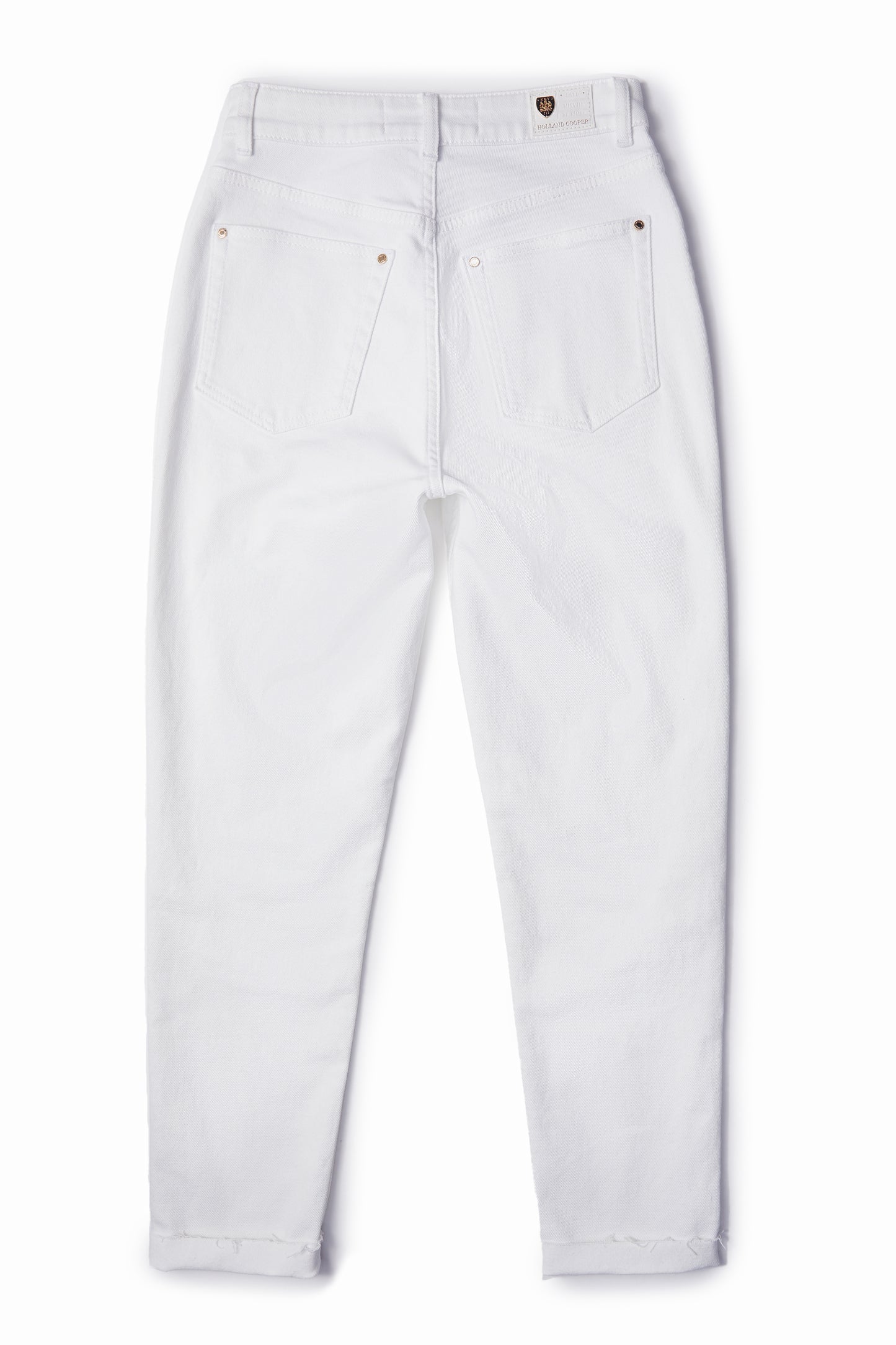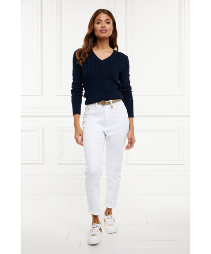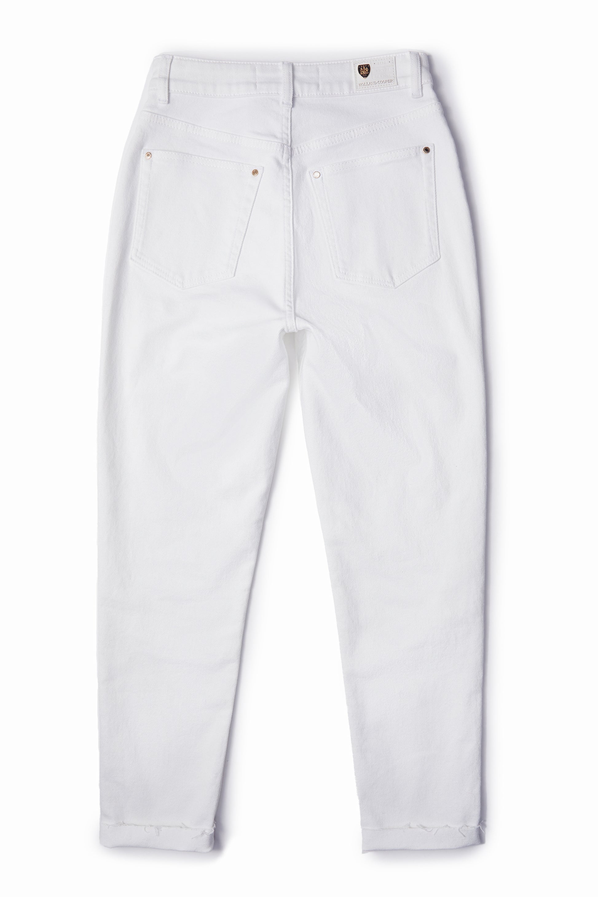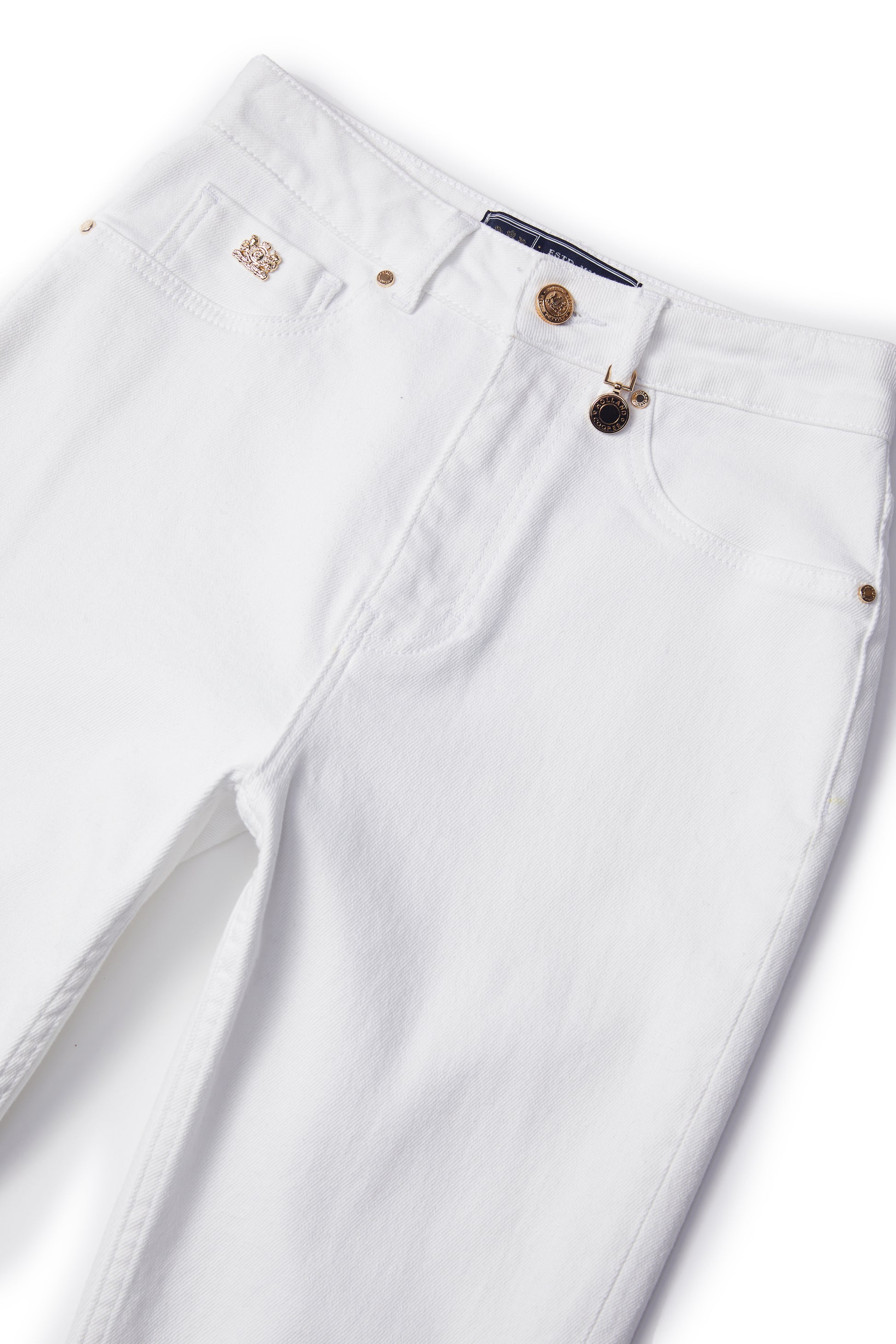 Designed with a classic high waist and slim leg, these jeans have been created from a comfortable stretch denim. Detailed with a traditional five pocket styling with a delicate gold crest to the coin pocket, the raw hem adds to their laid back style. With sewn indicators for Short, Regular, and Long leg lengths, tailor these jeans to be the perfect fit for you. Finished with our iconic hardware and new style leather jacron.