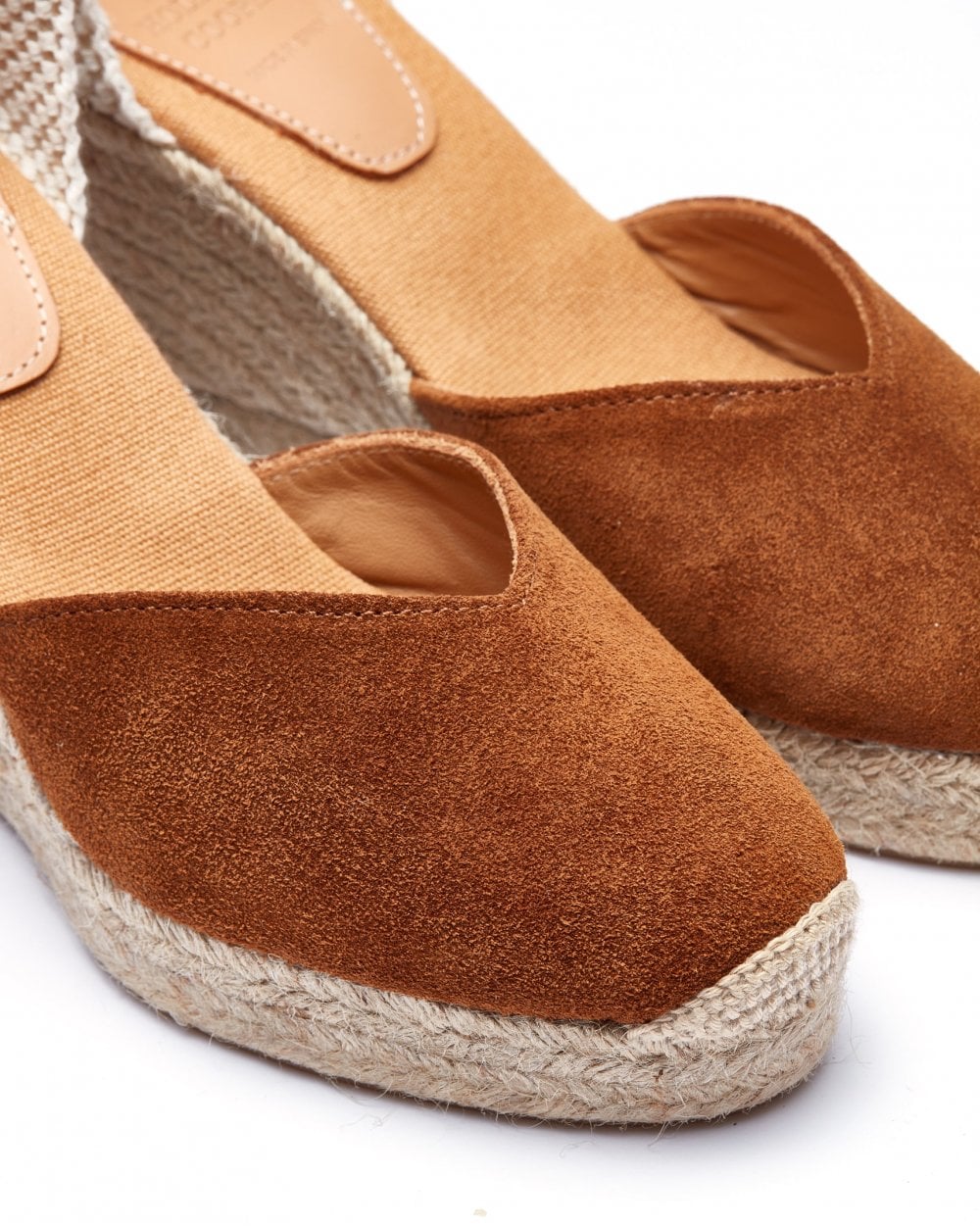 - Material: Upper is mix of cow suede and natural canvas at heel