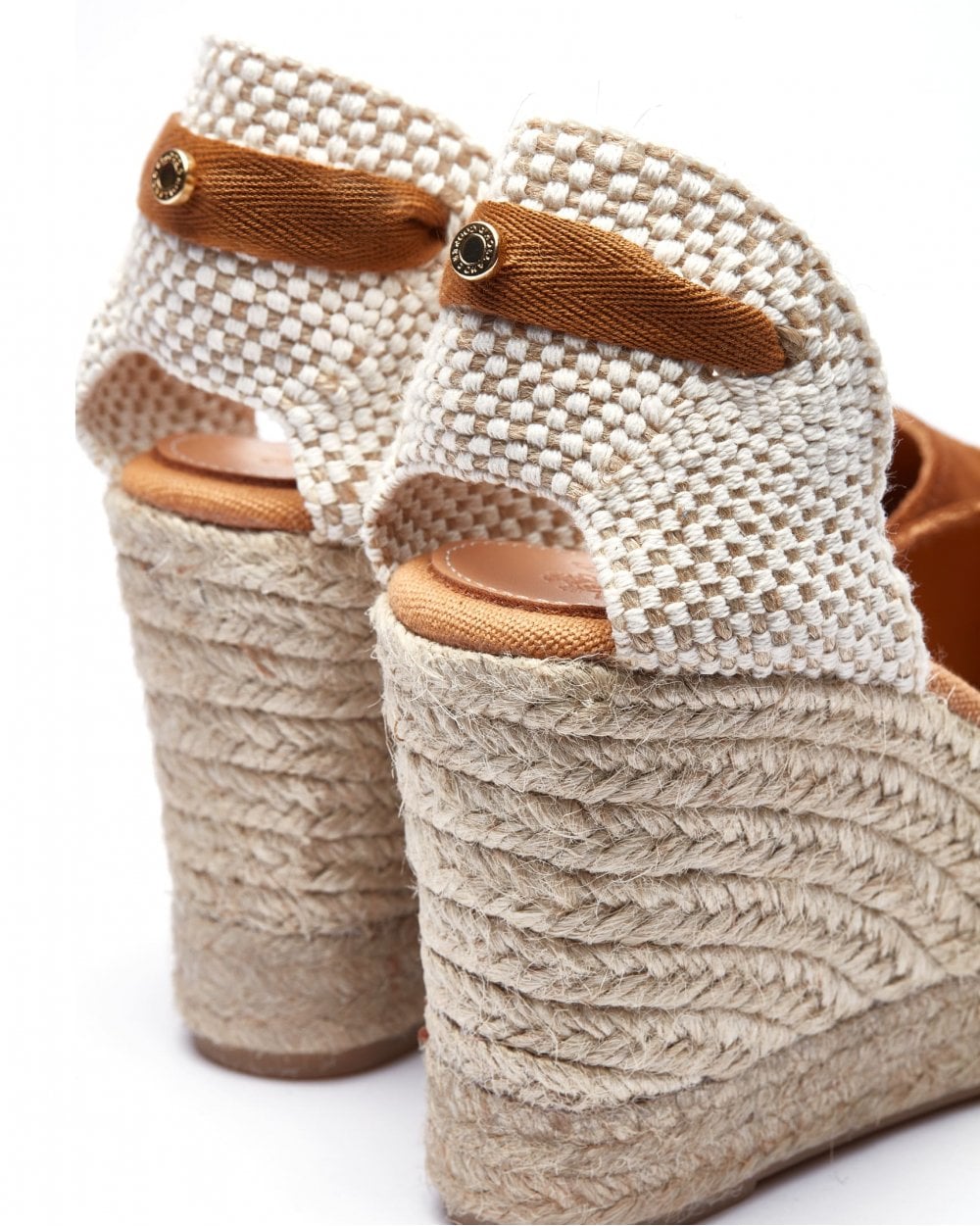 Crafted in Spain from a natural canvas and set on a 4 inch braided jute wedge, the slight platform balances and ensures comfort when worn. Designed with almond shape toes and detailed with long lace ties that crisscross and neatly fasten at the ankle. Finished with a gold rivet to the heel.