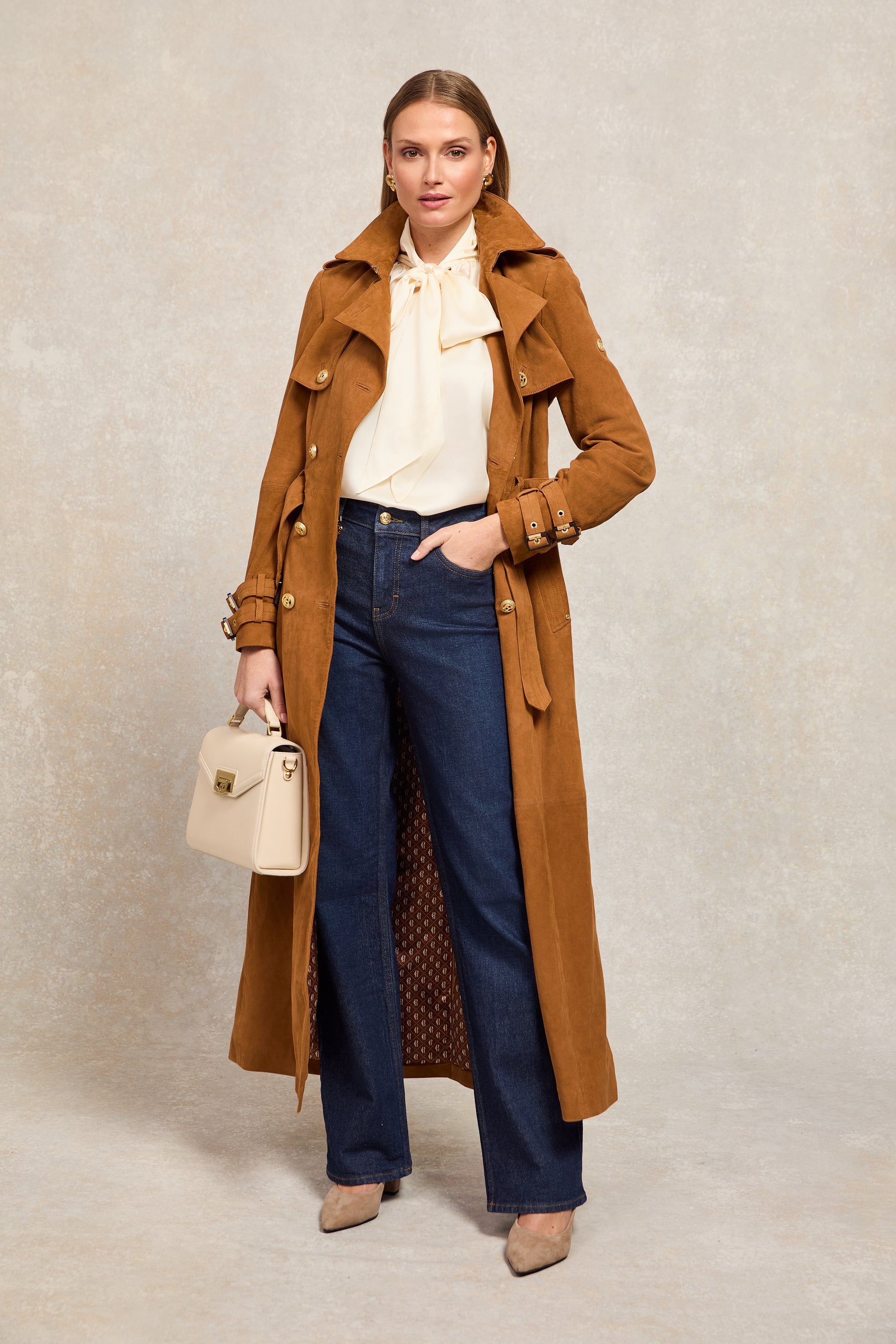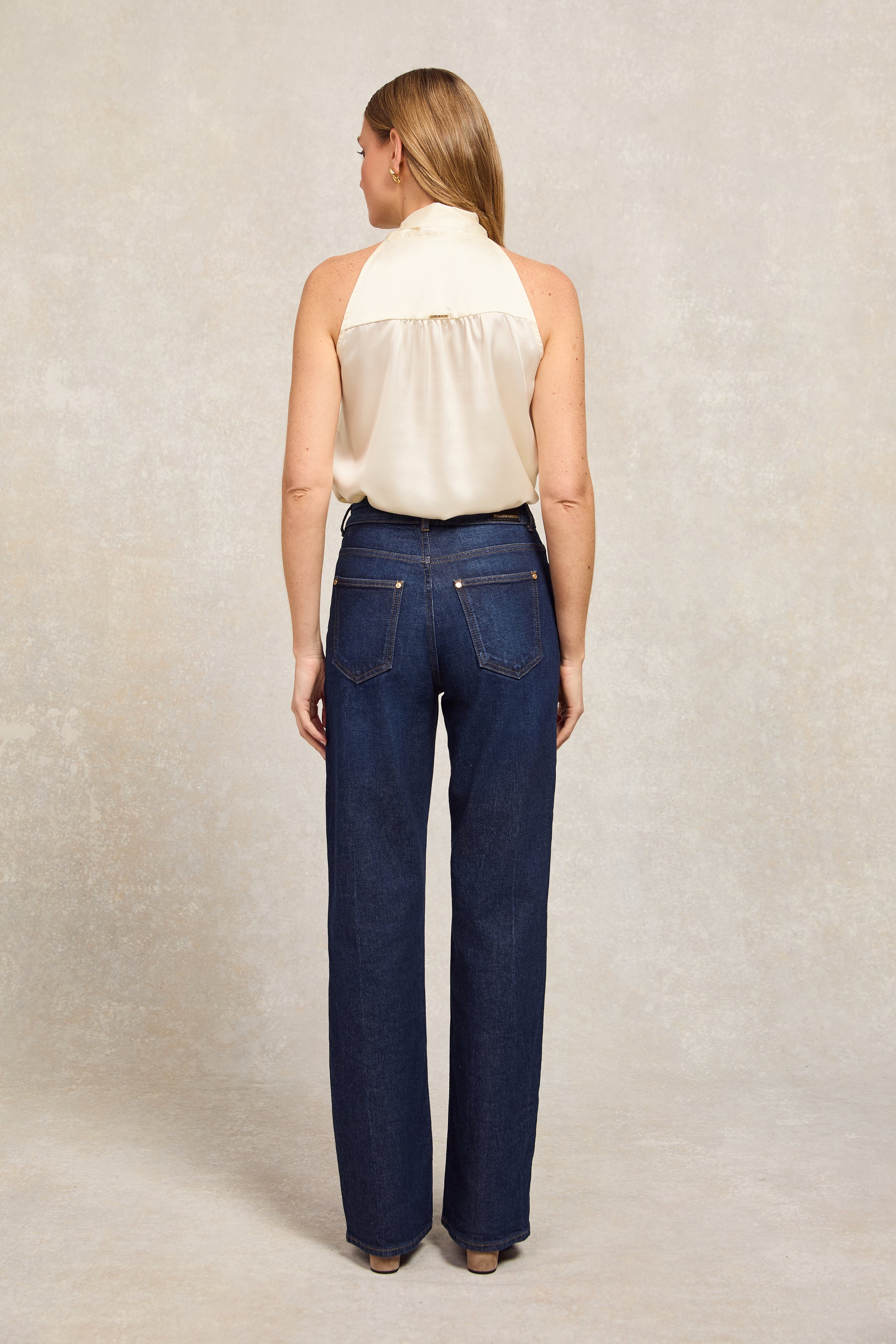 These jeans feature classic five-pocket styling and a single-shank waistband closure, ensuring a secure and comfortable fit. Adorned with signature gold hardware, they boast a high-rise design that accentuates them beautifully. Crafted for elegance, the jeans offer a long, straight leg with an outward seam for a retro-inspired silhouette. The leg width strikes the perfect balance - not too wide, not too slim - delivering a vintage feel with modern comfort. Whether you dress them up or down, these jeans are a versatile staple that exudes effortless style.