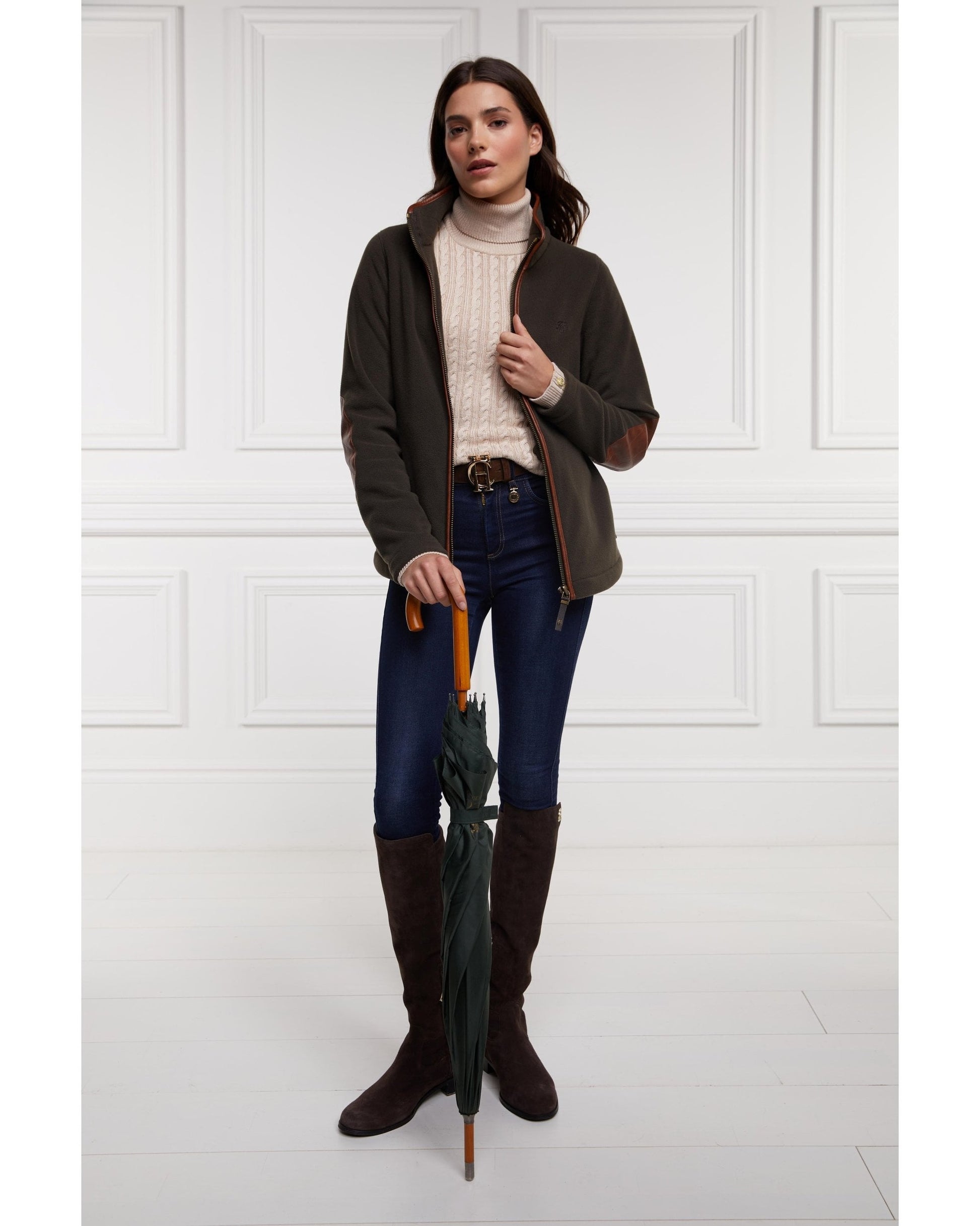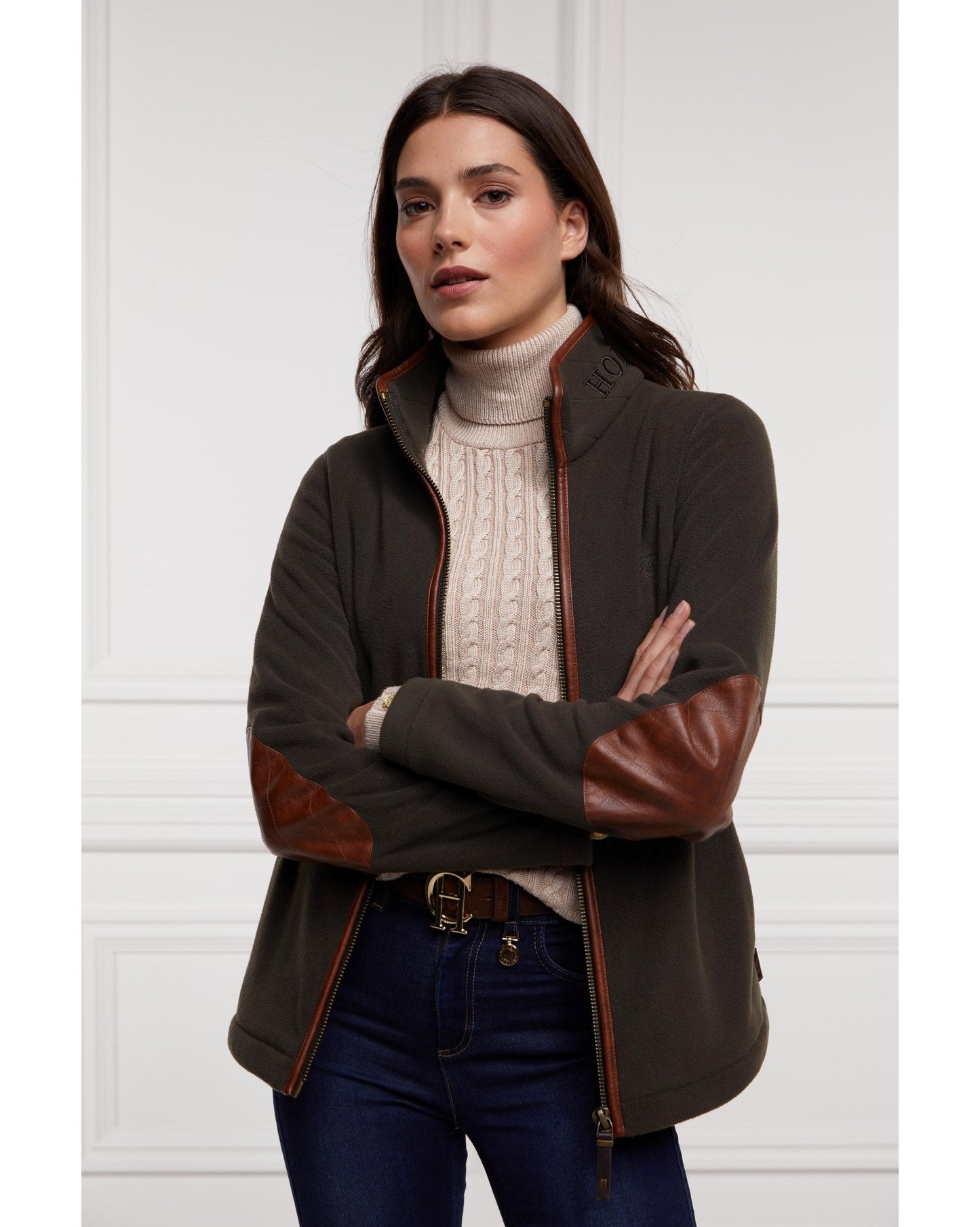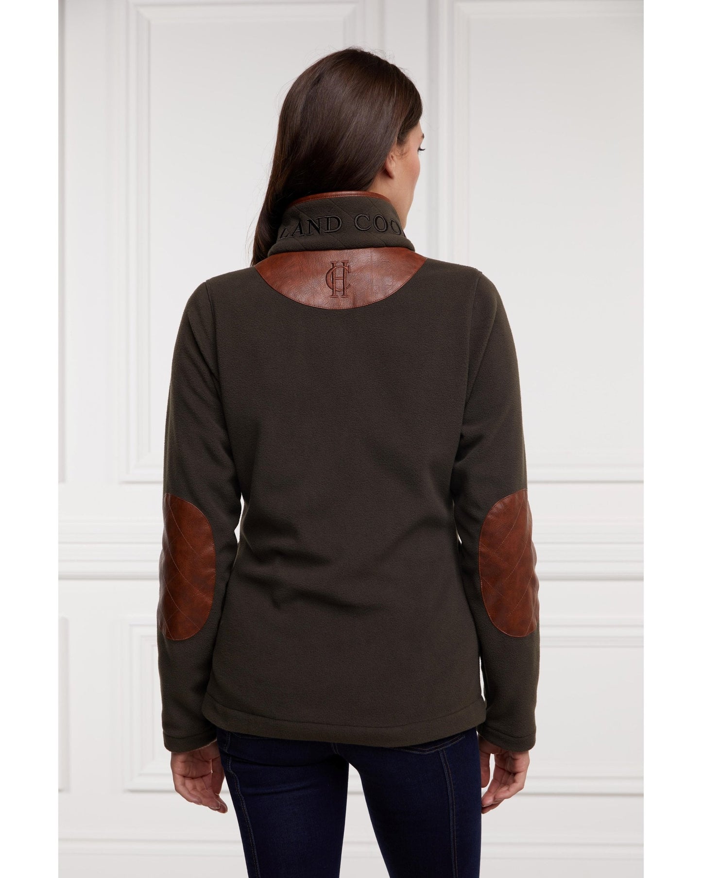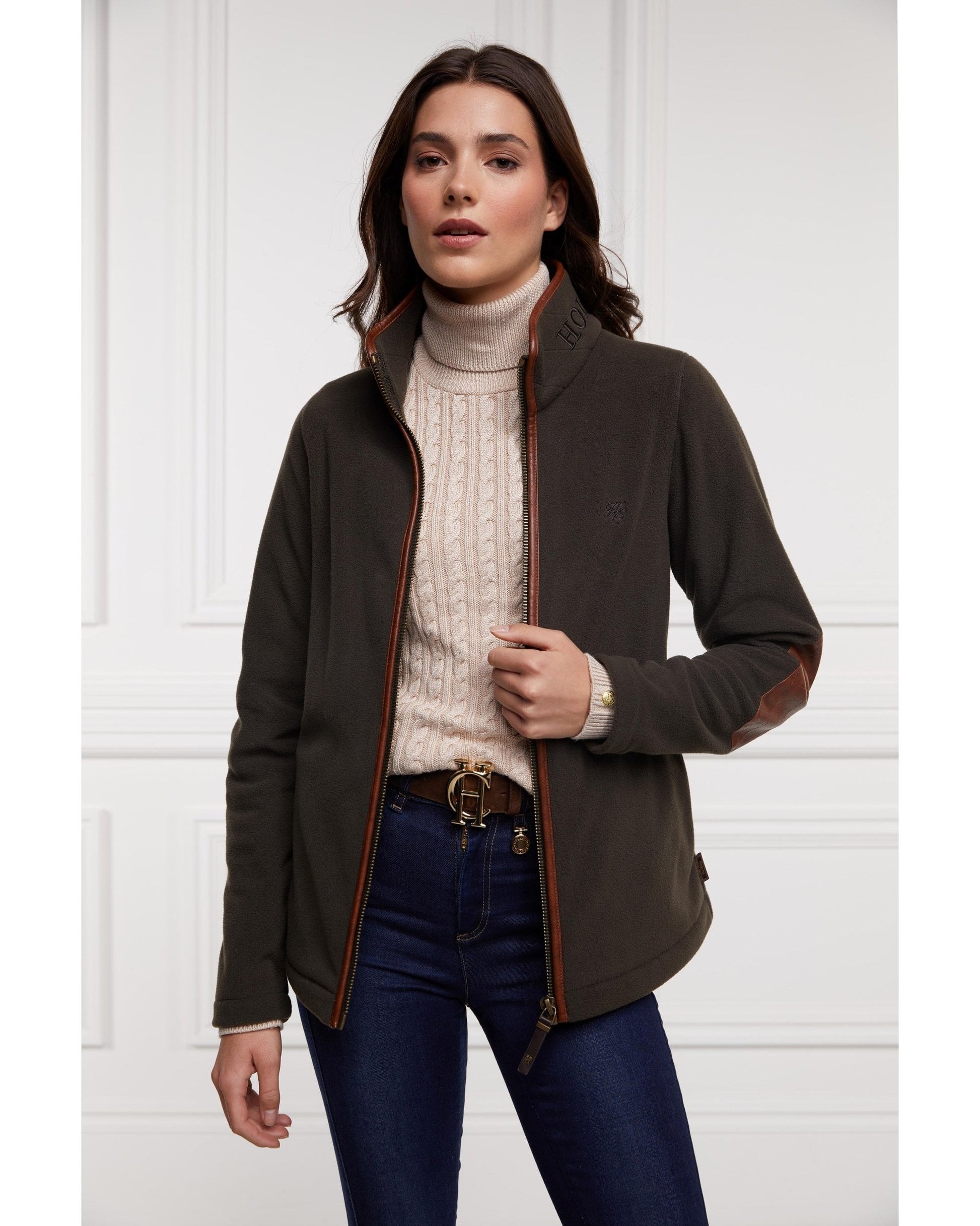 Designed with a slim fit & sculpting silhouette, this Holland Cooper Country Fleece Jacket has been created from cosy polar fleece fabric. With contrasting faux leather trims & elbow patches, this piece has a true classic country feel. Detailed with side entry pockets & finished with a Holland Cooper embroidered back yolk.