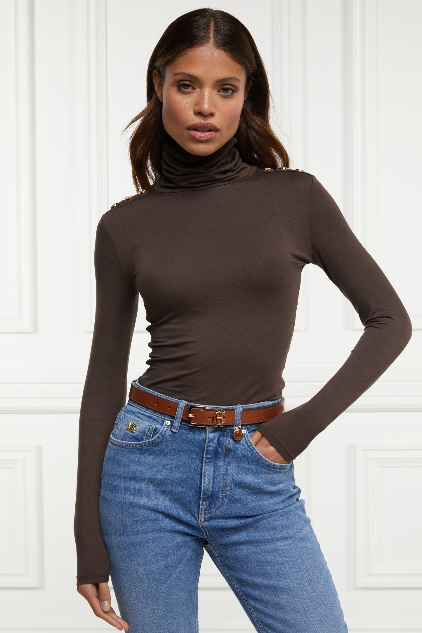 The perfect every day essential, designed to keep you both feeling warm and looking great. Made with a classic roll neck, this knit is one you will be reaching for year after year. Crafted from a superior knitted viscose for a flawlessly smooth fit adorned with our iconic HC crested gold rivets to the shoulders.