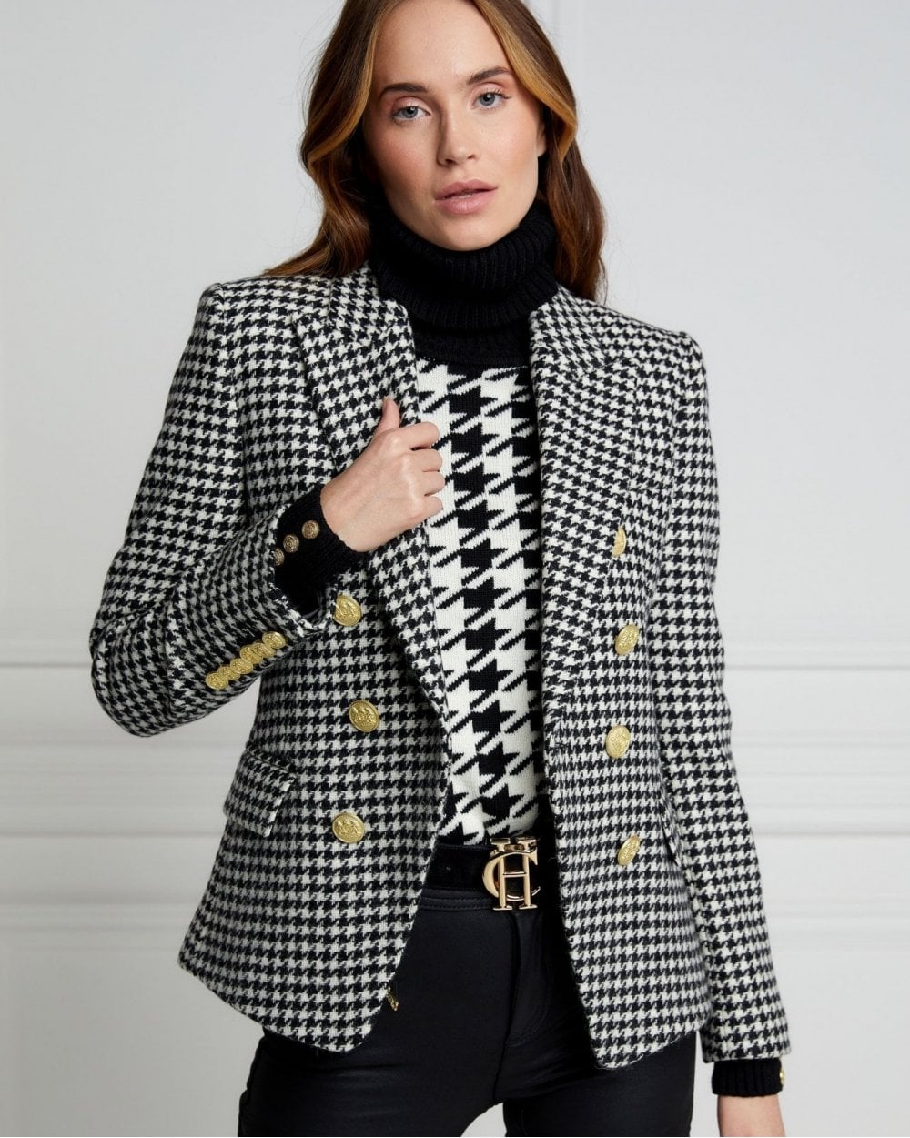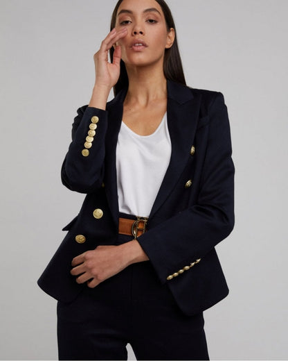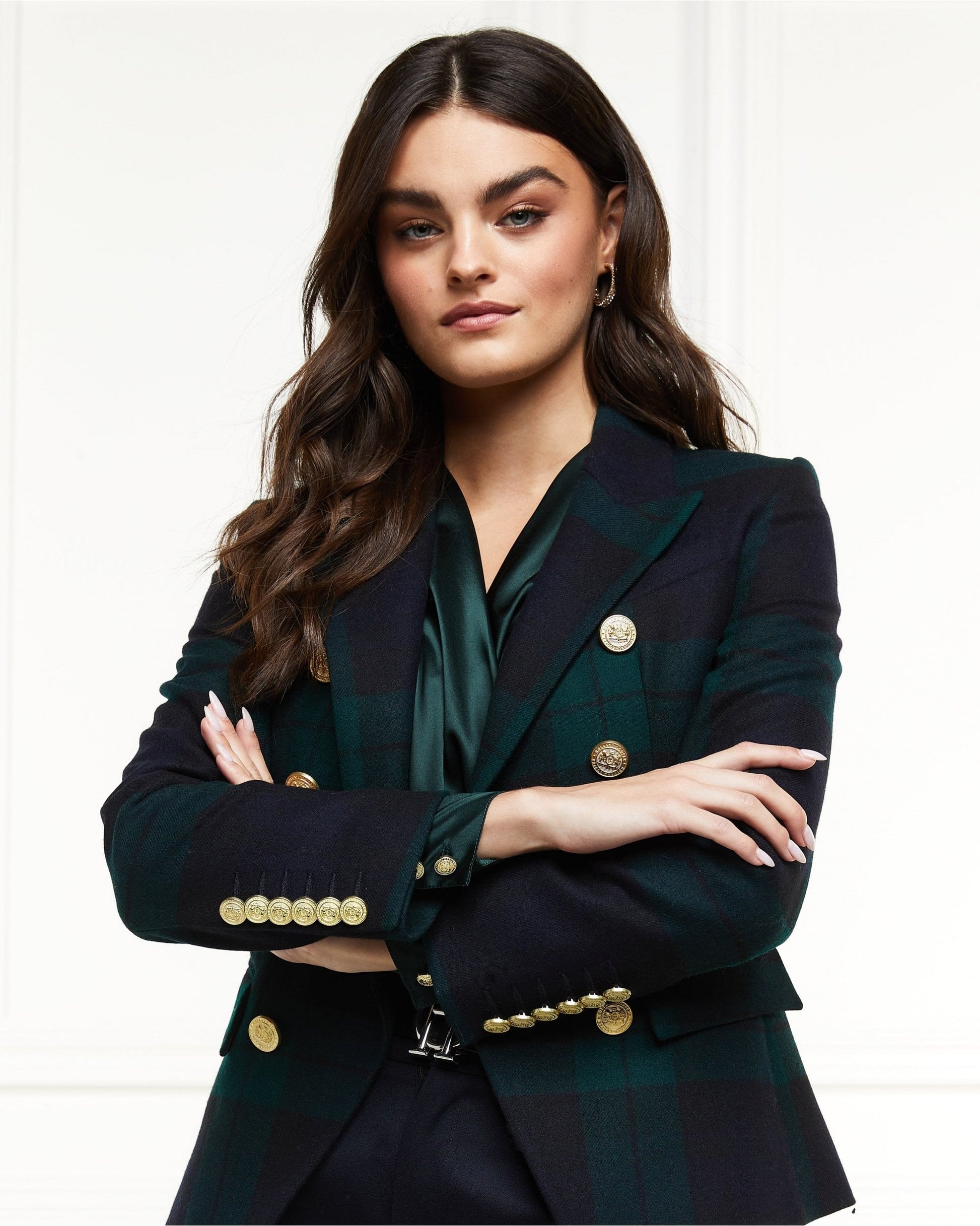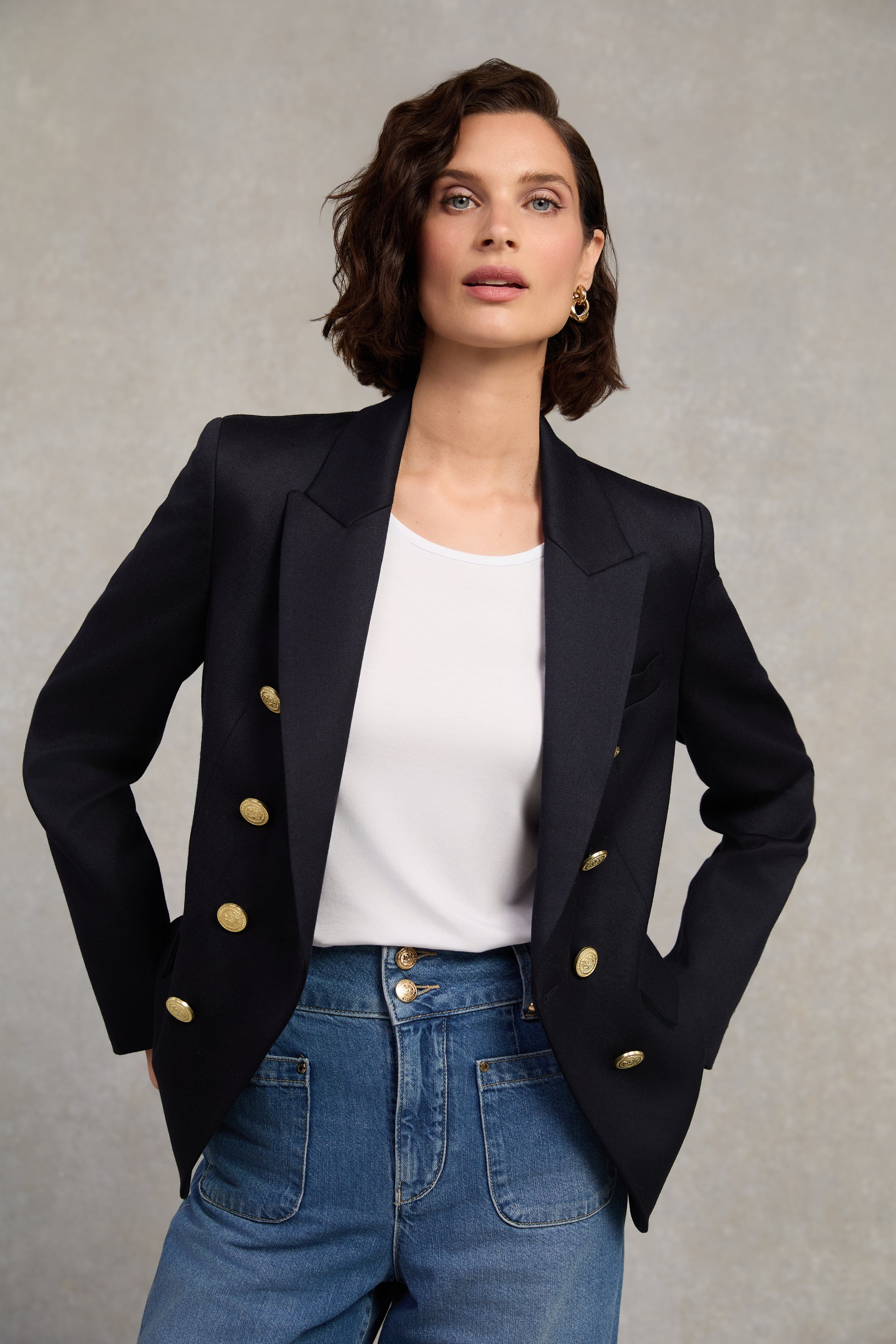 This elegant double breasted Holland Cooper Knightsbridge Blazer is a chic trans-seasonal wardrobe essential, designed to create a sharp tailored silhouette worn open or closed. Fully lined with a luxury stretch lining for extra comfort and adorned with signature Holland Cooper Gold buttons on the front and cuffs. This blazer has been hand cut and made entirely in England using wools woven in the UK.
