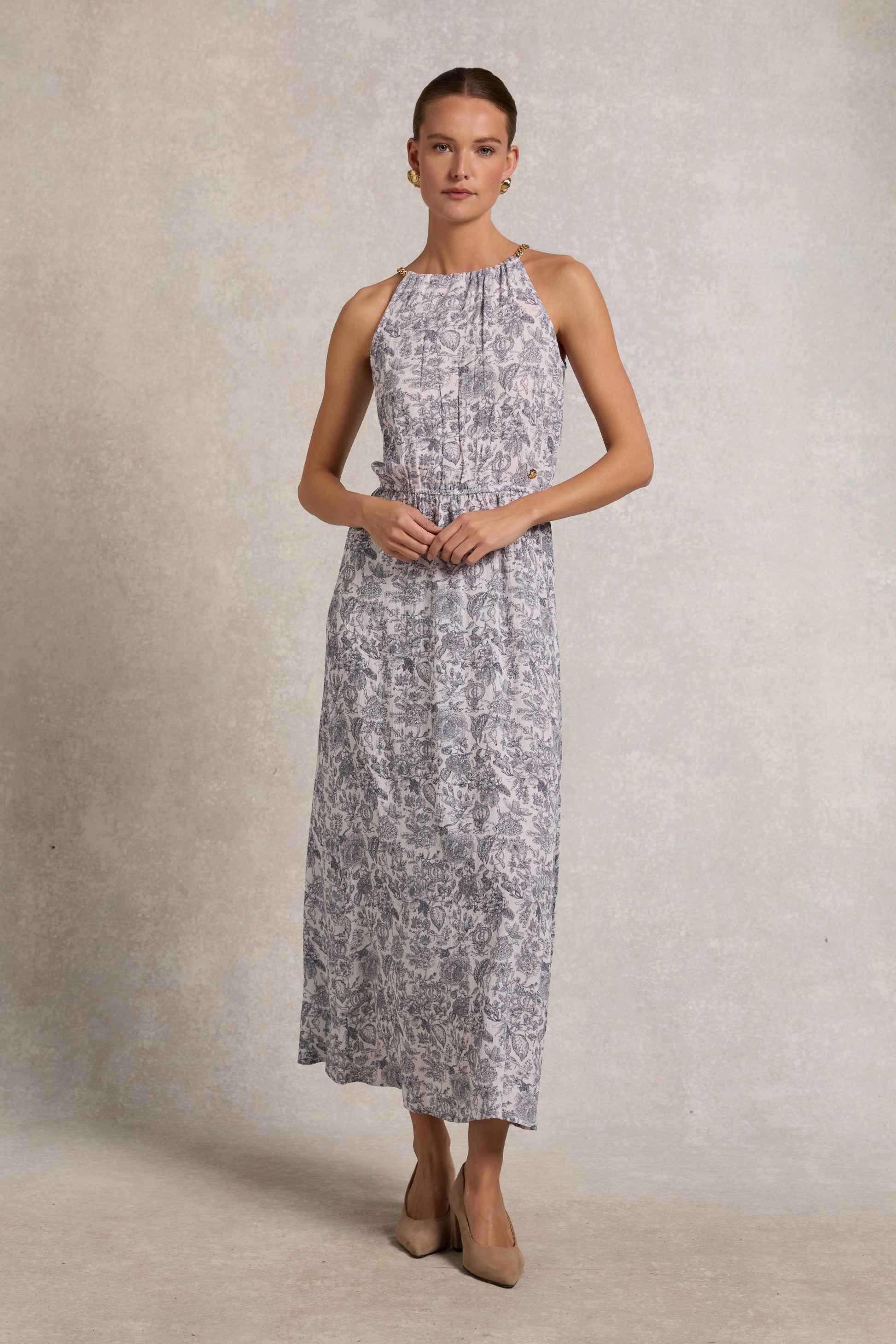 Designed with a halter neckline, this feminine dress has been created with a relaxed silhouette and floaty fit. With a cinched-in waist, the skirt bottom has a subtle side split detail.