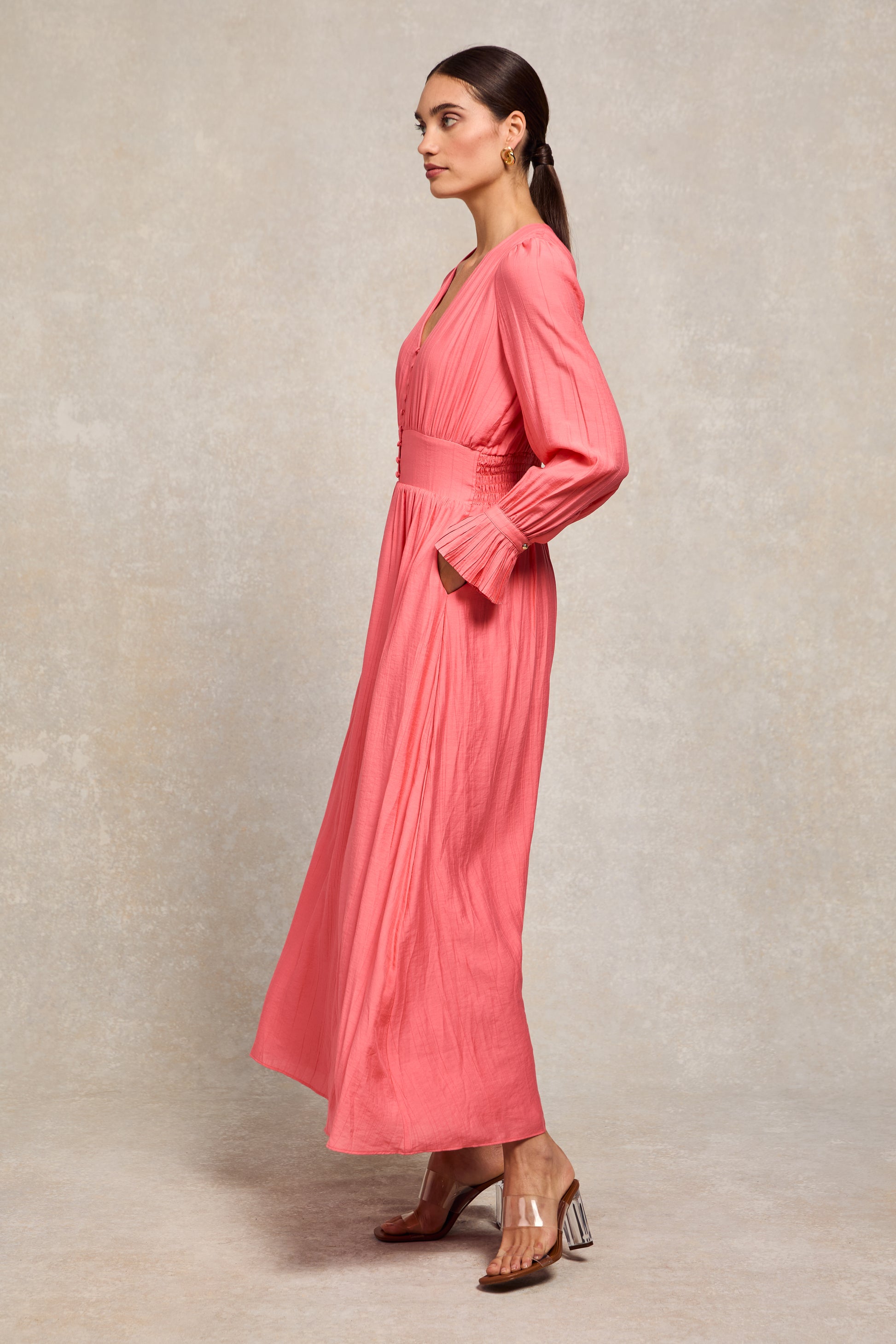 Designed with a maxi length, this dress features a modest v-neckline with self-covered buttons at the centre front for a touch of elegance. Delicate sleeve details and fluted cuffs add a subtle charm, while the elasticated shirred back panel ensures a perfect fit. Designed for convenience, this dress comes with a fully lined skirt and side-entry pockets. The signature gold hardware at the cuffs adds a hint of sophistication.