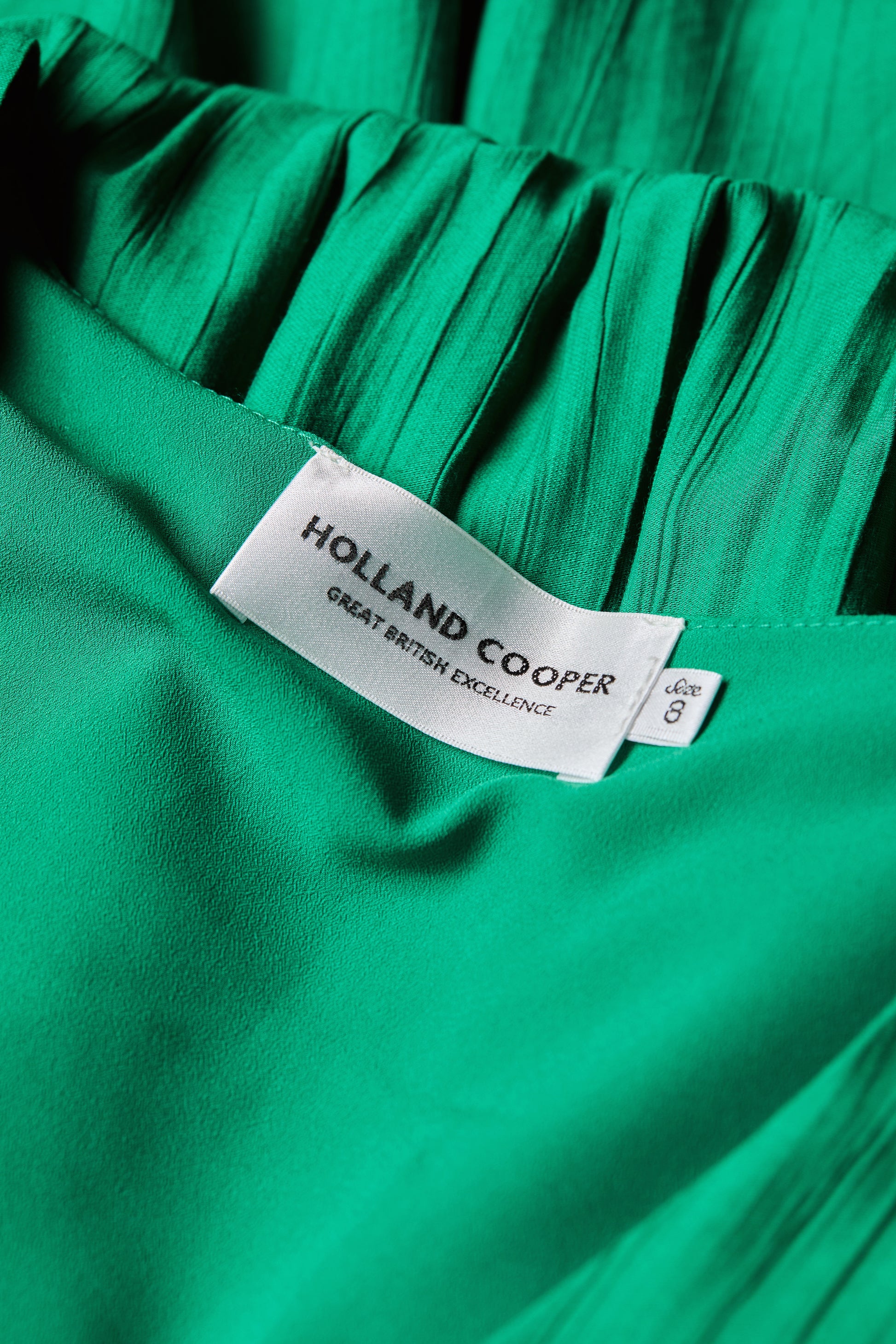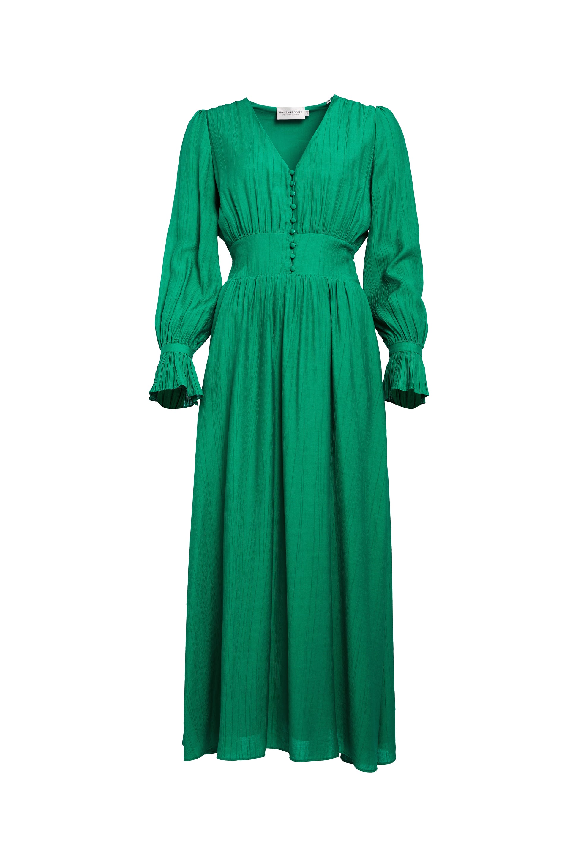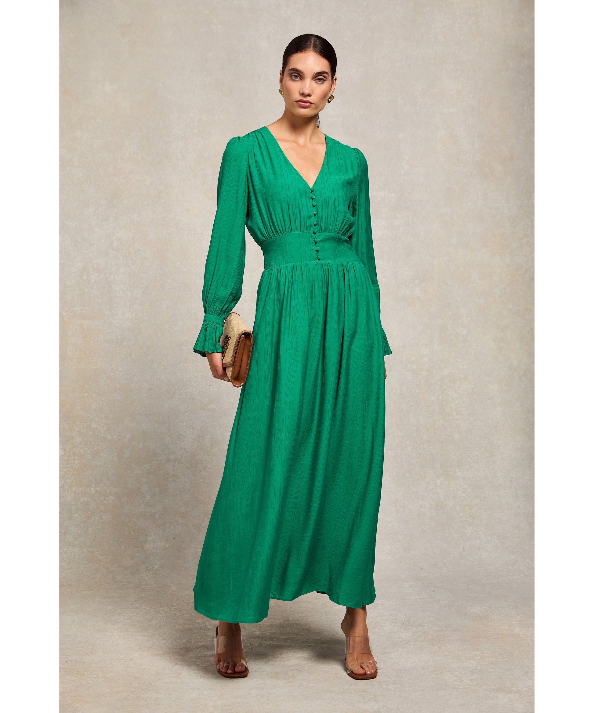 Designed with a maxi length, this dress features a modest v-neckline with self-covered buttons at the centre front for a touch of elegance. Delicate sleeve details and fluted cuffs add a subtle charm, while the elasticated shirred back panel ensures a perfect fit. Designed for convenience, this dress comes with a fully lined skirt and side-entry pockets. The signature gold hardware at the cuffs adds a hint of sophistication.
