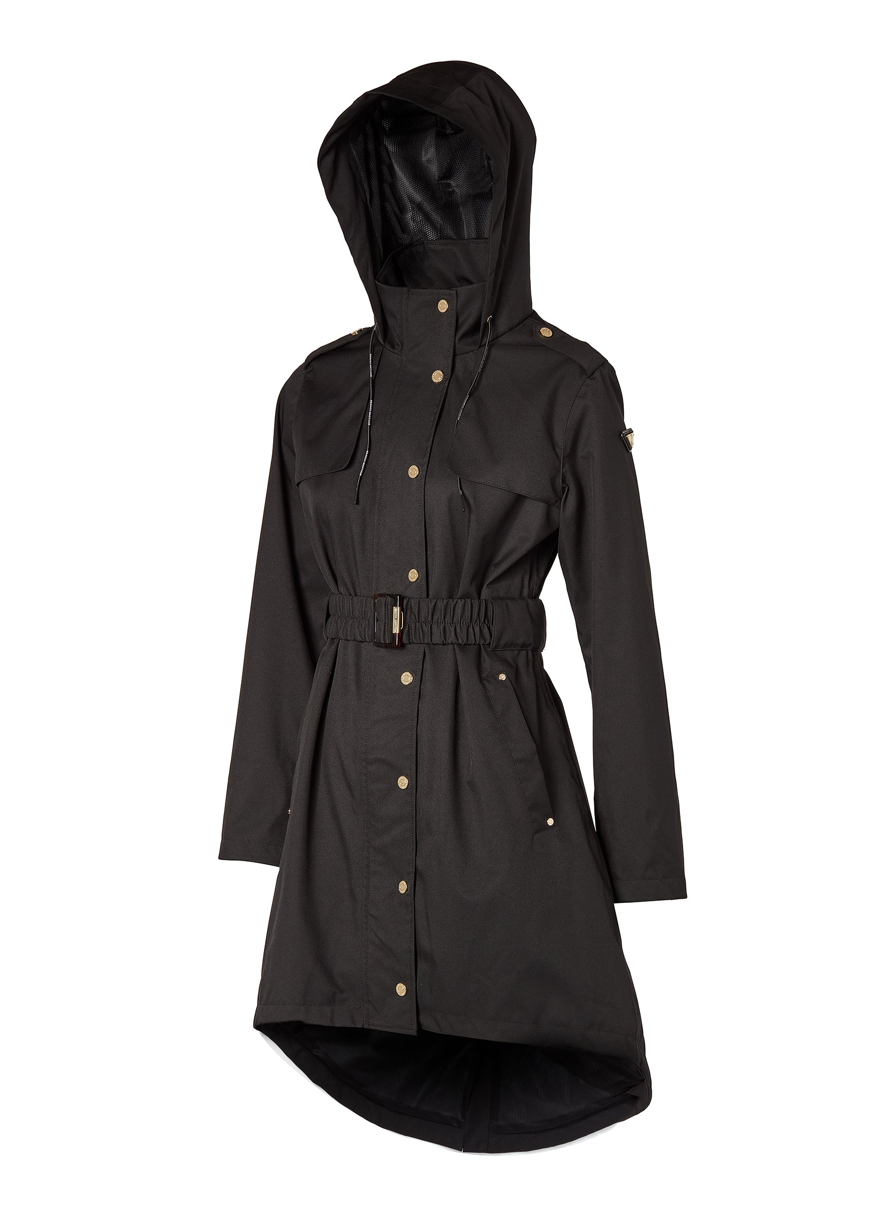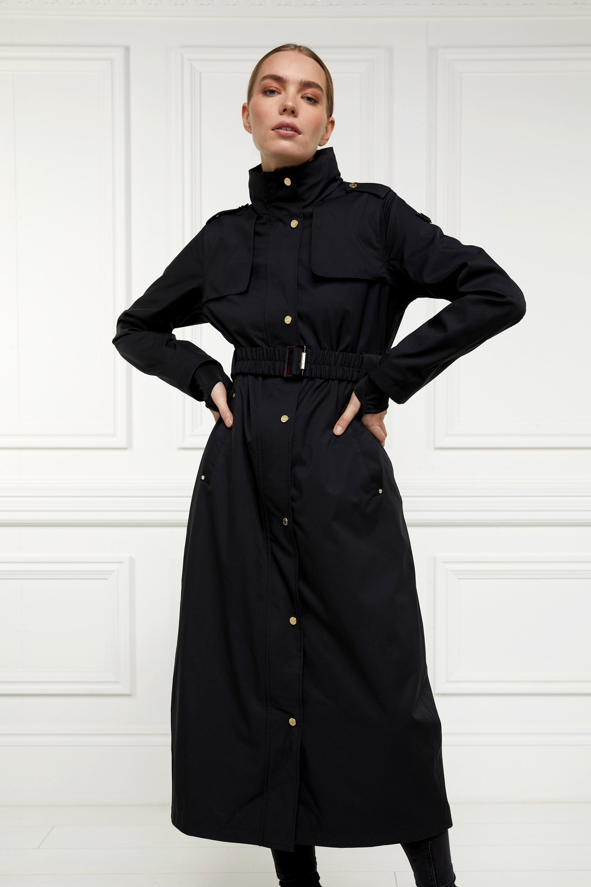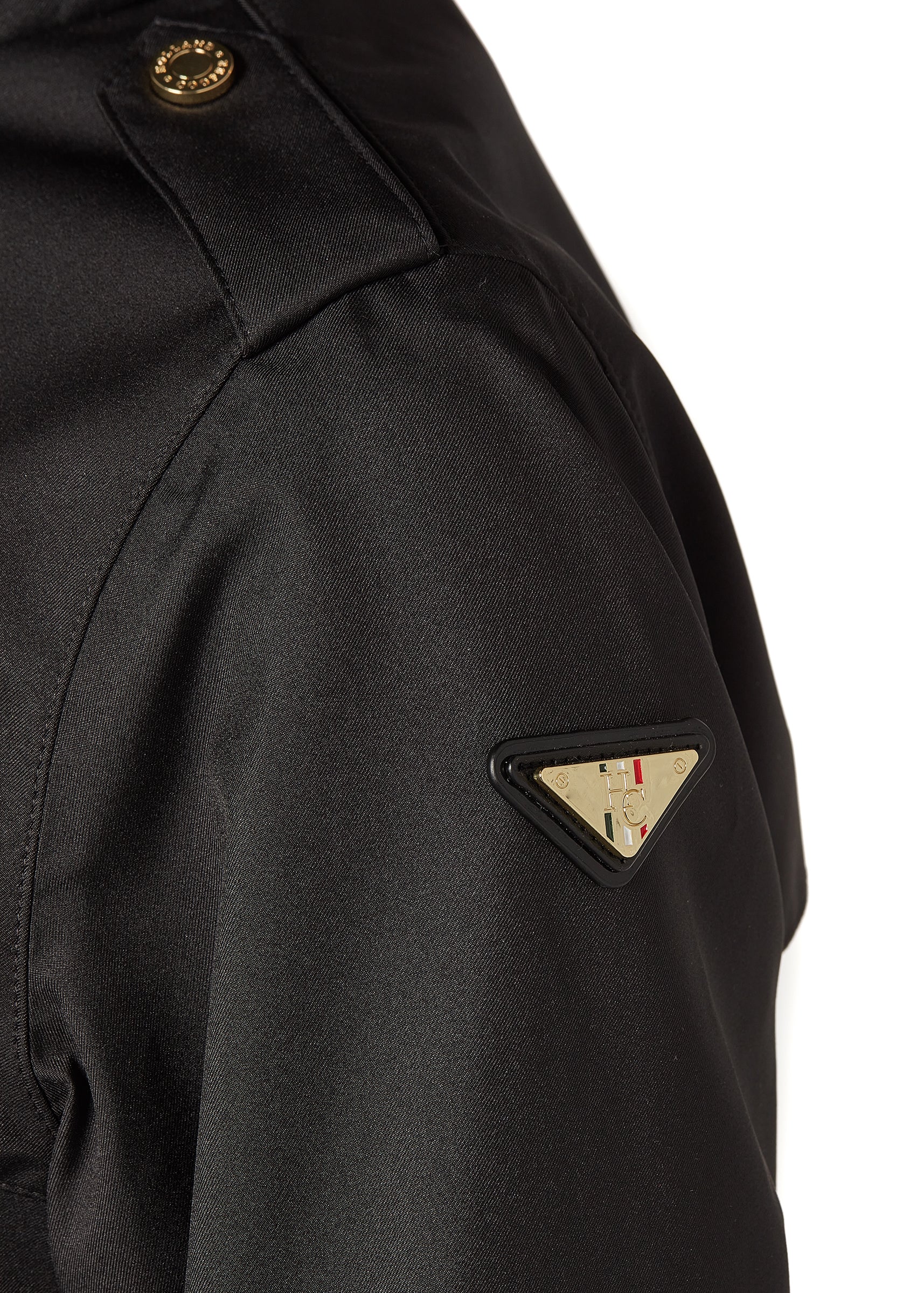 A full-length technical parka designed for both style and functionality. Crafted from high-density waterproof shell fabric, this coat ensures you stay dry and comfortable in any weather. Featuring a fabric covered elastic belt with a sophisticated tortoiseshell buckle closure. The storm plackets with signature gold snap fastenings and front yoke details add a touch of refinement, while the detachable hood offers versatility. The double strap fastening on the cuffs provides a secure fit, and the HC monogram on the back belt loop adds a signature finish.