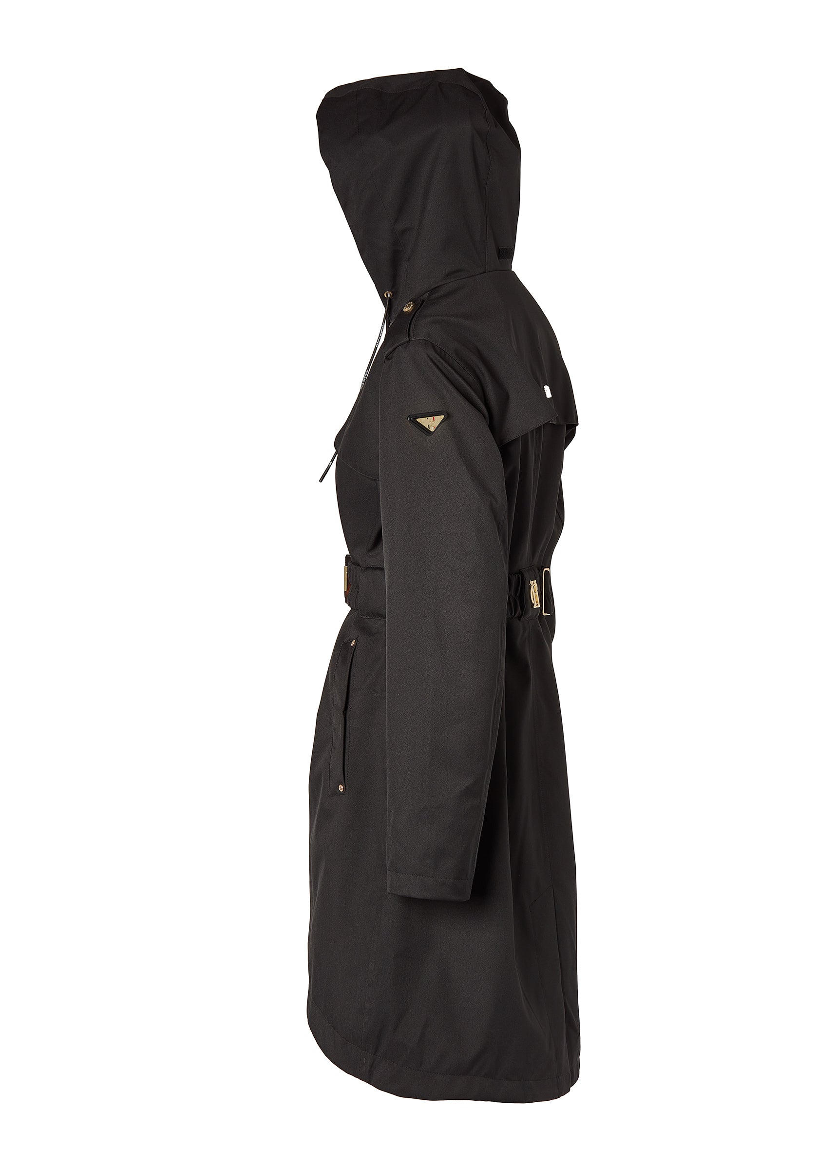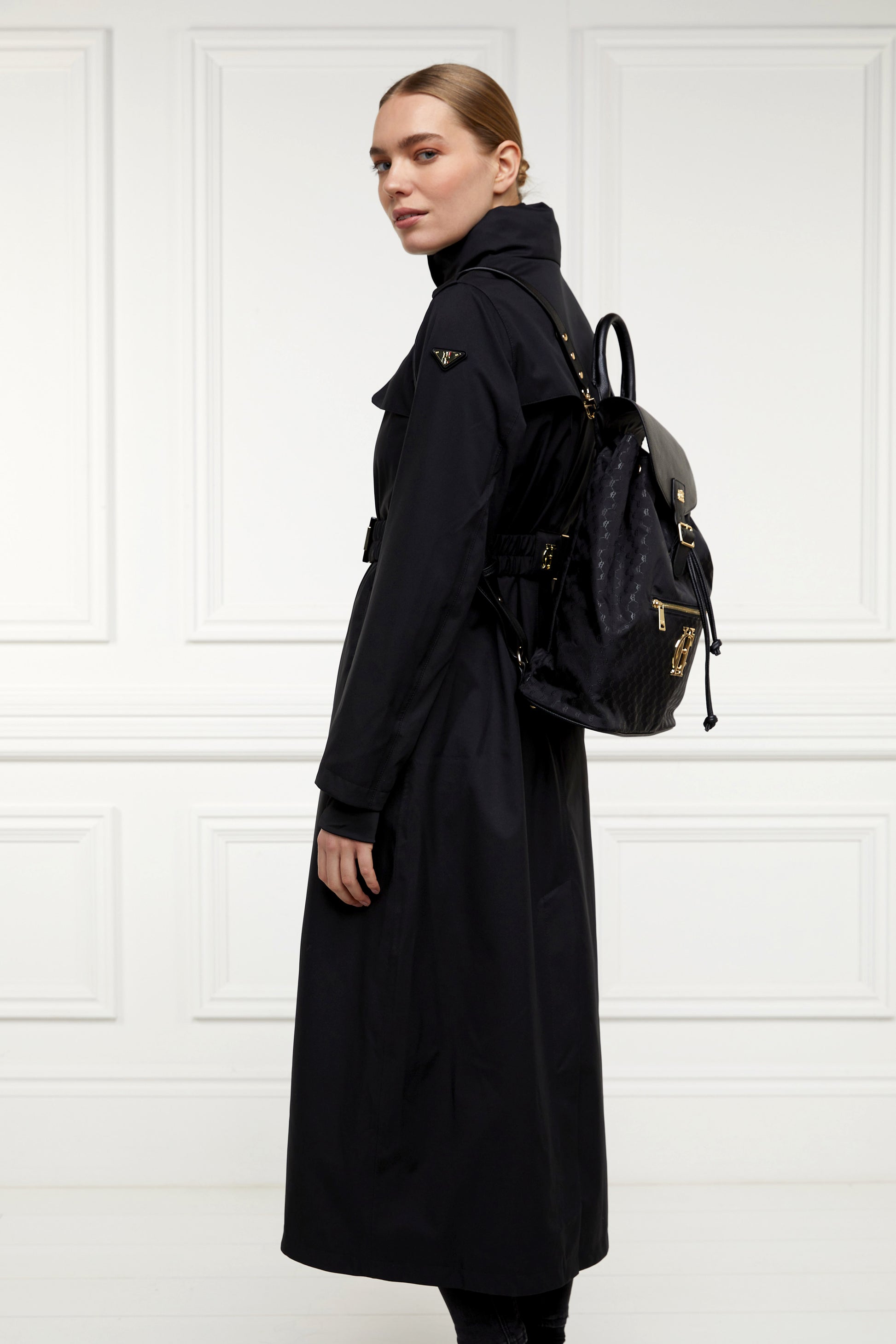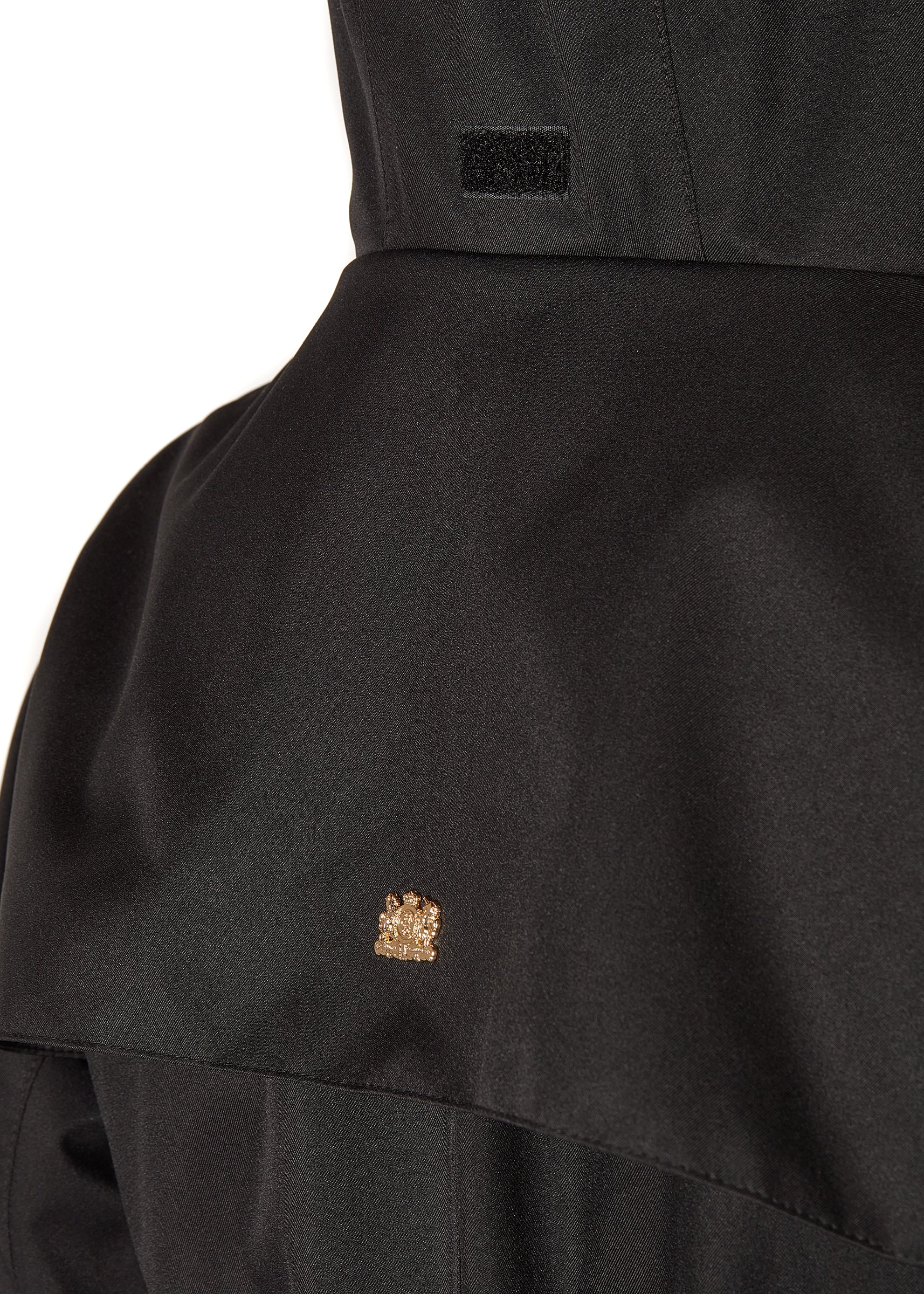 A full-length technical parka designed for both style and functionality. Crafted from high-density waterproof shell fabric, this coat ensures you stay dry and comfortable in any weather. Featuring a fabric covered elastic belt with a sophisticated tortoiseshell buckle closure. The storm plackets with signature gold snap fastenings and front yoke details add a touch of refinement, while the detachable hood offers versatility. The double strap fastening on the cuffs provides a secure fit, and the HC monogram on the back belt loop adds a signature finish.
