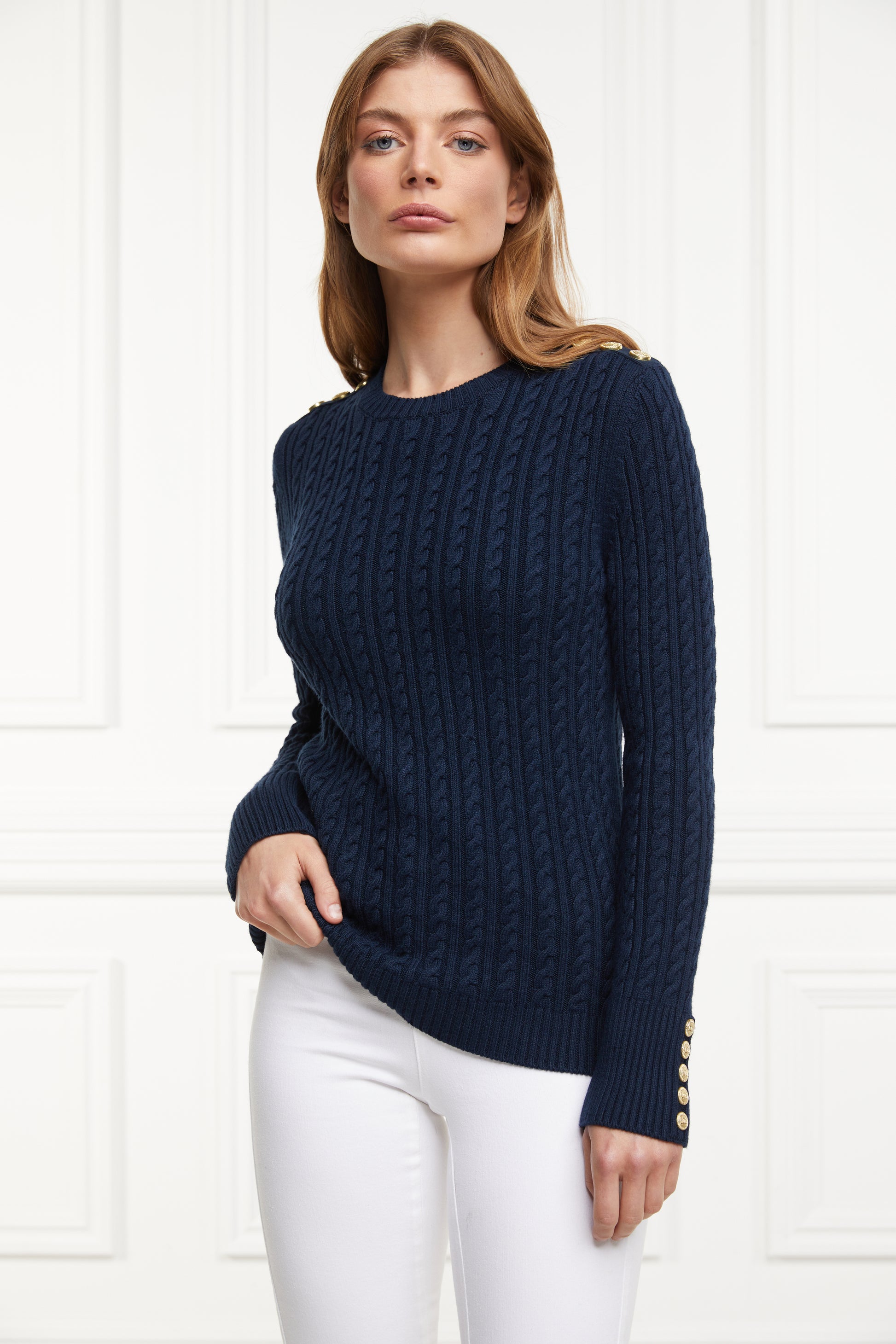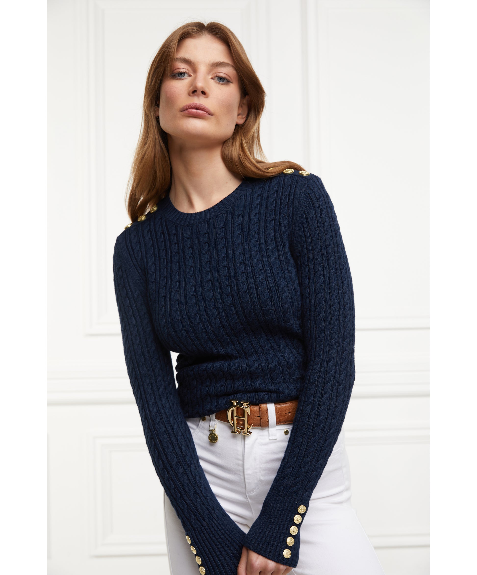 Designed with a slim fit with a classic and preppy aesthetic, this knit has been created to become an everyday essential in your wardrobe. Created with an elegant crew neck and long sleeves, this piece is intended to sit on the hip. Detailed with our signature gold rivets on the cuffs.