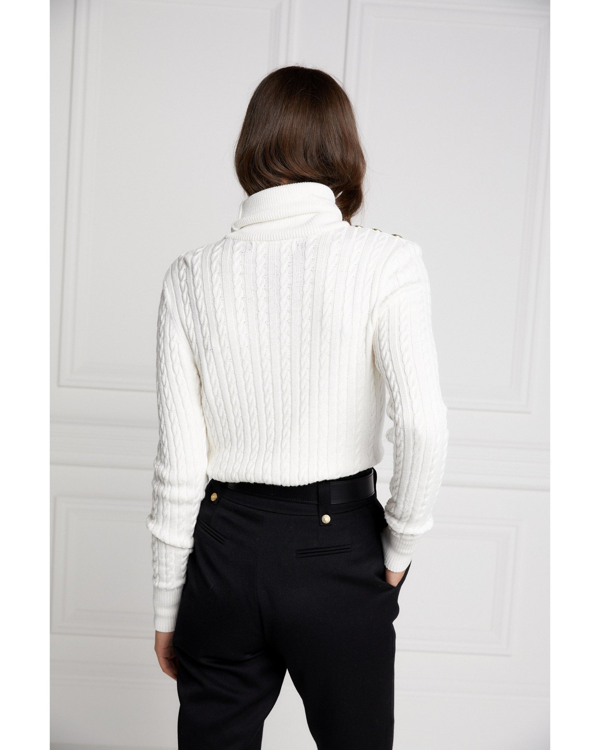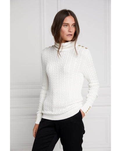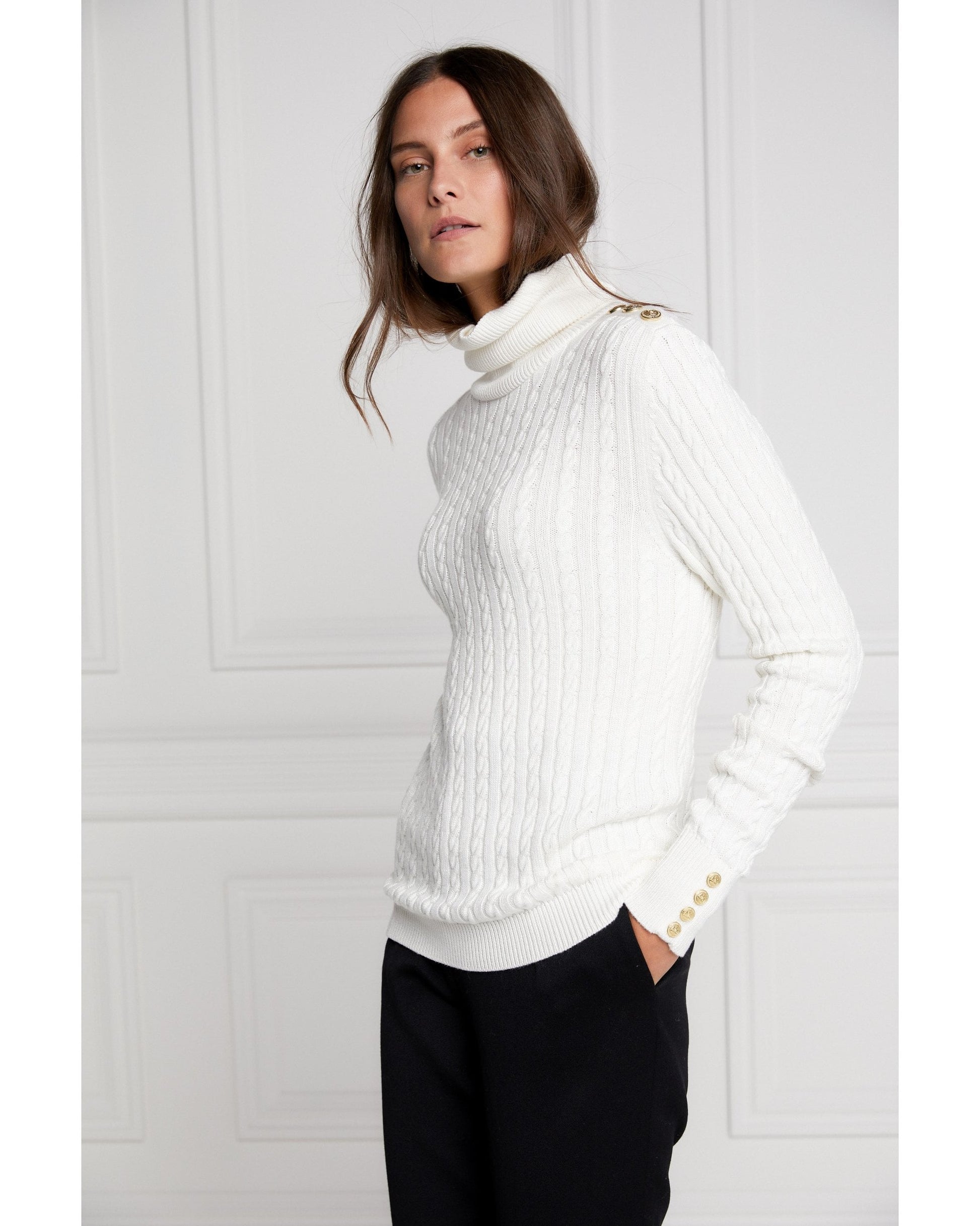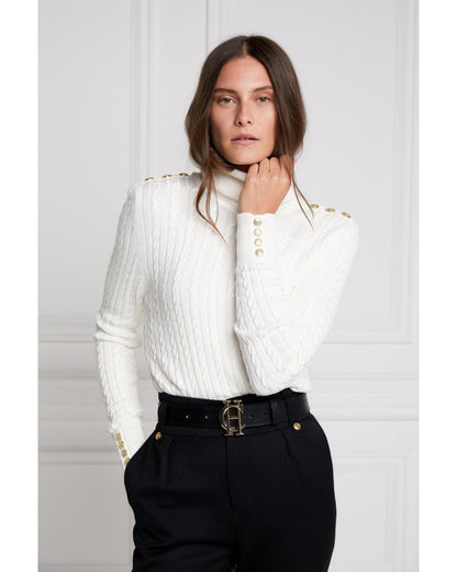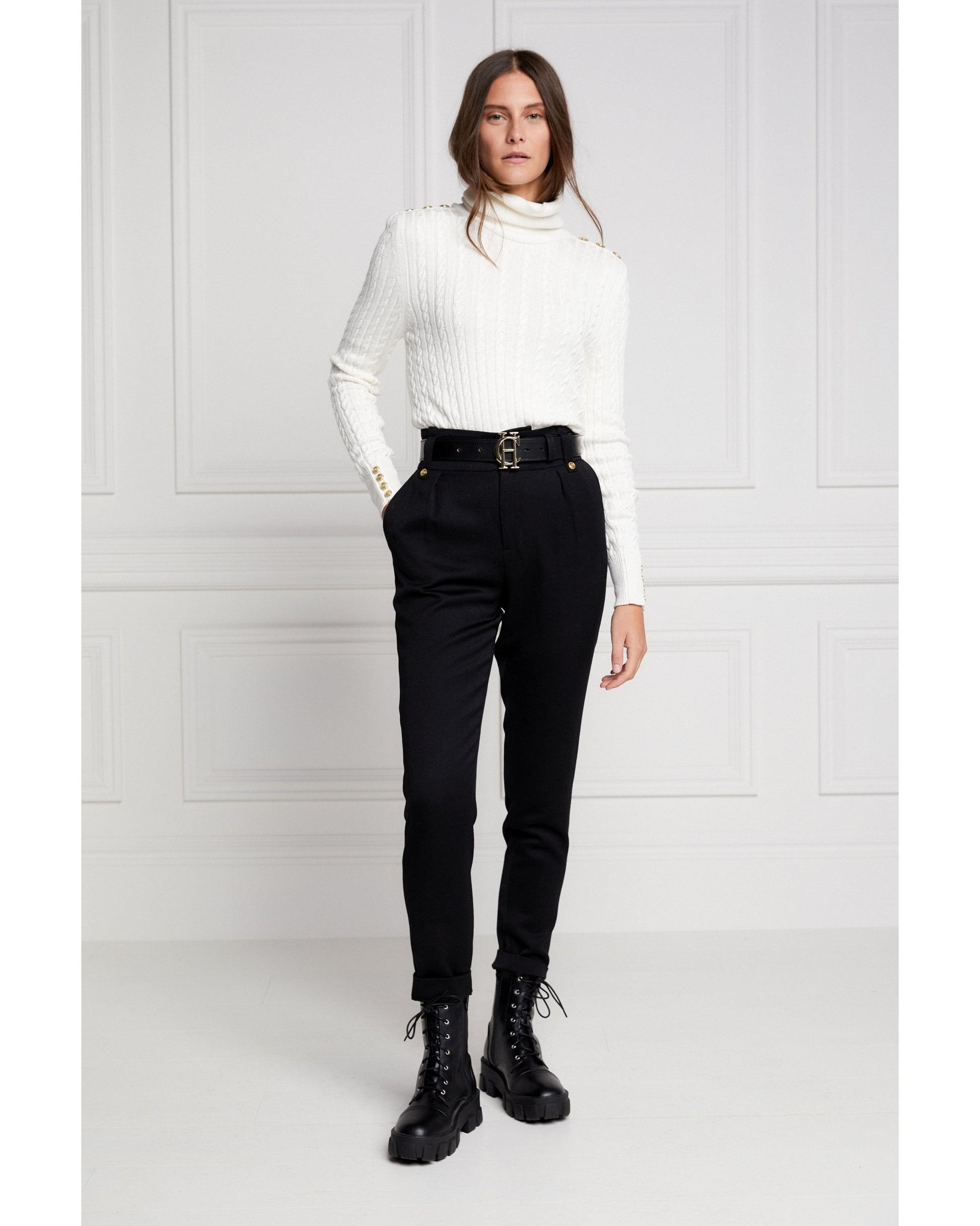 Our much-loved Portland knit has been updated to a slimmer and lighter-weight version. Designed with a slim silhouette and relaxed roll neck, this lightweight cable knit jumper has been curated from a super-soft yarn. With iconic HC hardware on both the cuff and shoulders, this knit wears perfectly tucked into our jodhpur jeans.