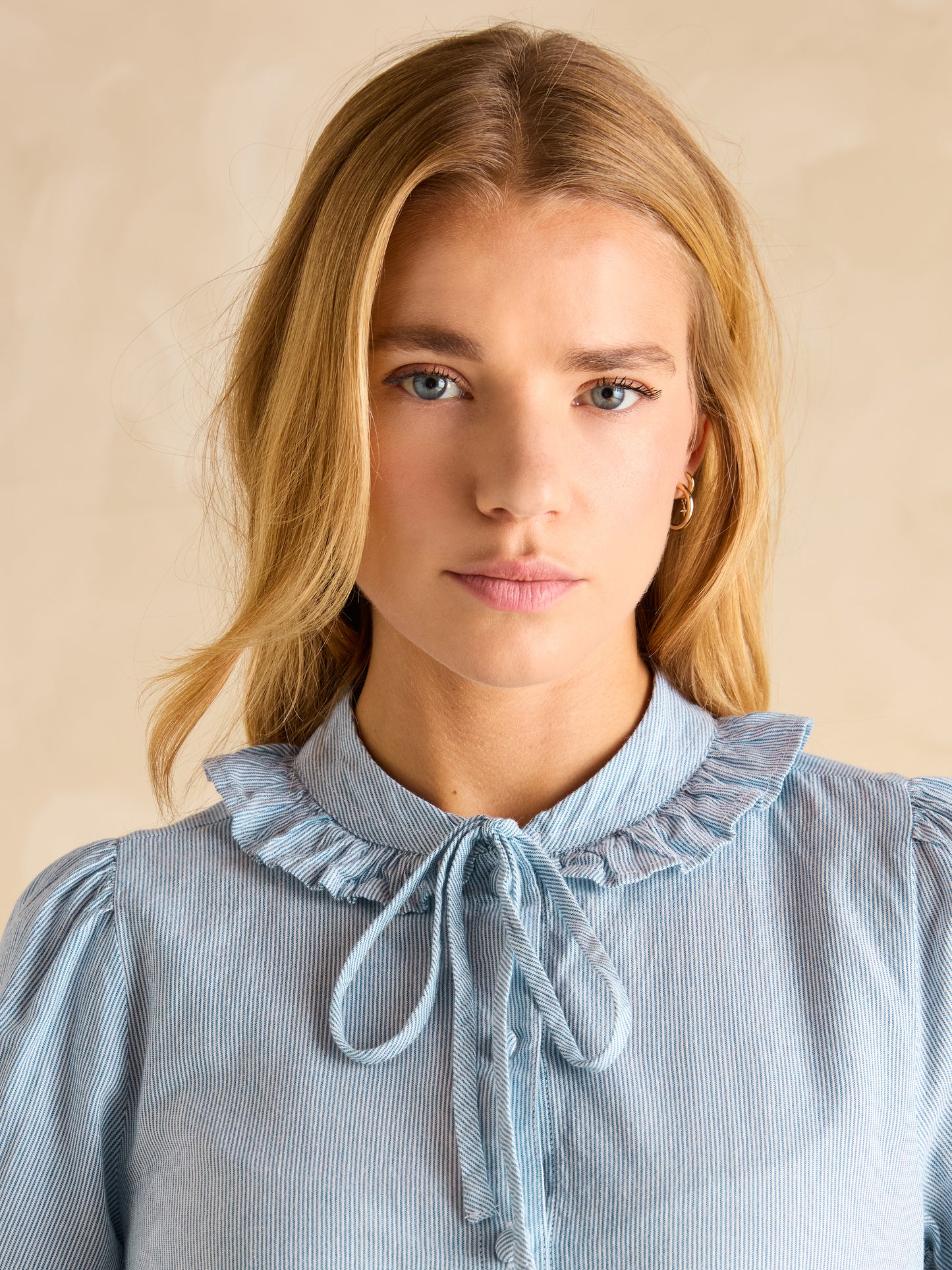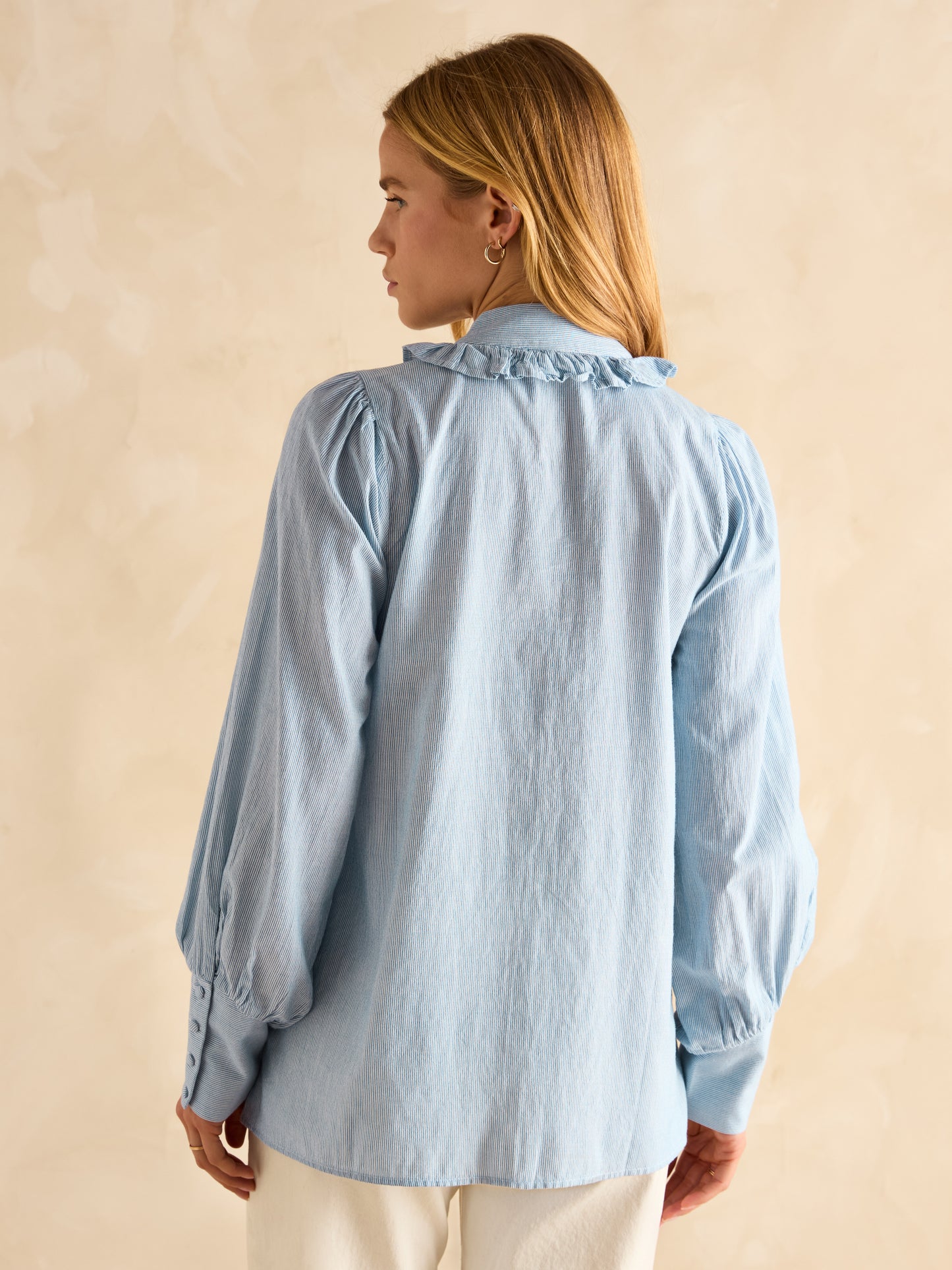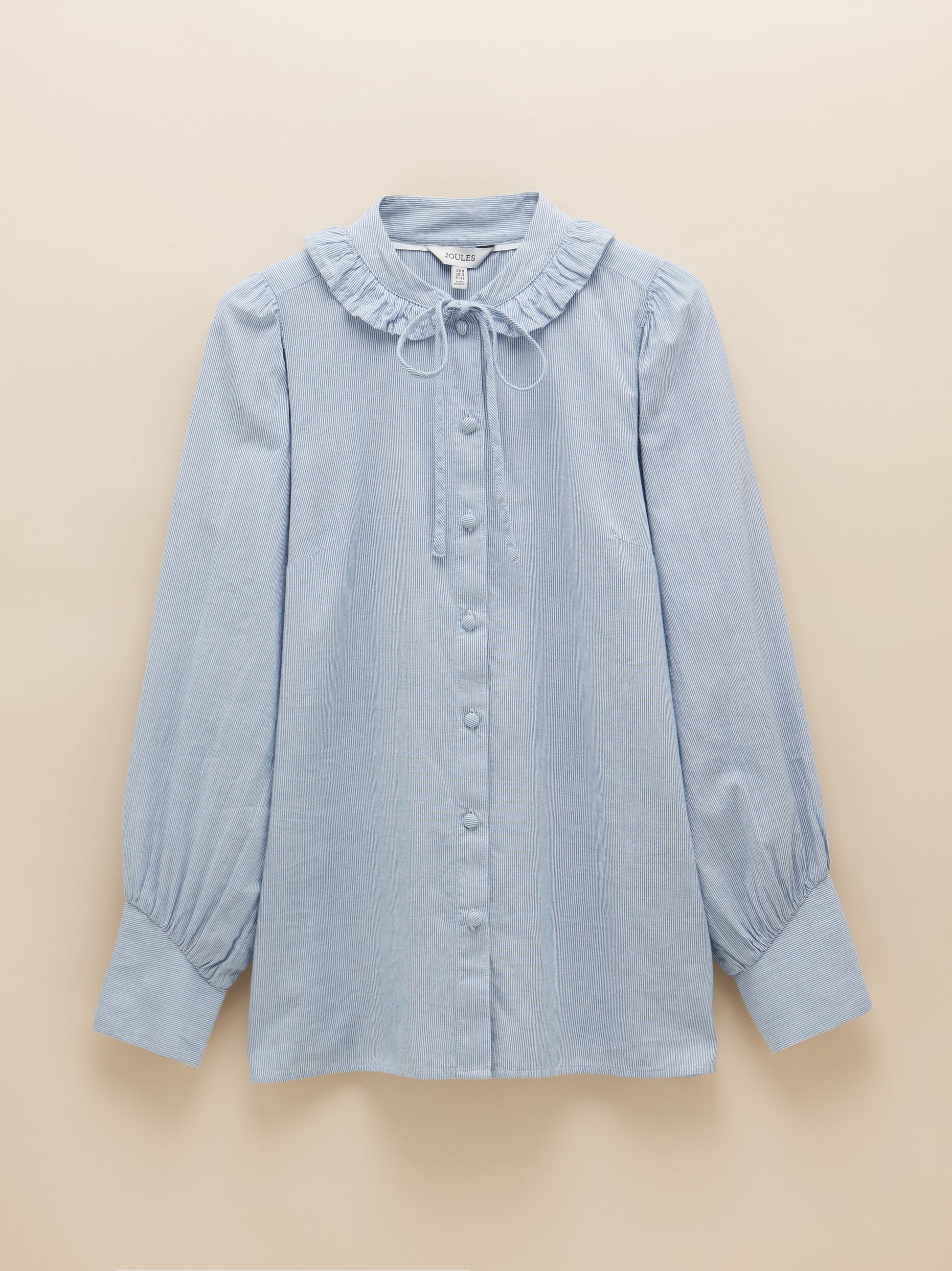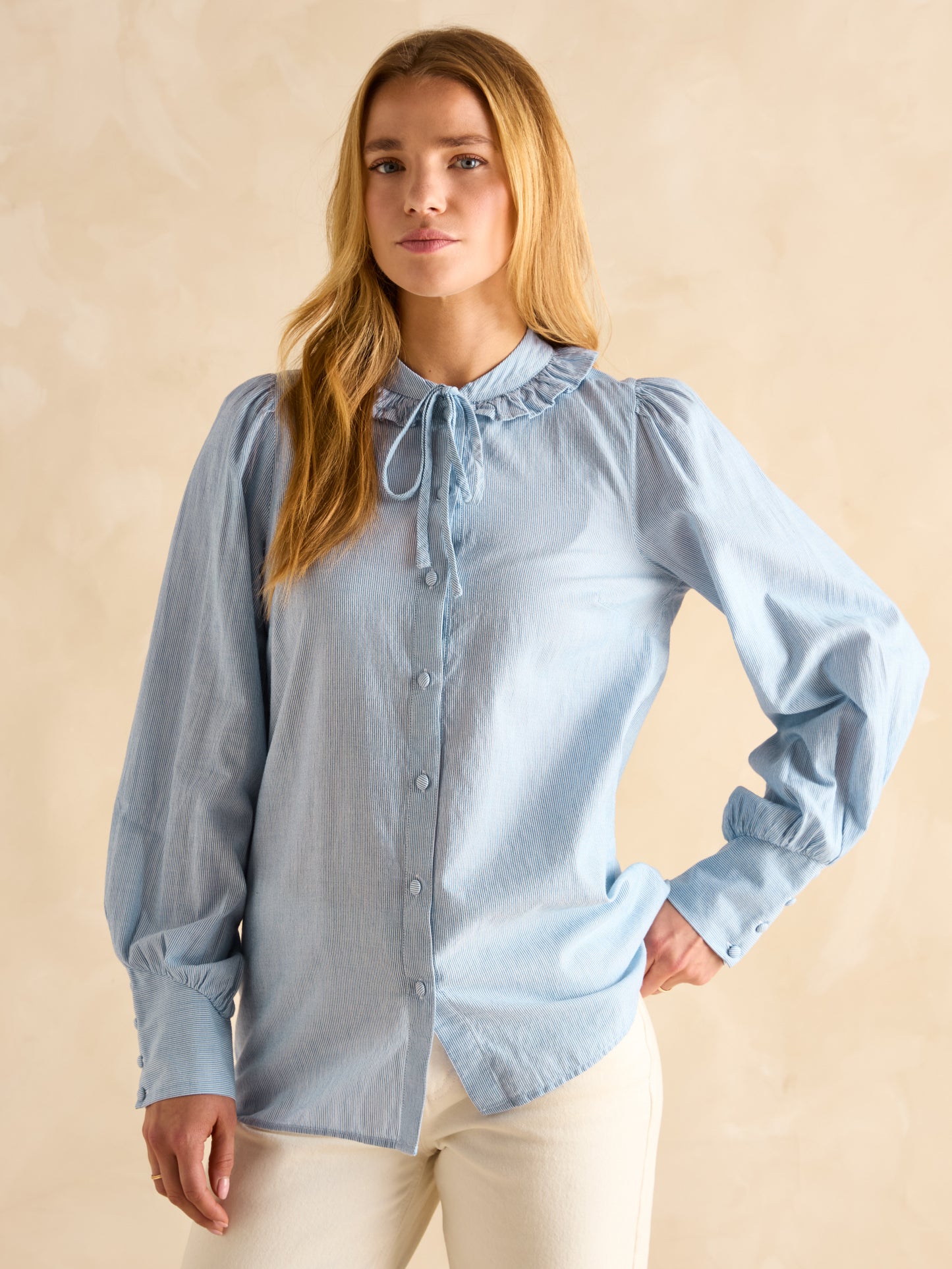 Elegant and elevated, the Harper blouse is a piece your wardrobe needs. It's cut from quality 100% cotton and will move from one season to the next in style. The frilled collar with a tie neck detail makes a statement when worn alone or layered under a knit or vest during the cooler months. A curved hem means it can be worn un-tucked and still look put-together, while fabric covered kissing buttons to the cuffs adds a touch of vintage styling.